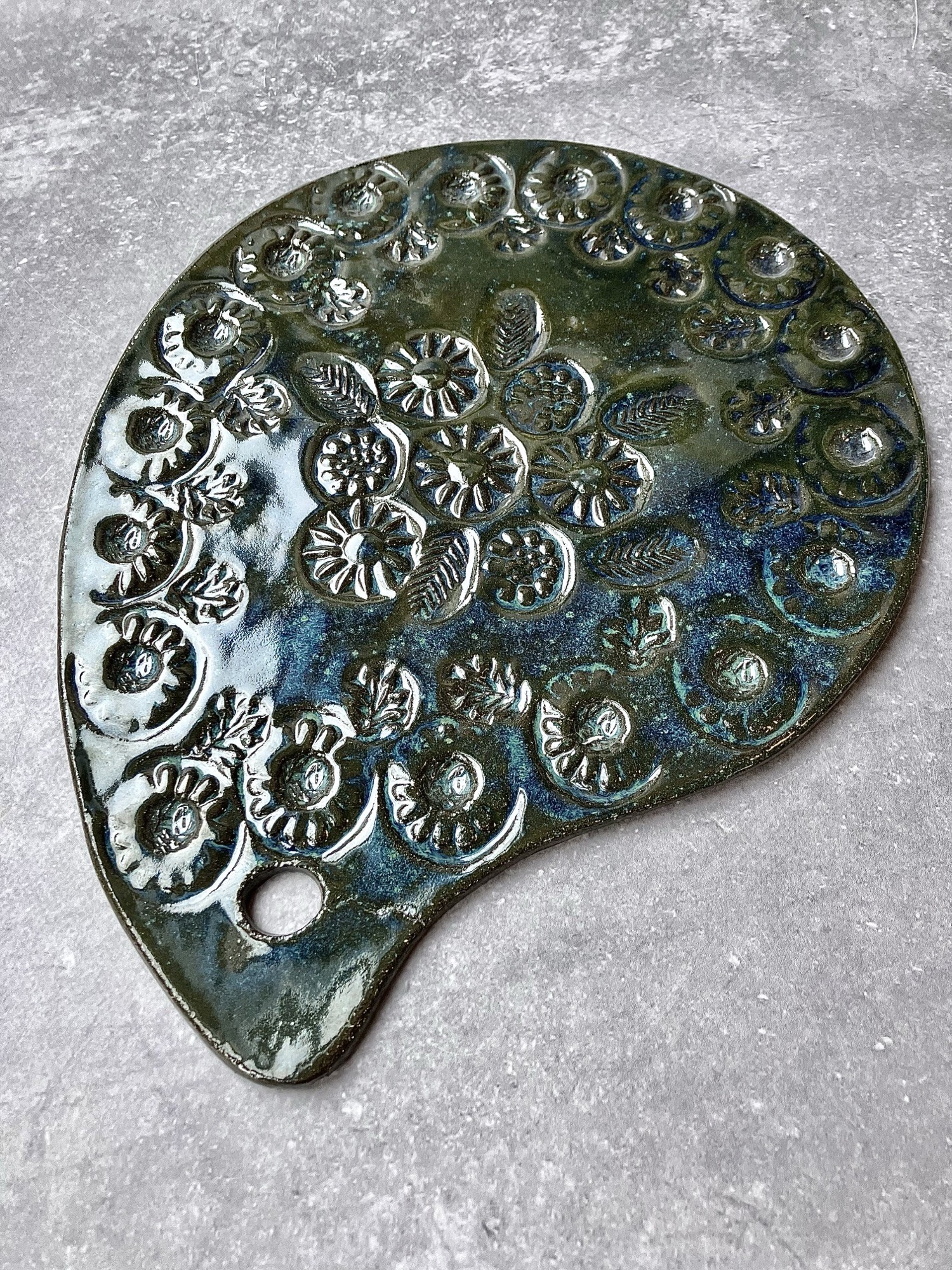 Ręcznie wykonana deska ceramiczna o organicznym, nieregularnym kształcie. inspirowanym paletą malarską. Powierzchnia zdobiona jest bogatym reliefem roślinnym- motywami kwiatów, liści i dekoracyjnych ornamentów, które tworzą harmonijną, rytmiczną kompozycję.