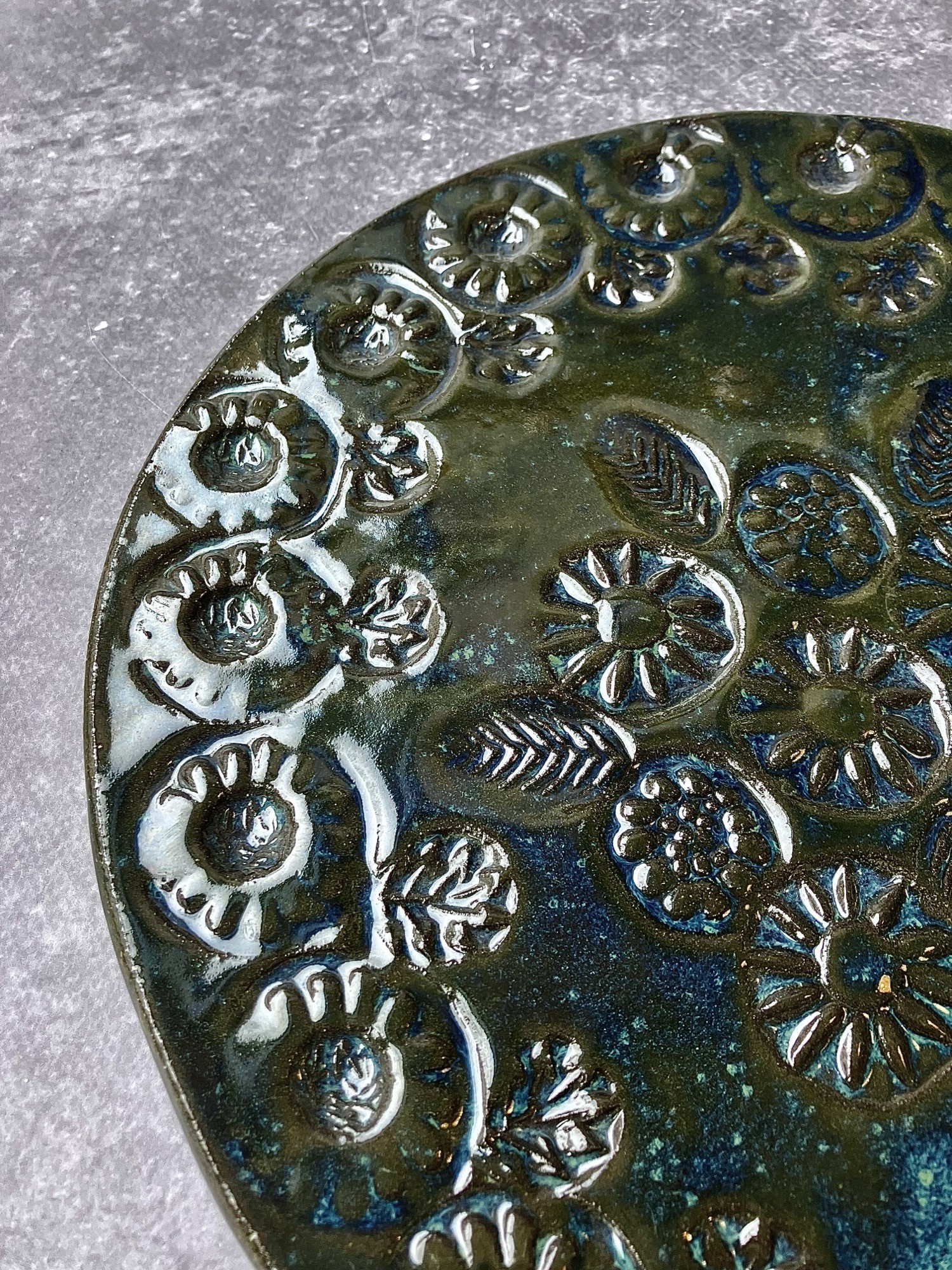 Deska pokryta jest szkliwem o głębokim wielowymiarowym kolorze, w którym przenikają się odcienie zieleni i granatu. Szkliwo pięknie reaguje ze światłem, podkreślają fakturę i rękodzielniczy charakter przedmiotu.