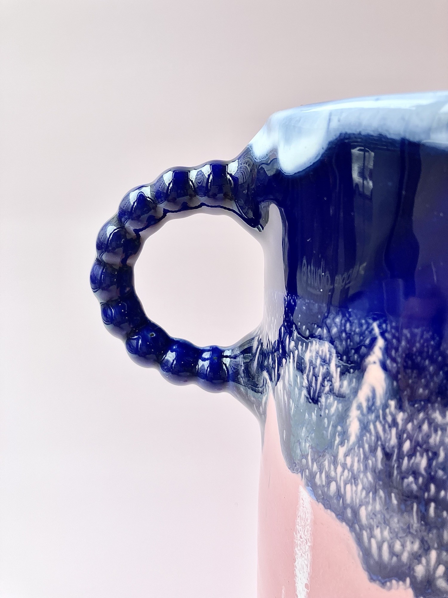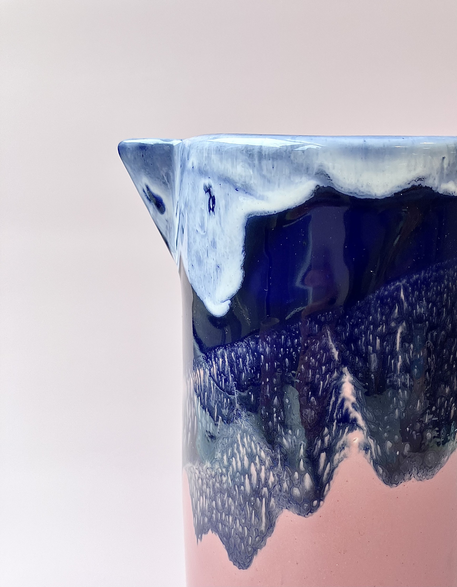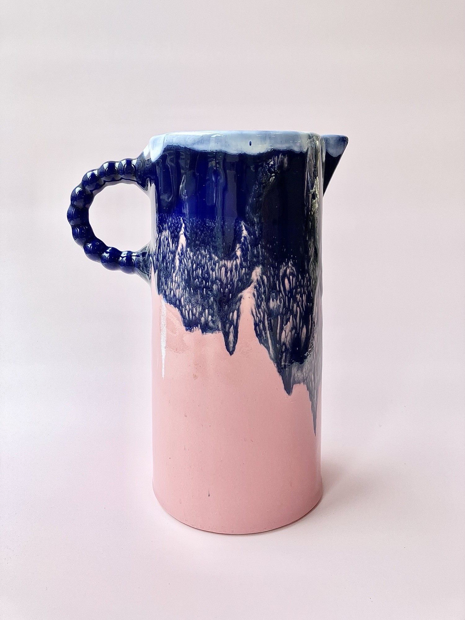 Ten unikatowy dzbanek /karafka/ to połączenie elegancji i nowoczesnej formy z artystycznym wyrazem. Wykonany z ceramiki szkliwionej, zachwyca kontrastowym zestawieniem kolorów:  pastelowego różu w dolnej części oraz dynamicznie spływającego, głębokiego granatu z akcentami bieli u góry. Szkliwo tworzy organiczne, nieregularne wzory przypominające górskie krajobrazy lub fale oceanu.