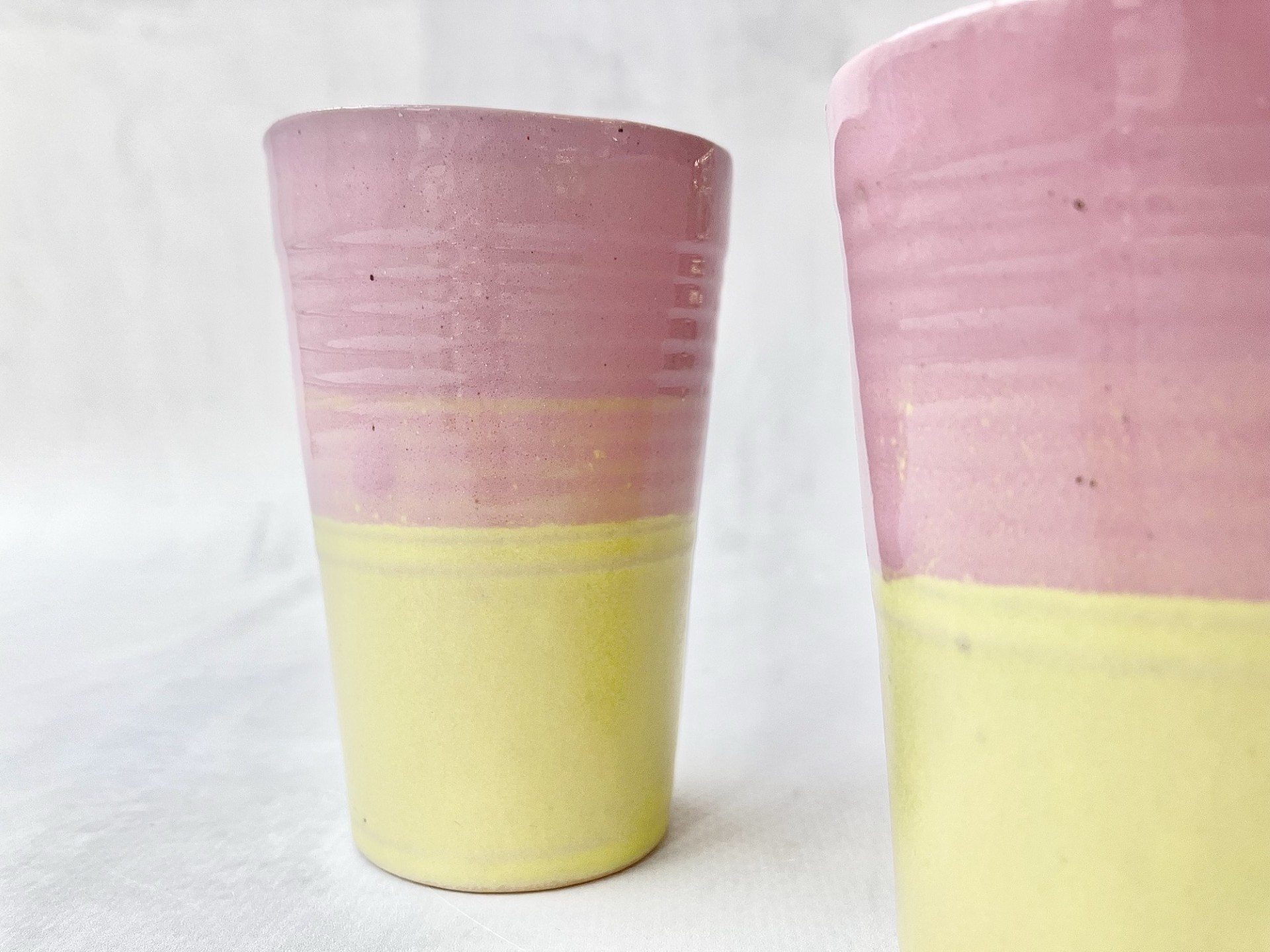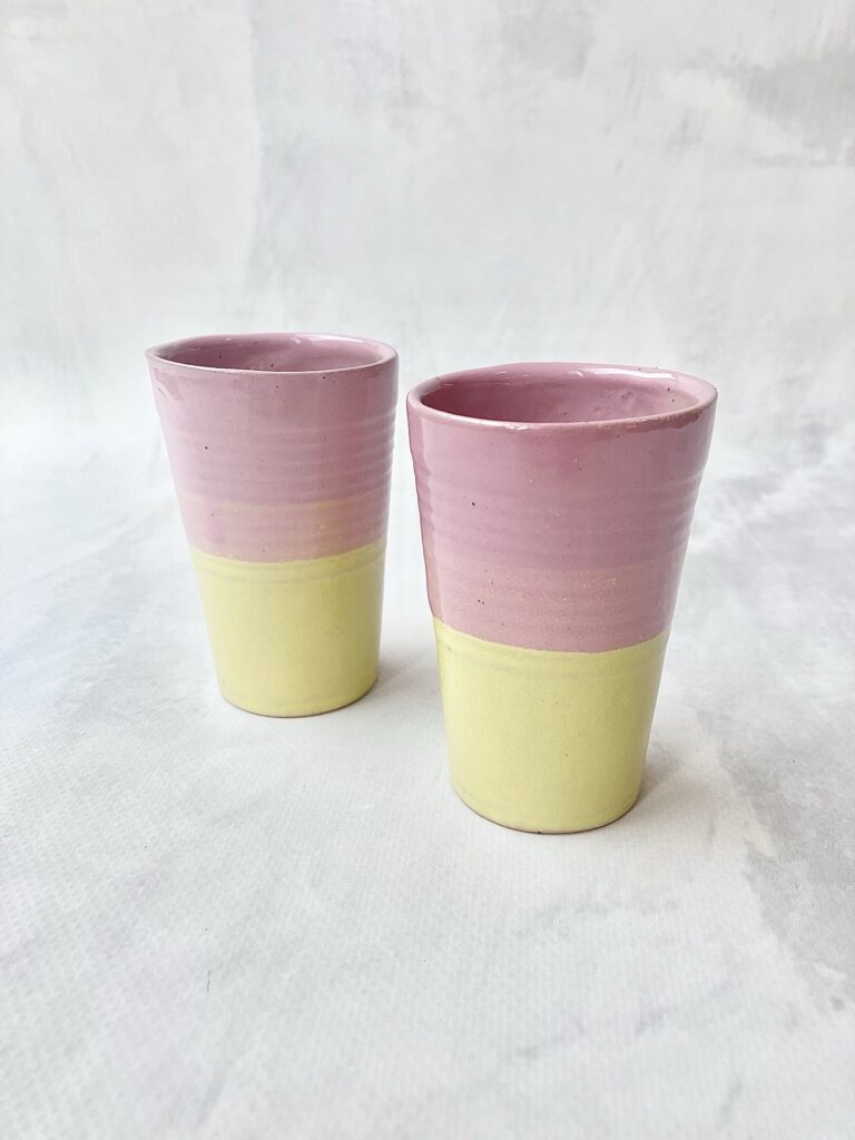 Ręcznie wykonany kieliszek do espresso z ceramiki, który łączy funkcjonalność z subtelną estetyką. Delikatne, pastelowe przejście kolorów- od ciepłego, pudrowego różu u góry po miękką, matową żółć u dołu- nadaje mu lekkości i unikatowego charakteru. Każdy egzemplarz jest niepowtarzalny, z widocznymi śladami ręcznego formowania i szkliwienia.