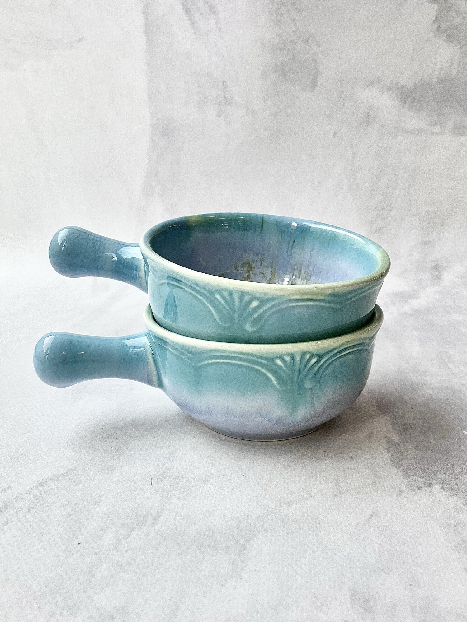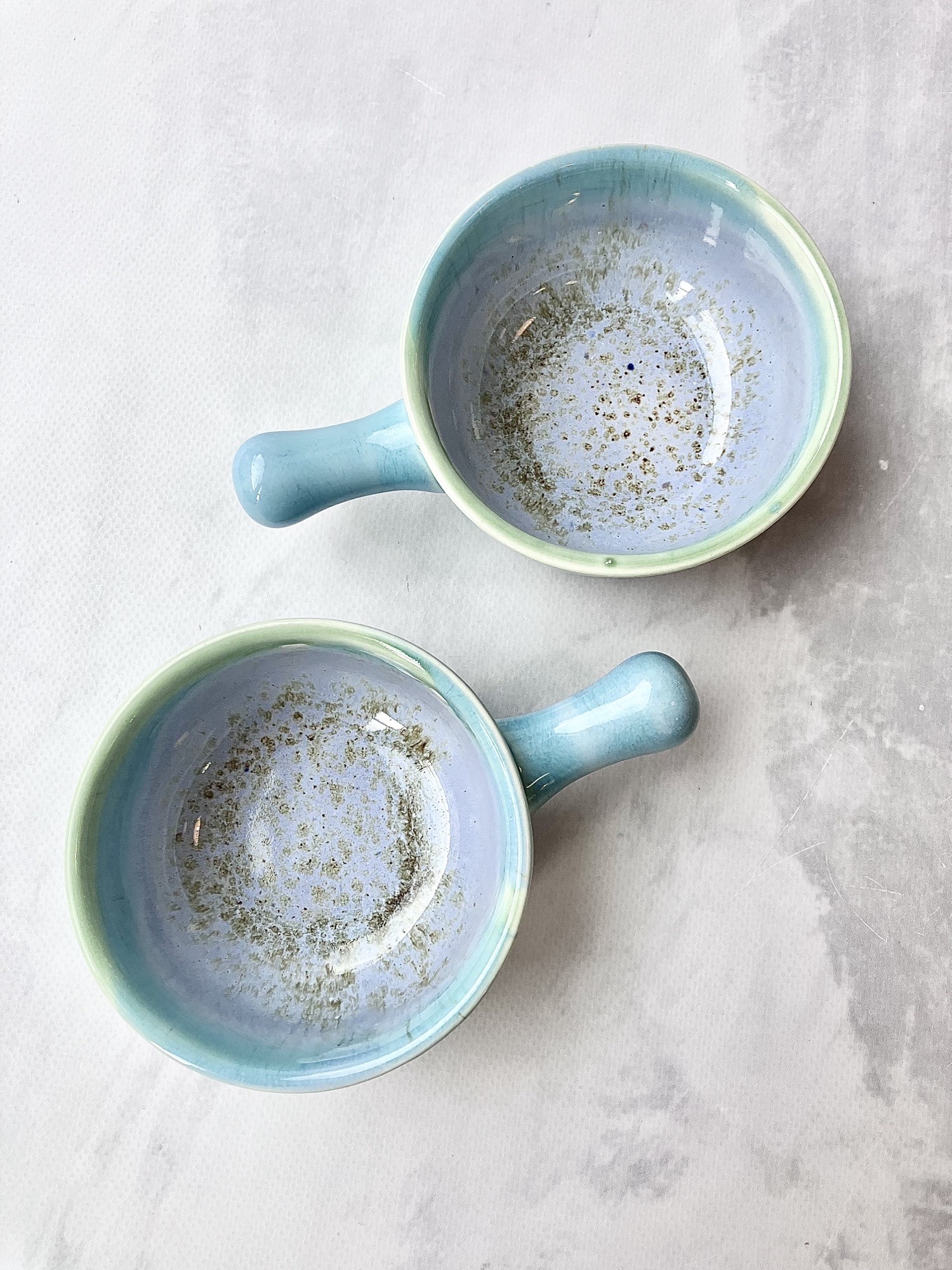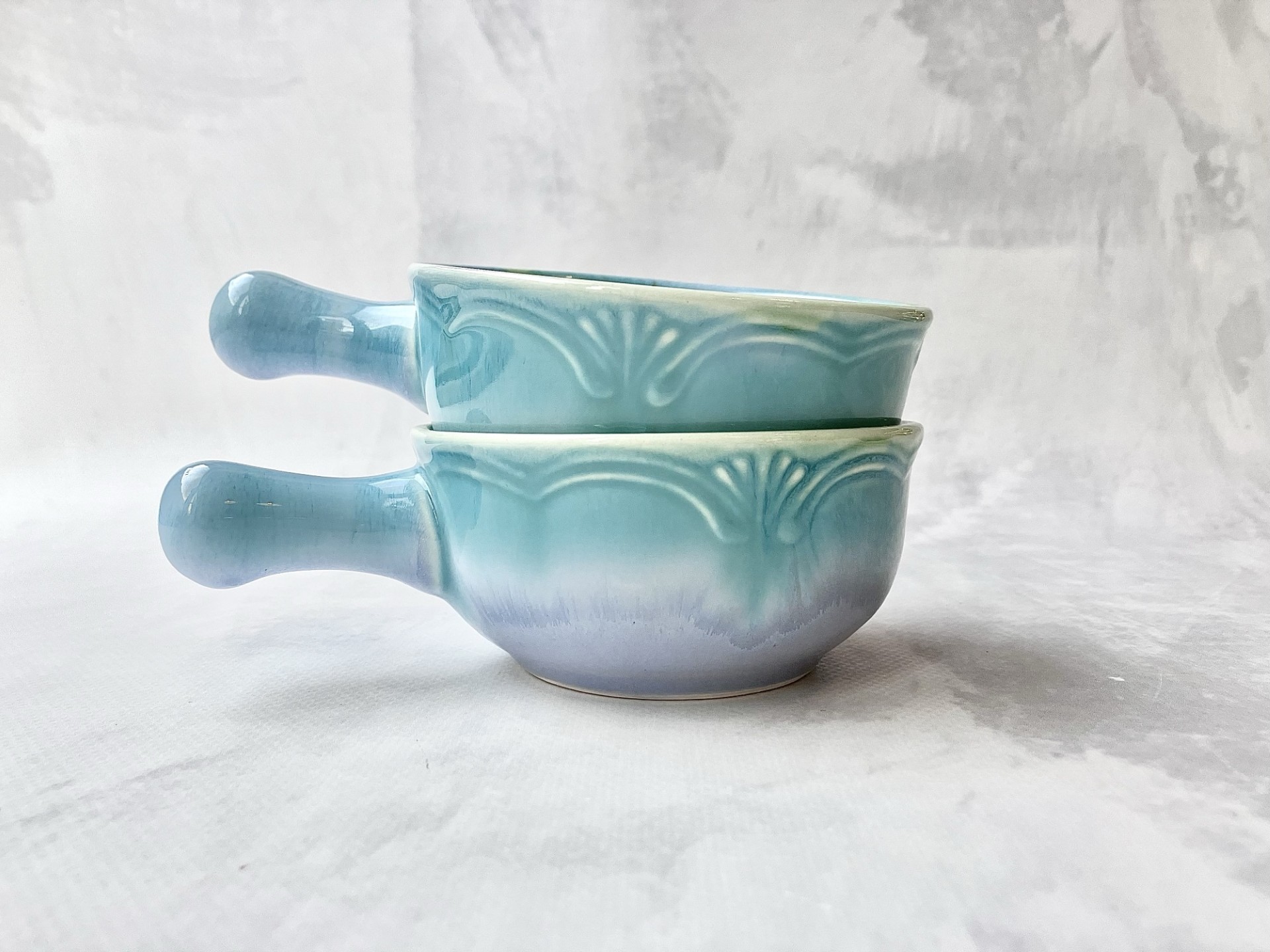 Eleganckie kokilki ceramiczne w delikatnym, pastelowym odcieniu błękitu z subtelnym przejściem kolorów. Pokryte szkliwem o lekko nieregularnym efekcie, który nadaje im unikatowego, ręcznie wykonanego charakteru, Zdobione motywem roślinnym, z wygodnym uchwytem ułatwiającym przenoszenie i serowanie.