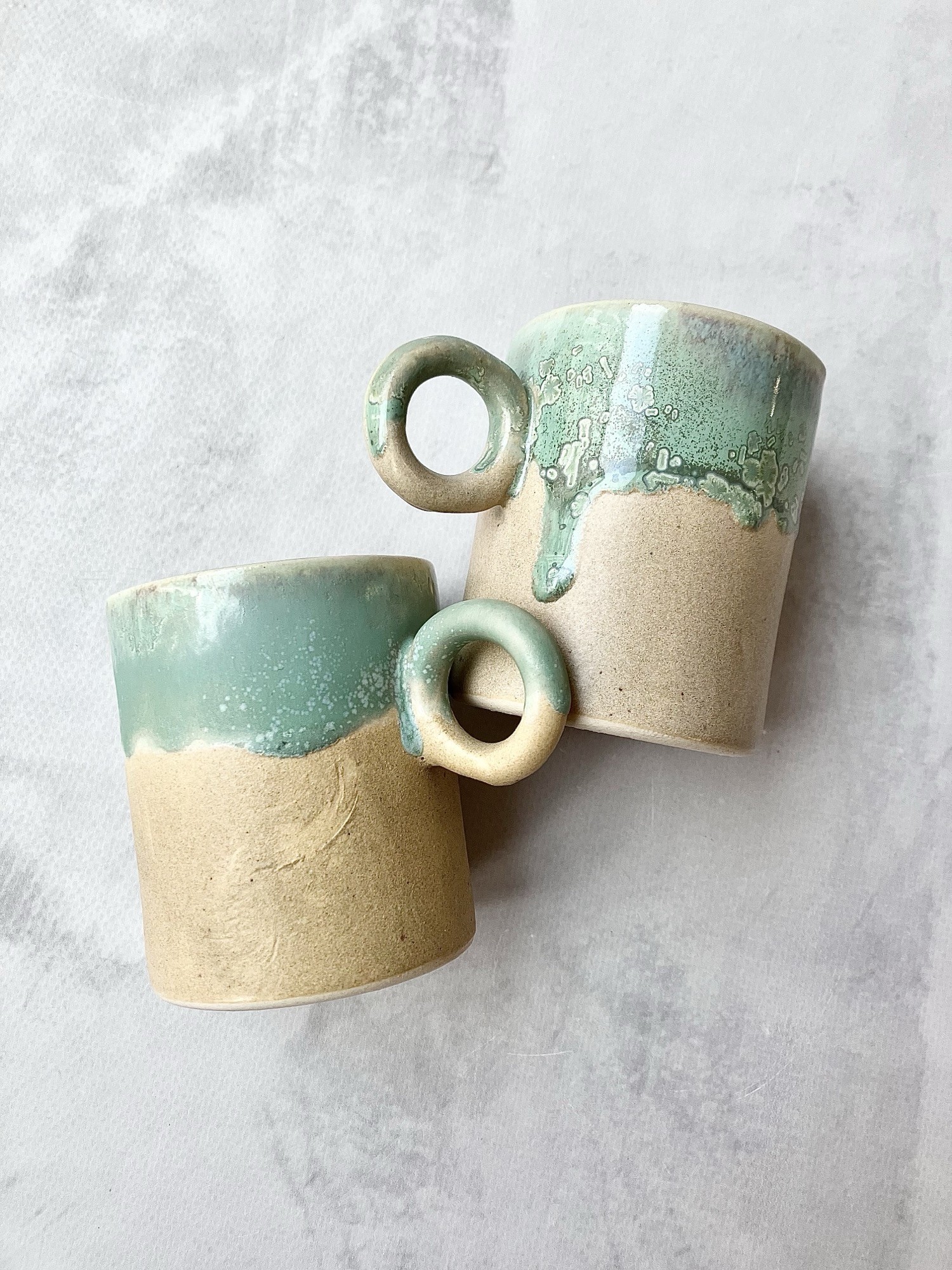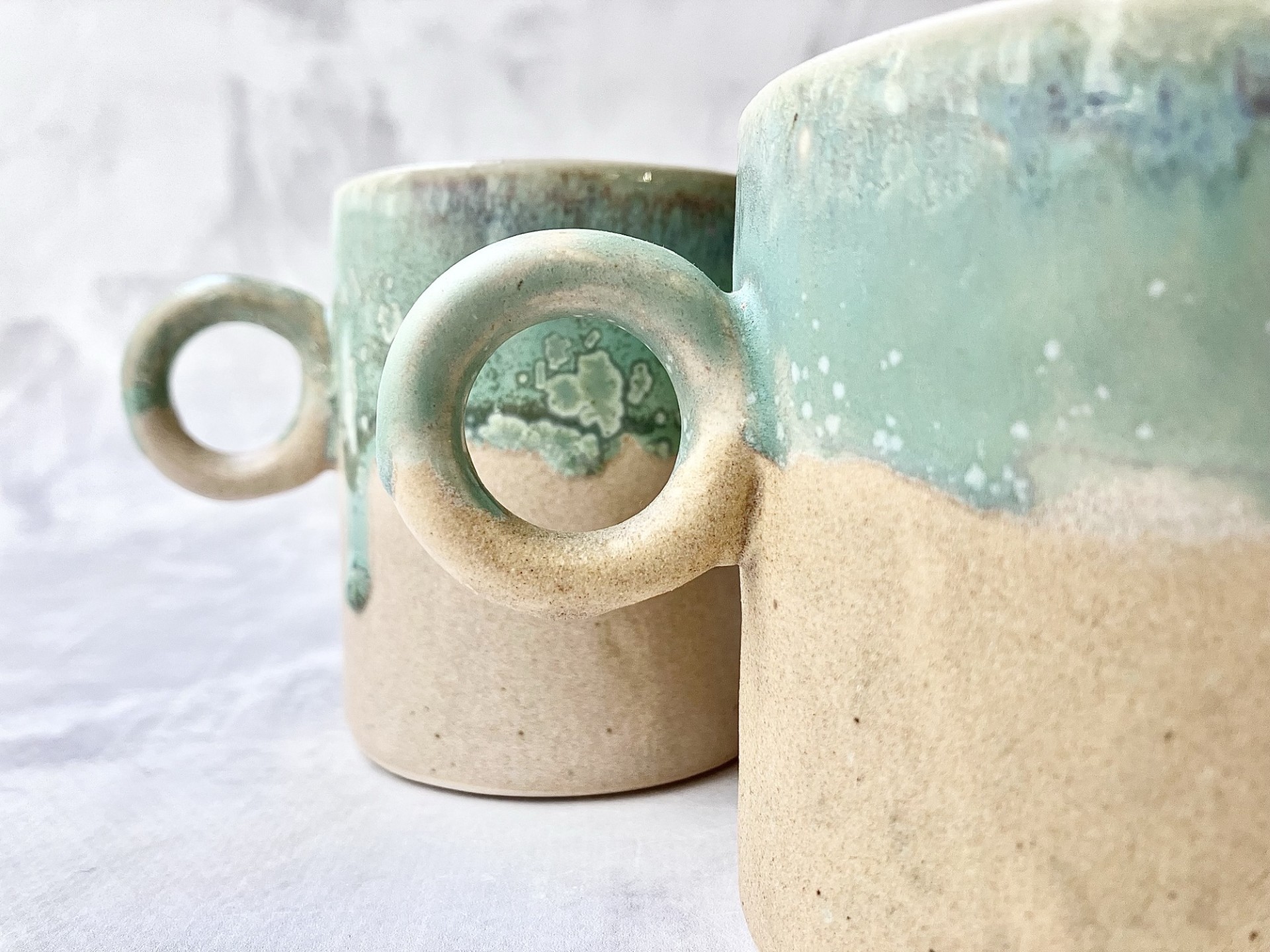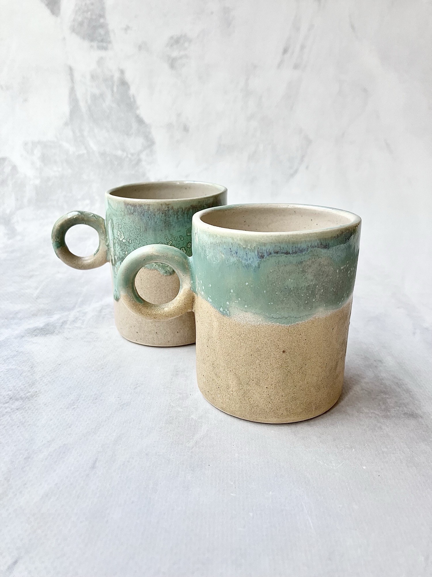 KUBEK *CIRCLE. WAVE* to połączenie naturalnej prostoty i nowoczesnego designu. Wykonany ręcznie z kamionki, zachwyca subtelną, falującą linią szkliwa w odcieniach mięty i morskiej zieleni, które swobodnie spływają po matowym, piaskowym szkliwie. Każdy egzemplarz jest niepowtarzalny- drobne różnice w fakturze i szkliwie są świadectwem rzemieślniczego charakteru.