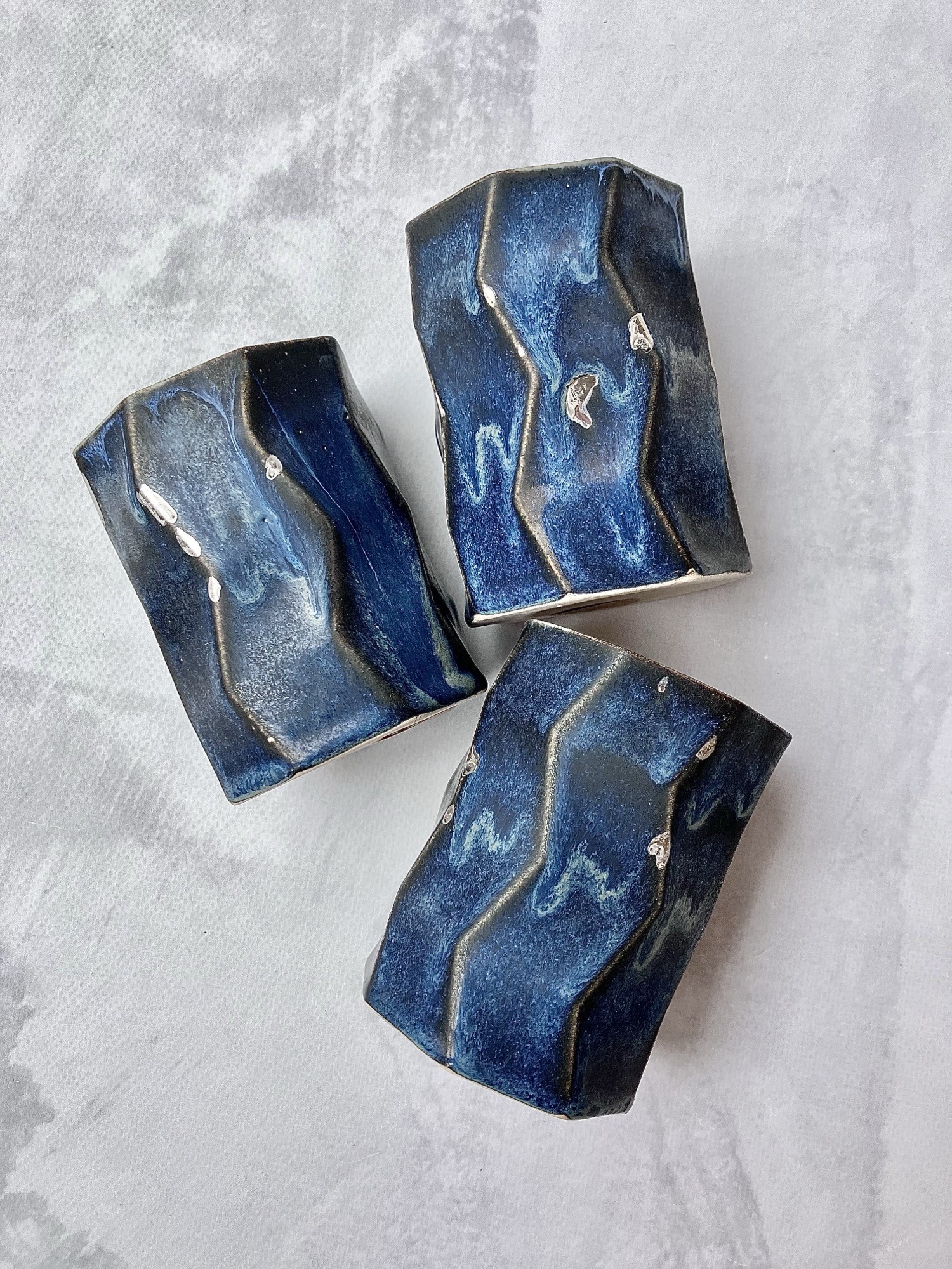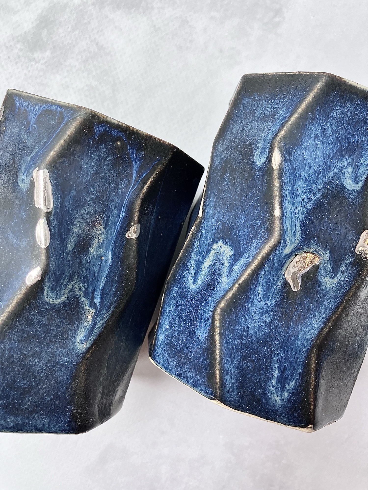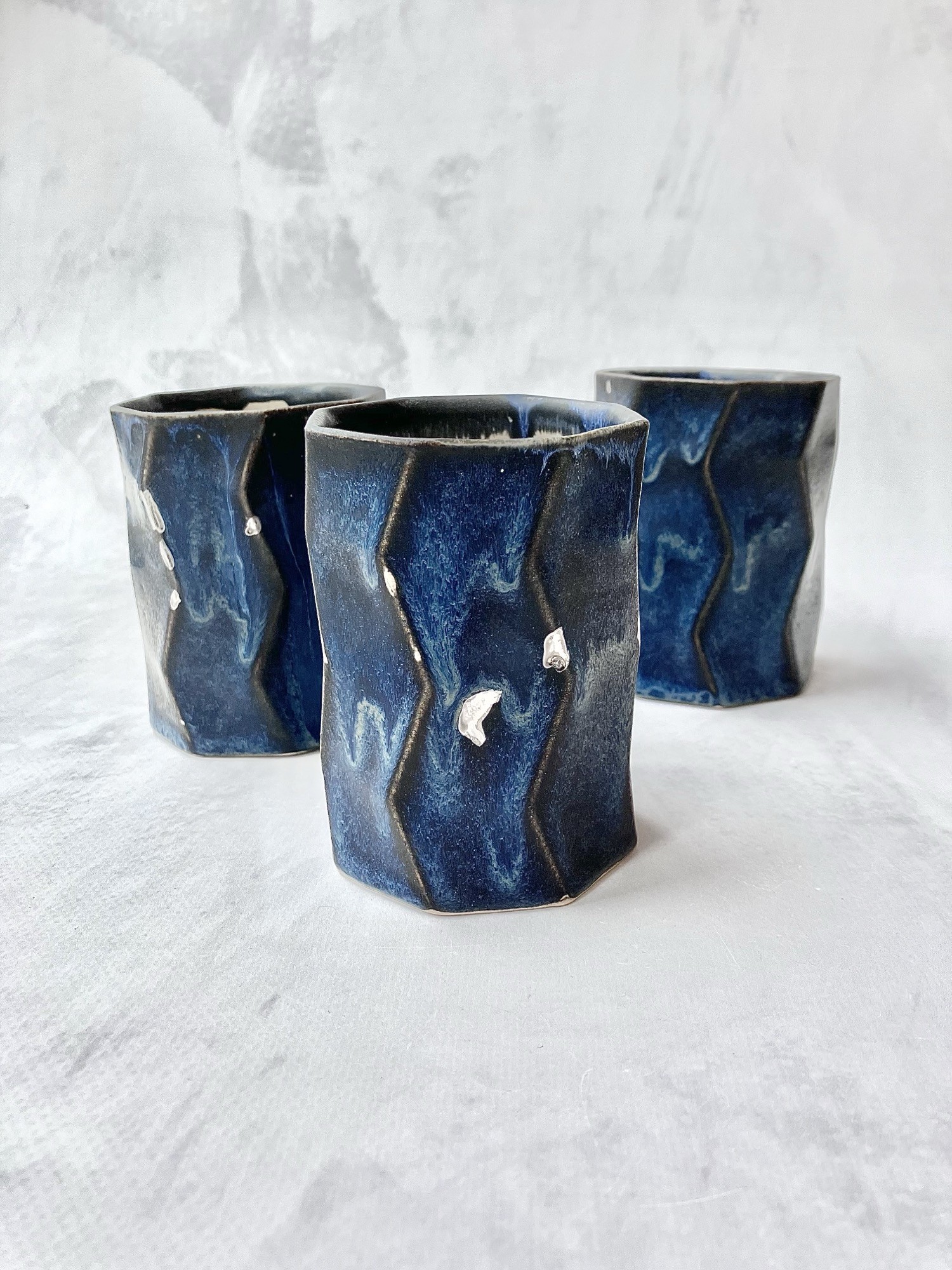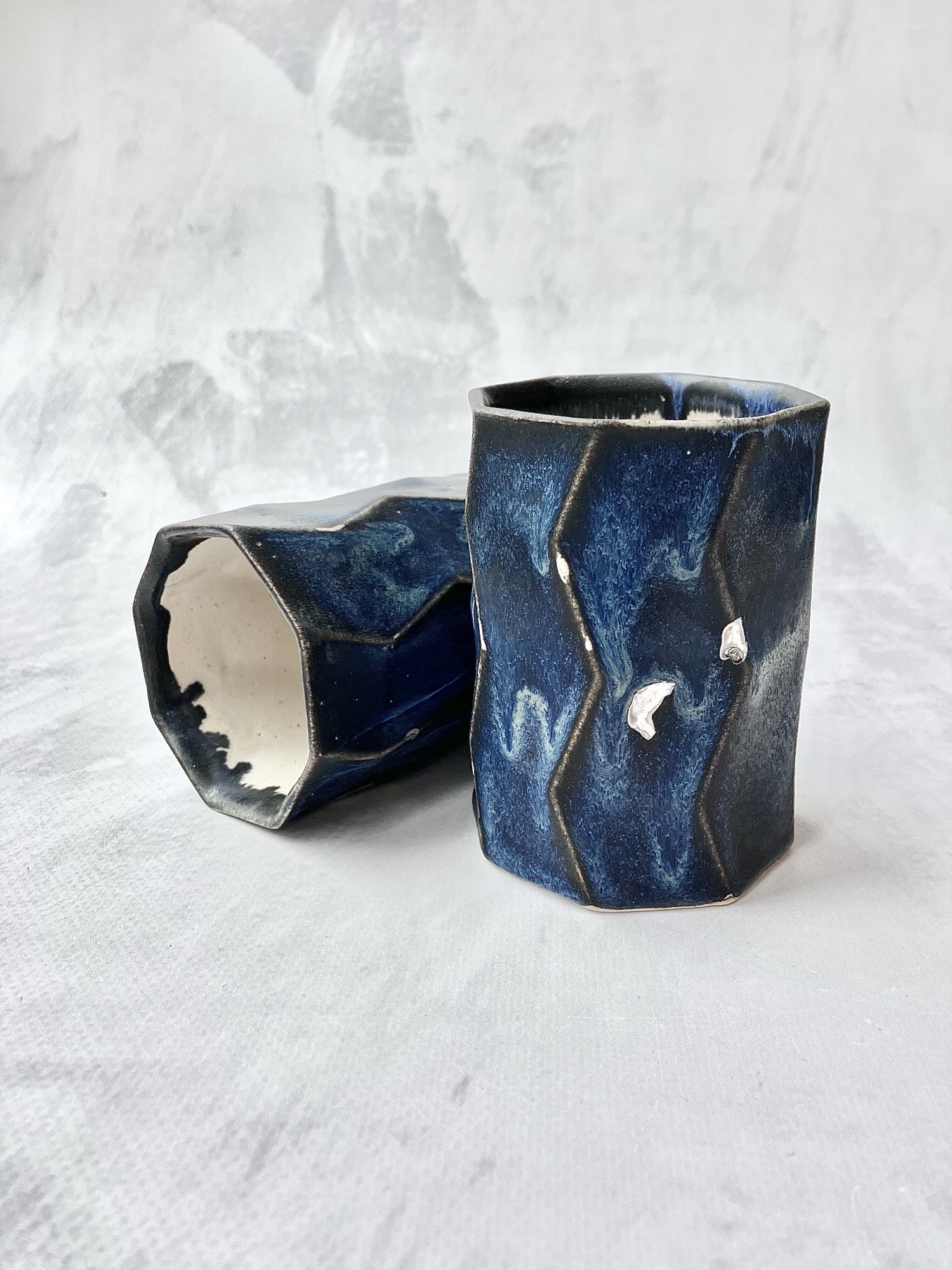 Kubek NAVY BLUE AND SILVER to wyjątkowa, ręcznie wykonana forma o nowoczesnym, rzeźbiarskim charakterze. Jego nieregularny, geometryczny kształt z delikatnymi załamaniami sprawia, że każdy egzemplarz jest niepowtarzalny i doskonale układa się w dłoni.
