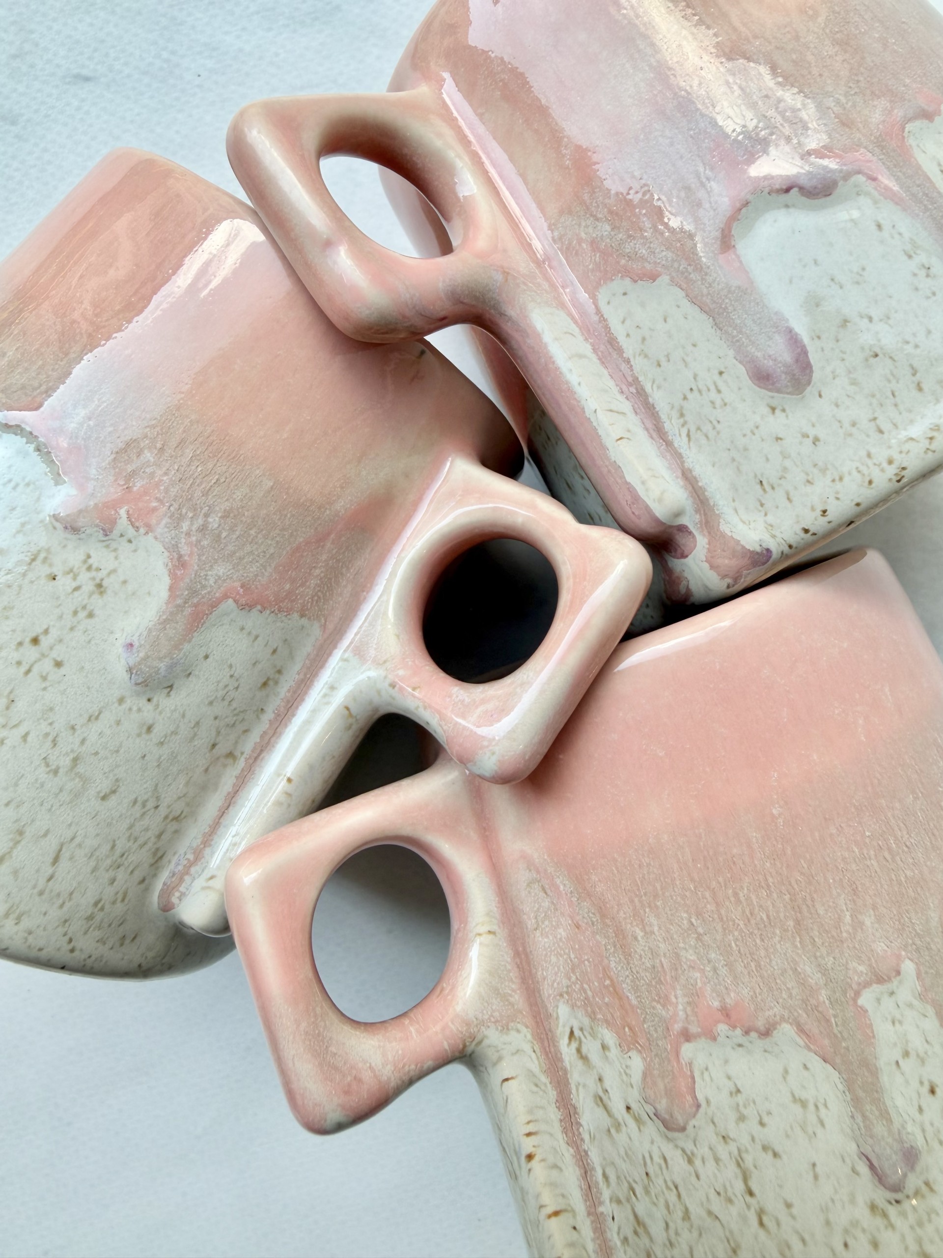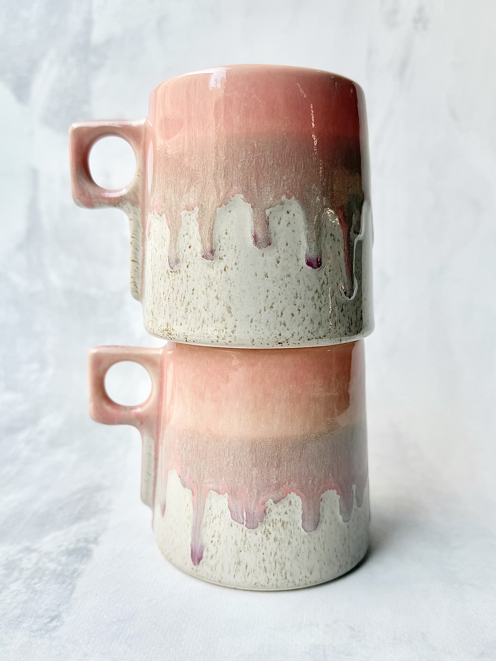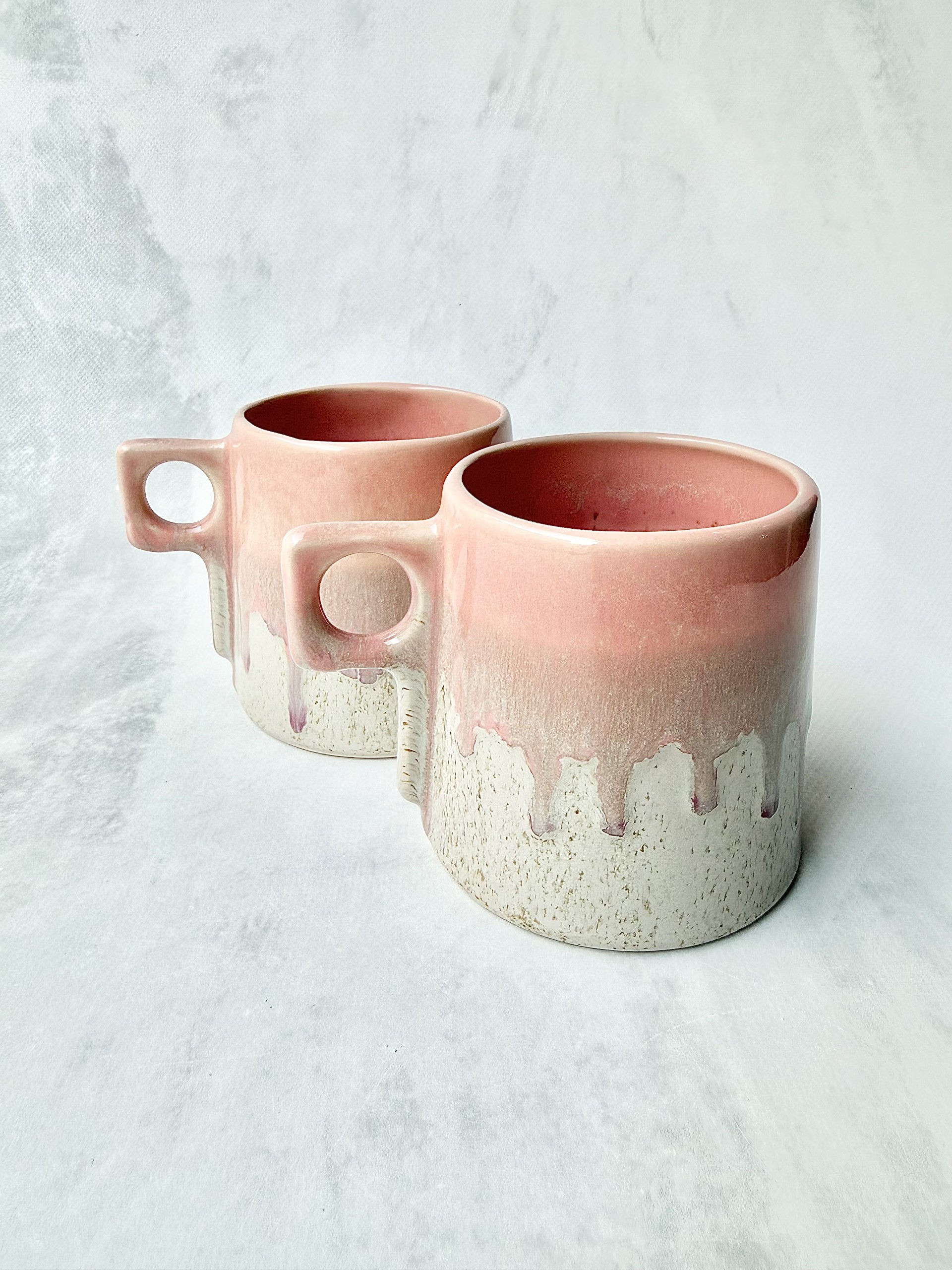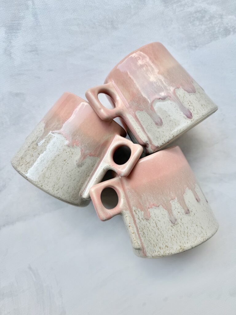 Górną część zdobią szkliwa w odcieniach różu i fioletu, które tworzą naturalne, płynne zacieki przypominające spływającą słodką polewę. Dolna część kubka to delikatnie nakrapiany beż.