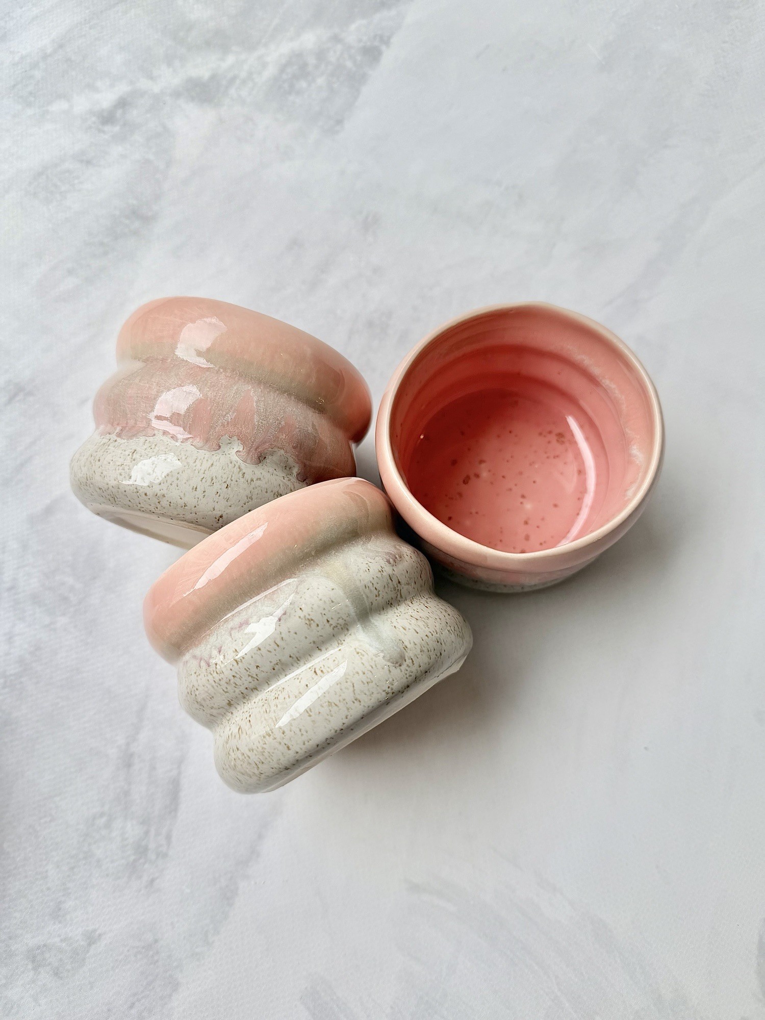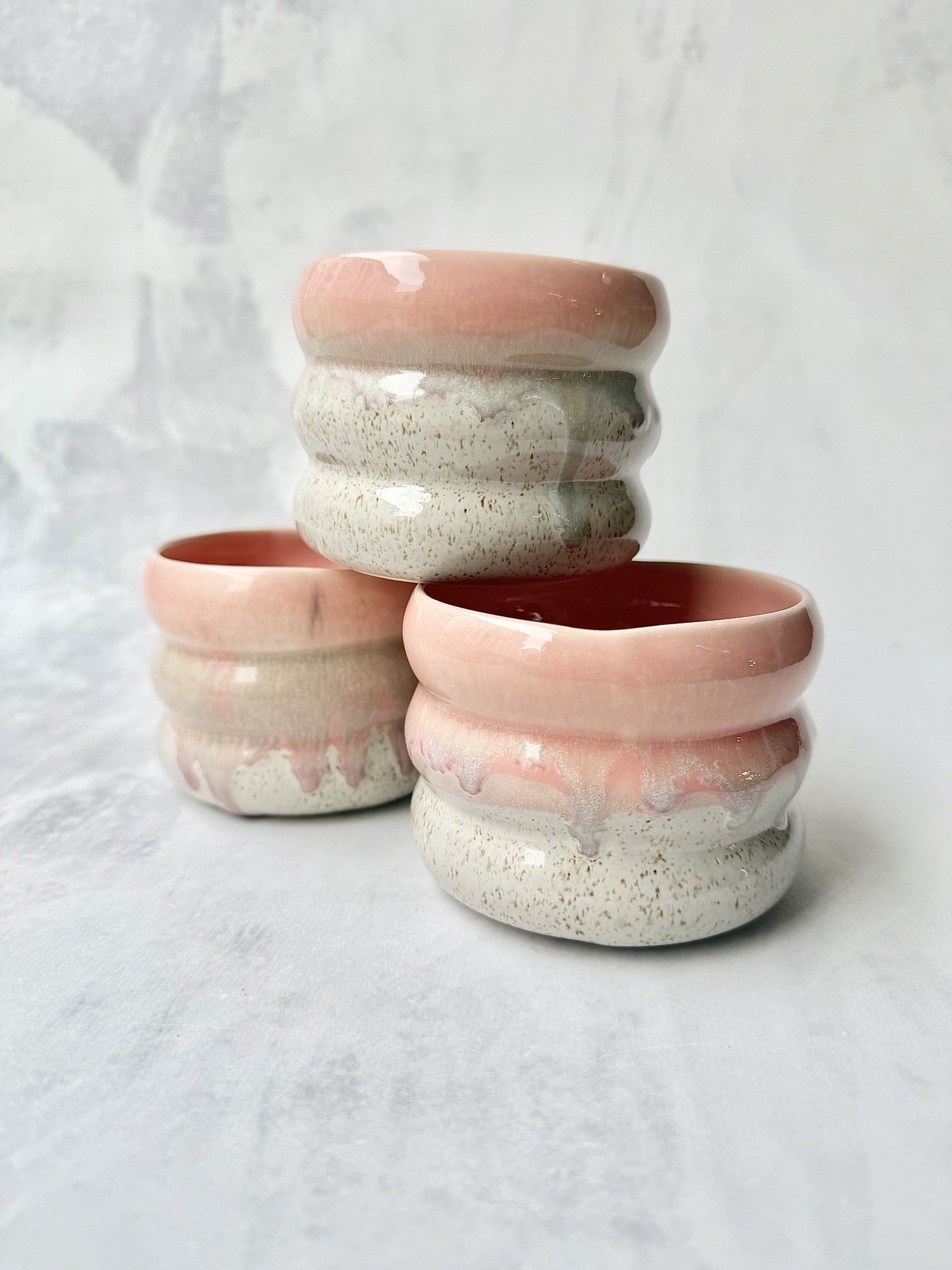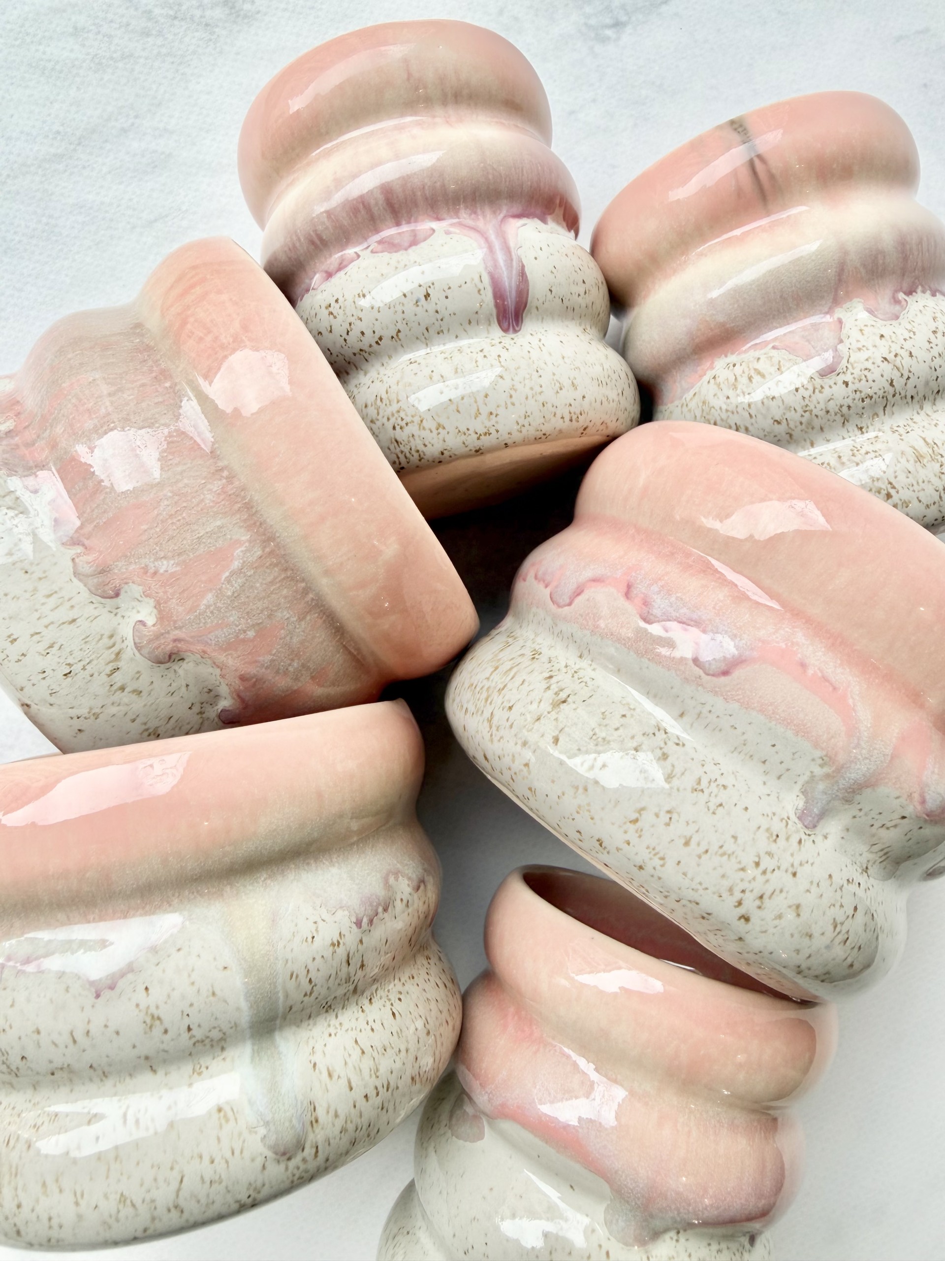Górną część zdobią szkliwa w odcieniach różu i fioletu, które tworzą naturalne, płynne zacieki przypominające spływającą słodką polewę. Dolna część kubka to delikatnie nakrapiany beż.