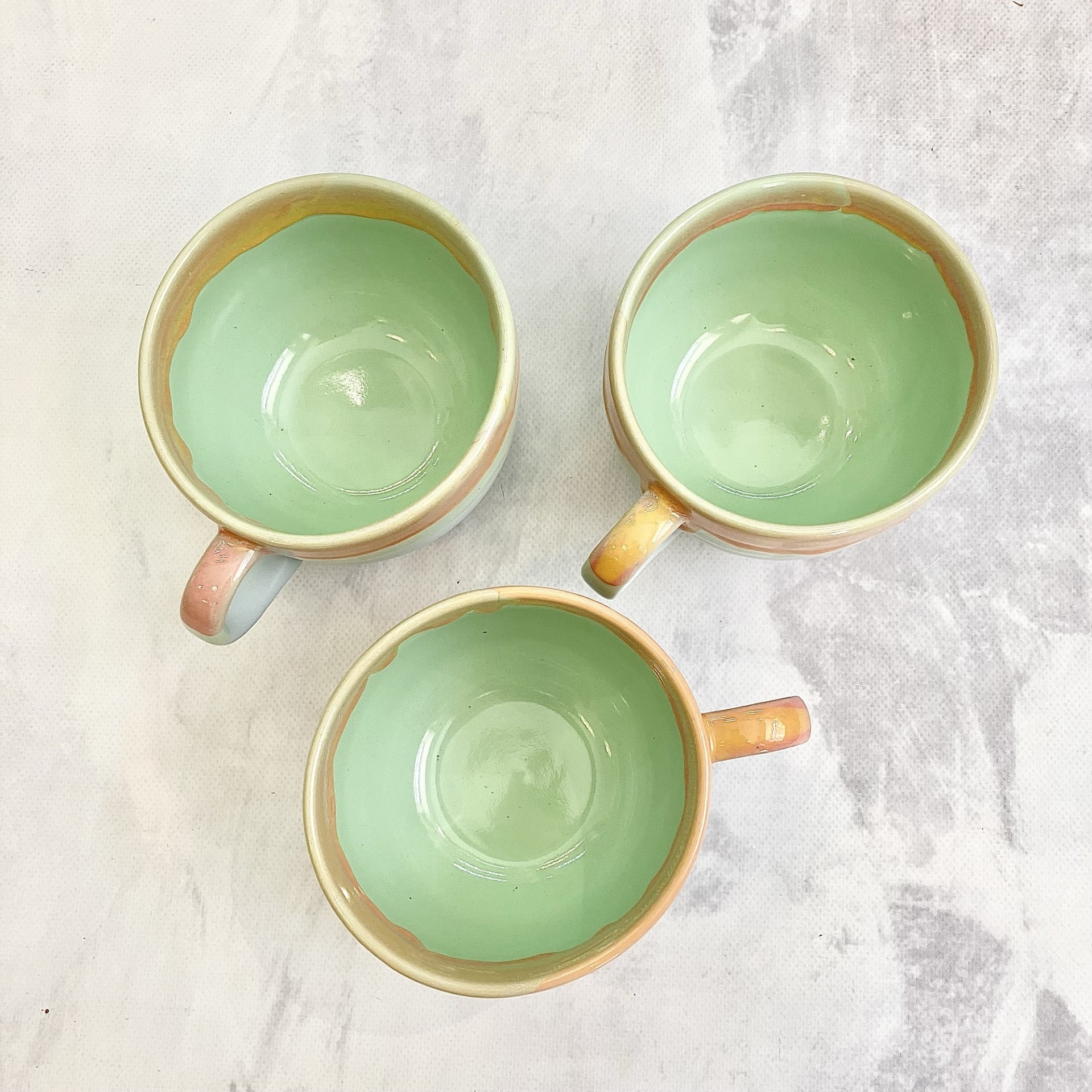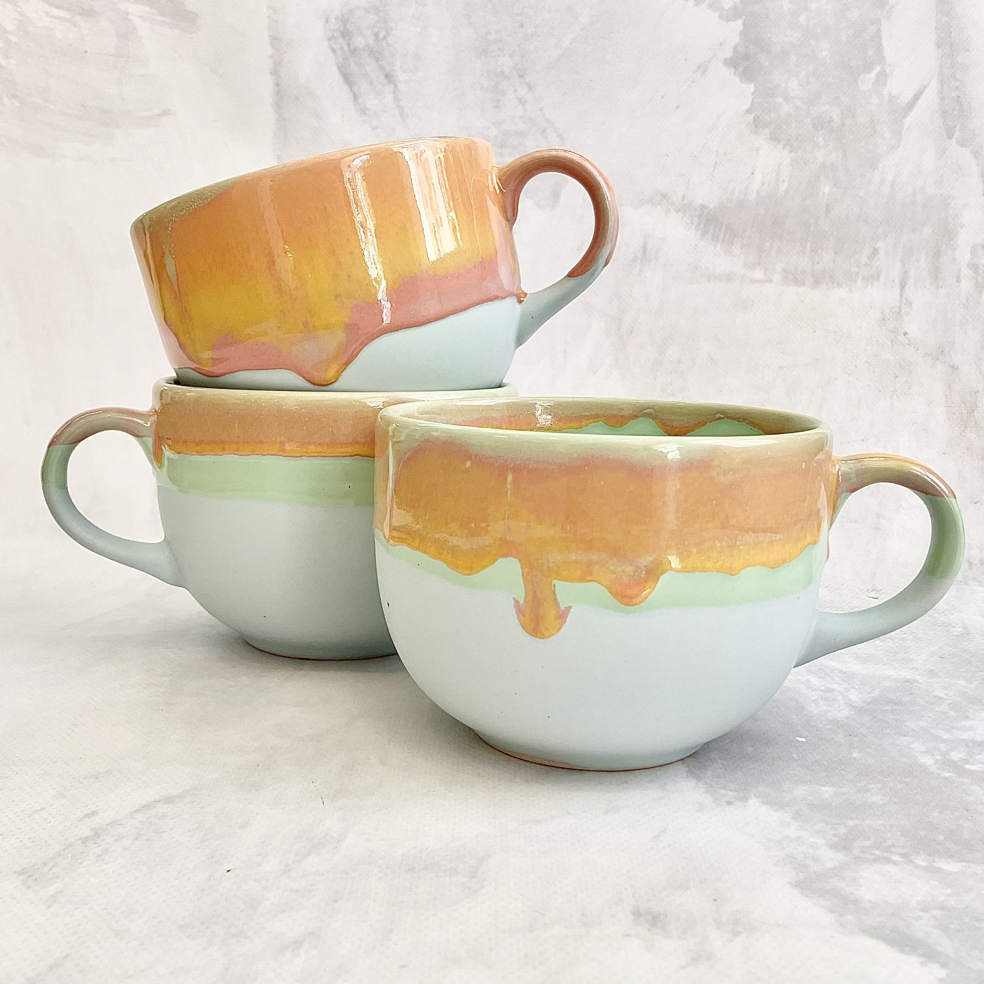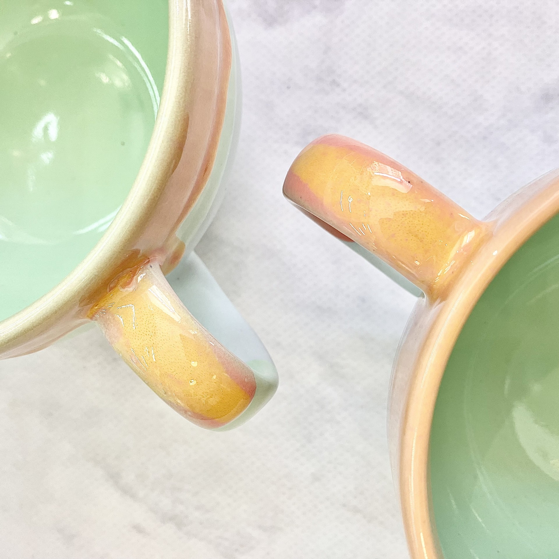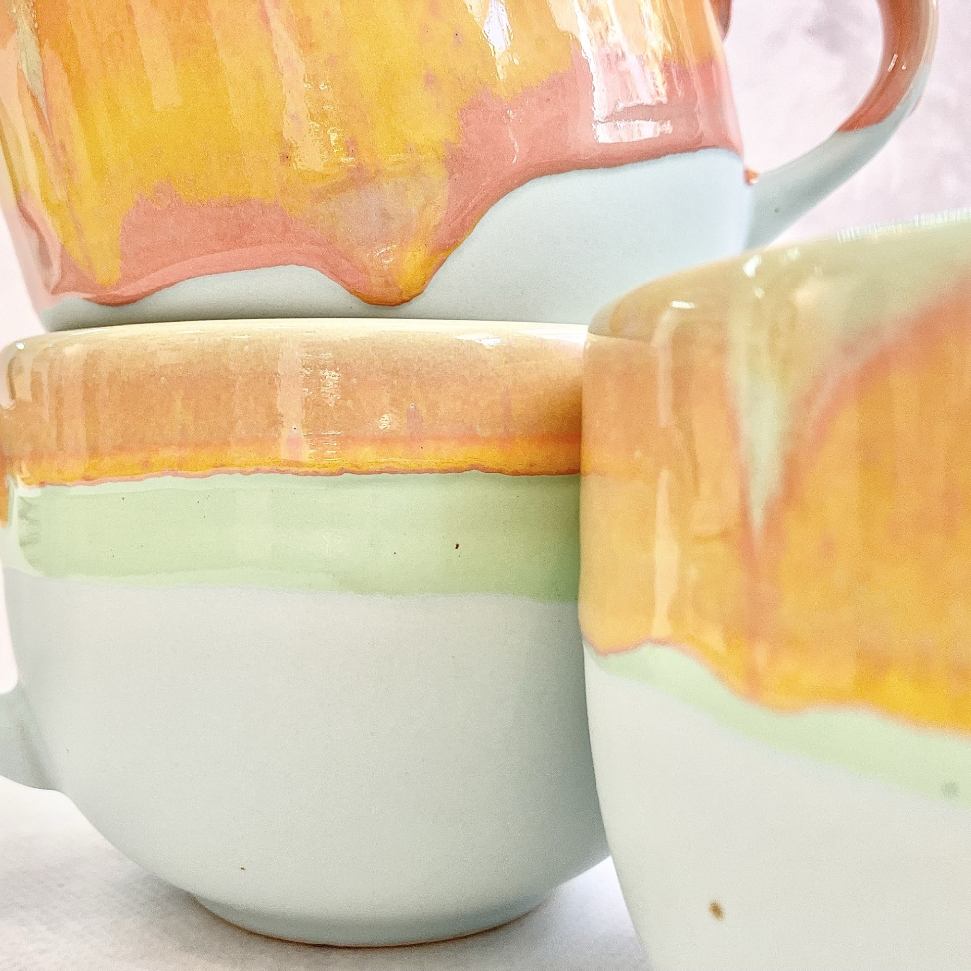 KUBEK *PASTELOWE LOVE* Zauroczy Cię pięknymi przejściami zieleni, błękitu, różu i soczystej pomarańczy. Wprawi Cię w dobry nastrój każdego poranka. Idealny dla osób które kochają kawę i herbatę w dużych ilościach 😉