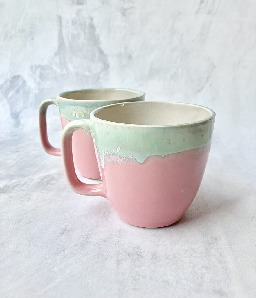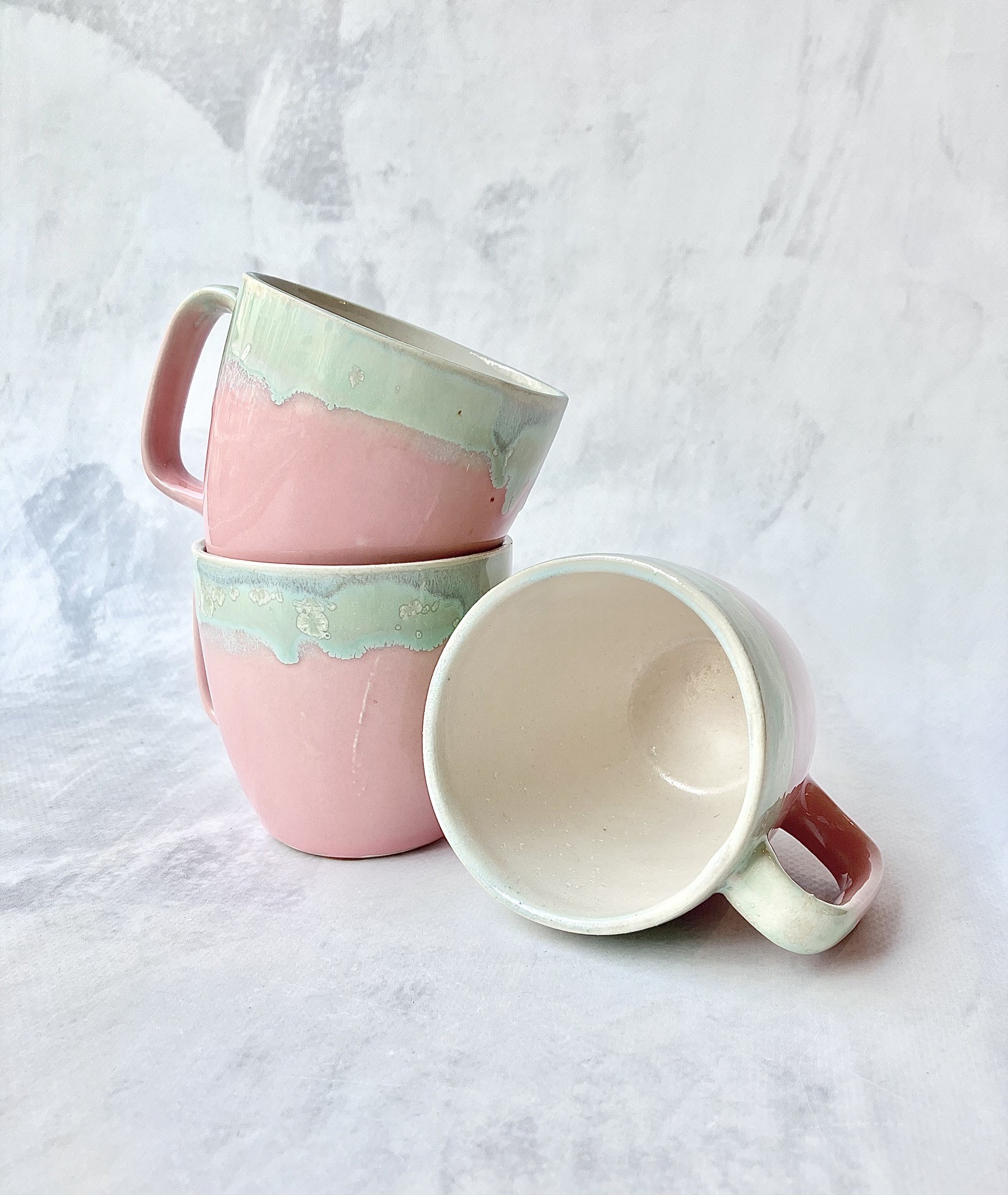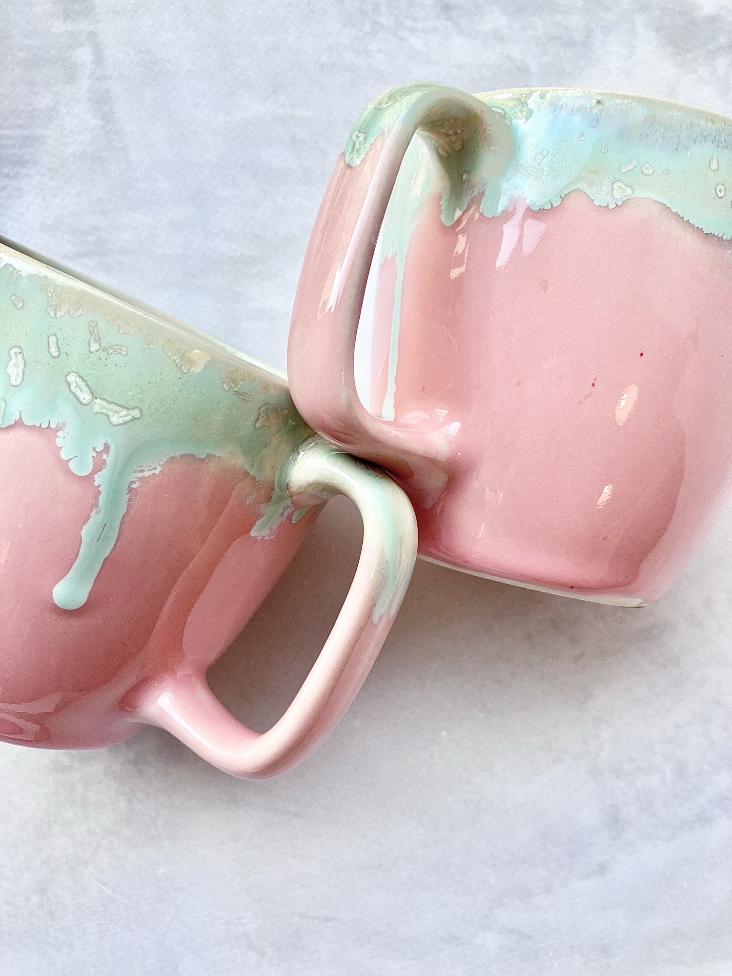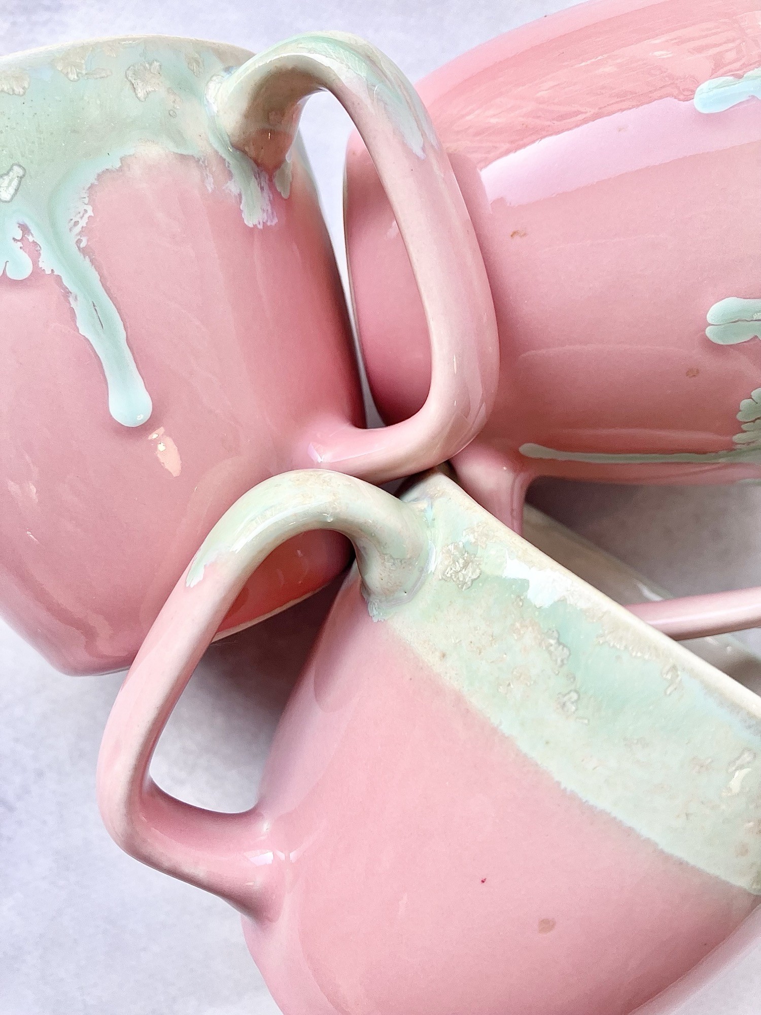 Kubek z serii PINK SAND to połączenie subtelności i rękodzielniczego charakteru. Wykonany z ceramiki szkliwionej na wysoki połysk, zachwyca połączeniem pastelowego różu z delikatną, miętową warstwą szkliwa, która spływa po brzegach w naturalny, unikatowy sposób. Każdy kubek jest niepowtarzalny- różnice w fakturze i układzie szkliwa podkreślają jego ręczne wykonanie.
