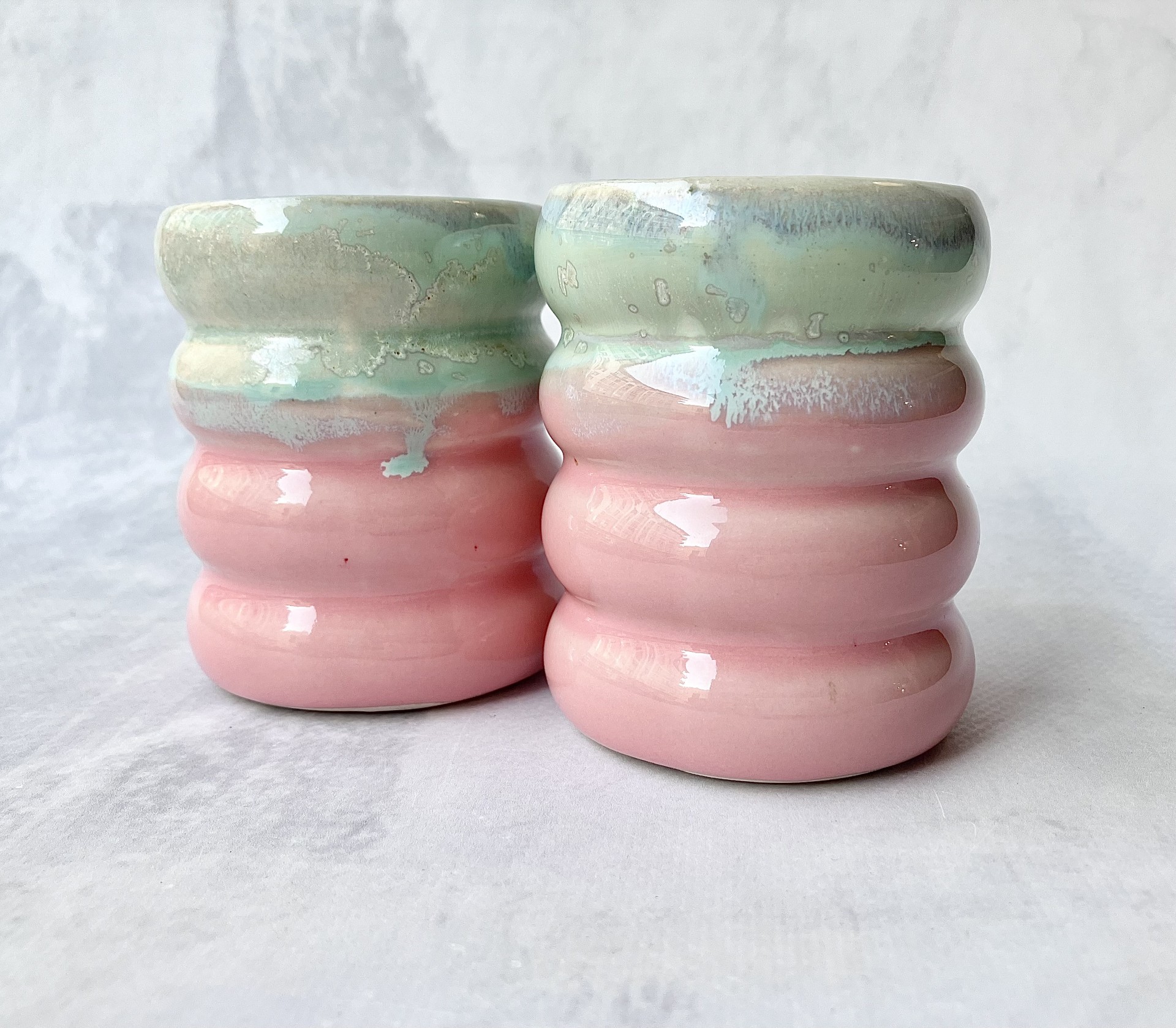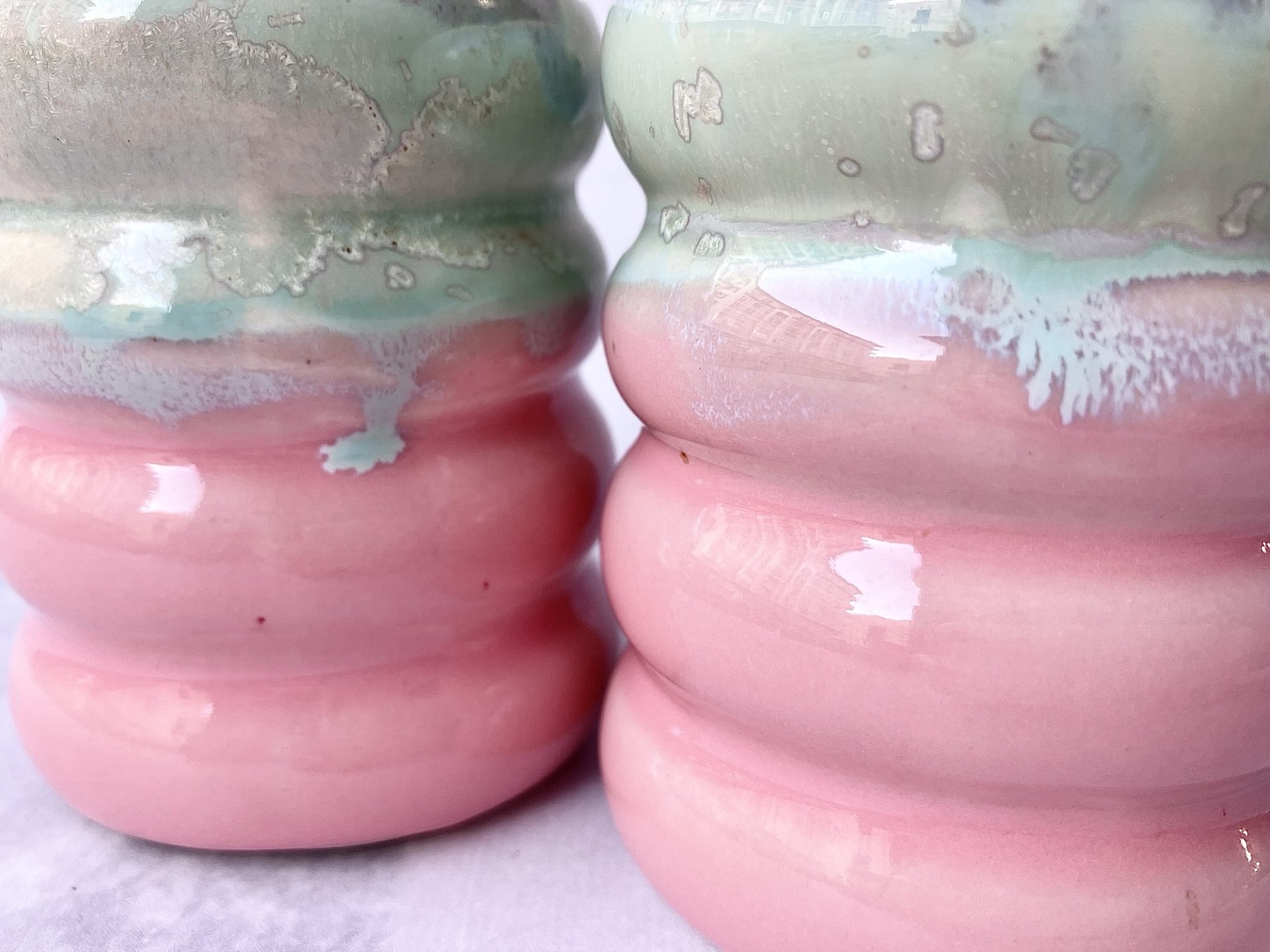 Górną część zdobi szkliwo w odcieniach mięty i turkusu, które tworzy naturalne, płynne zacieki przypominające morską pianę. Dolna część kubka to gładki, błyszczący pudrowy róż.