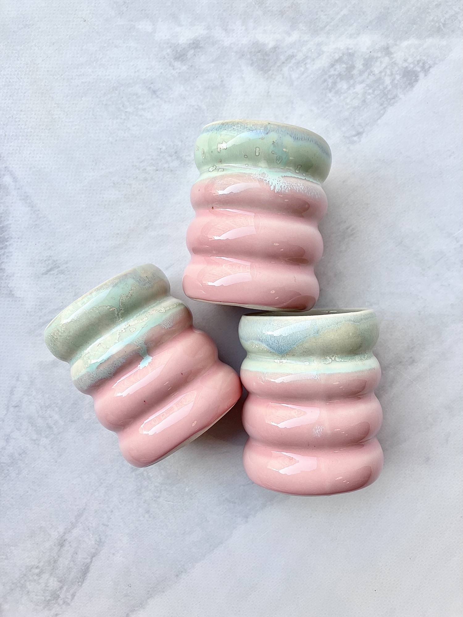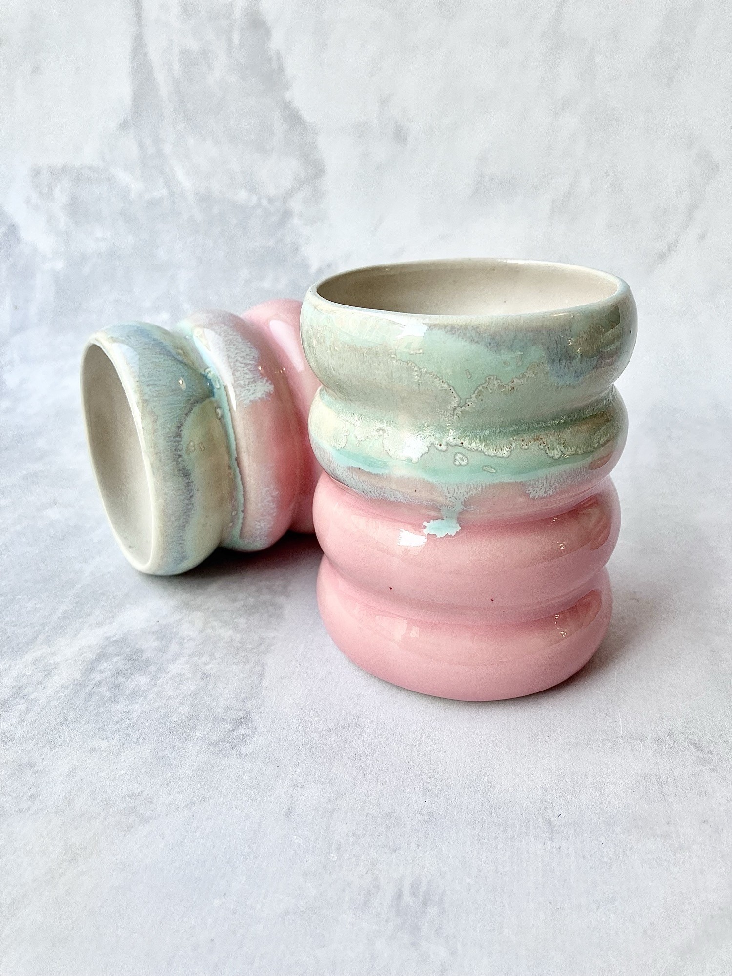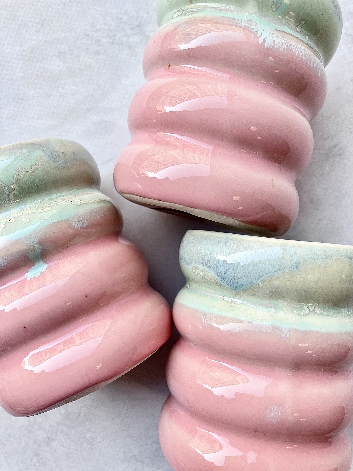 Ręcznie wykonany kubek z wyjątkowej serii PINK SAND, inspirowanej pastelowymi, miękkimi barwami różowych plaż. Jego charakterystyczna, falista forma nadaje mu organiczny i przyjemny w dotyku kształt.