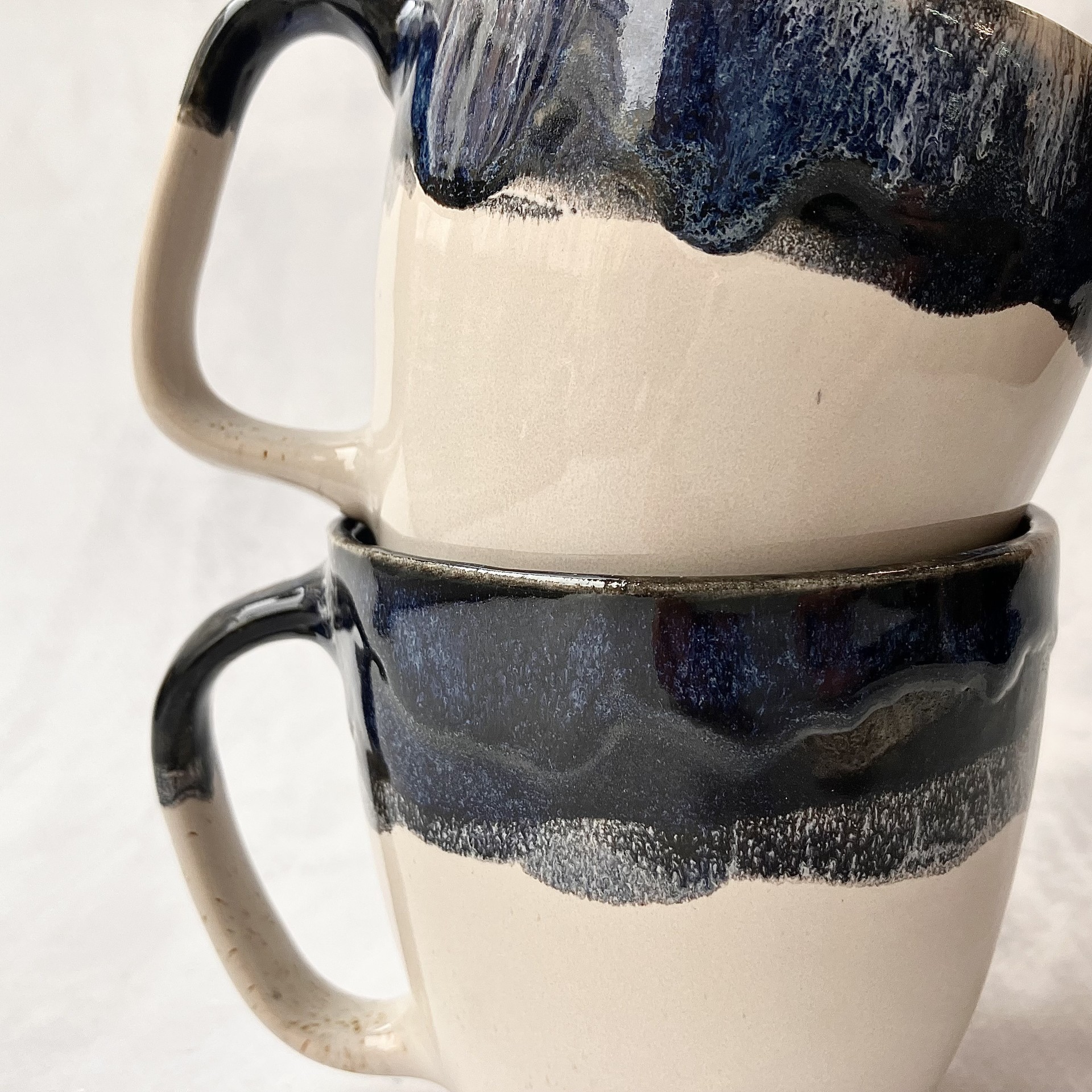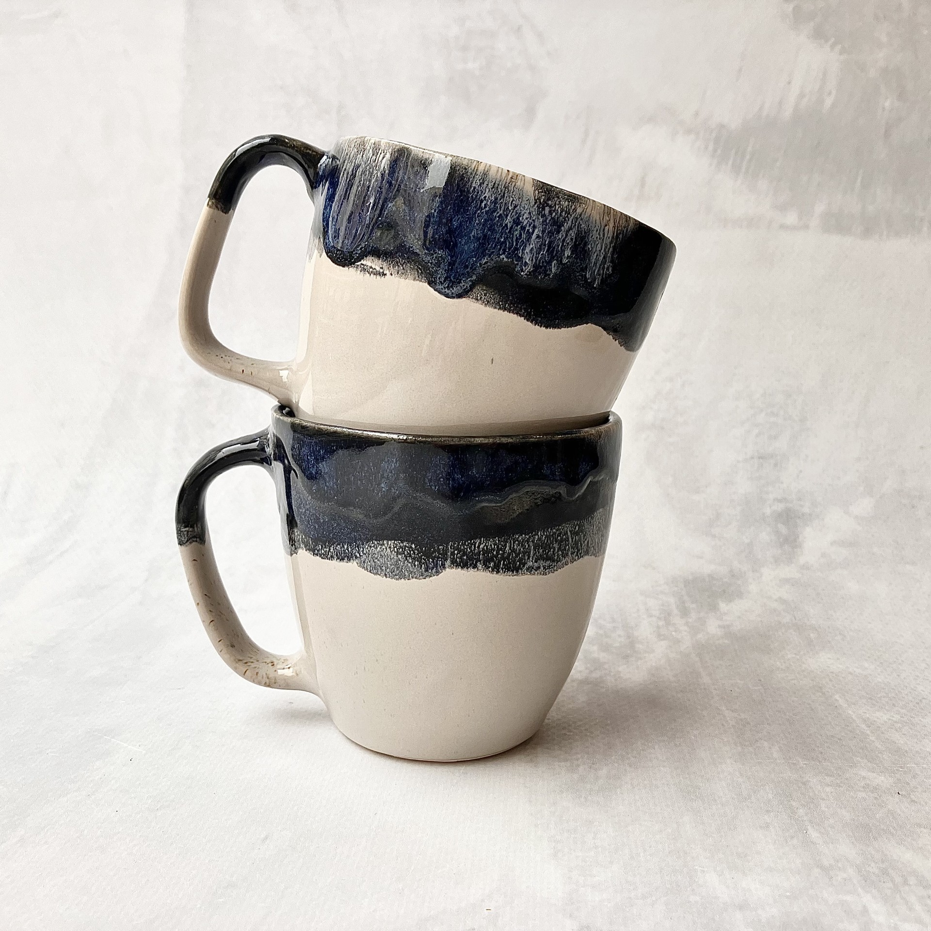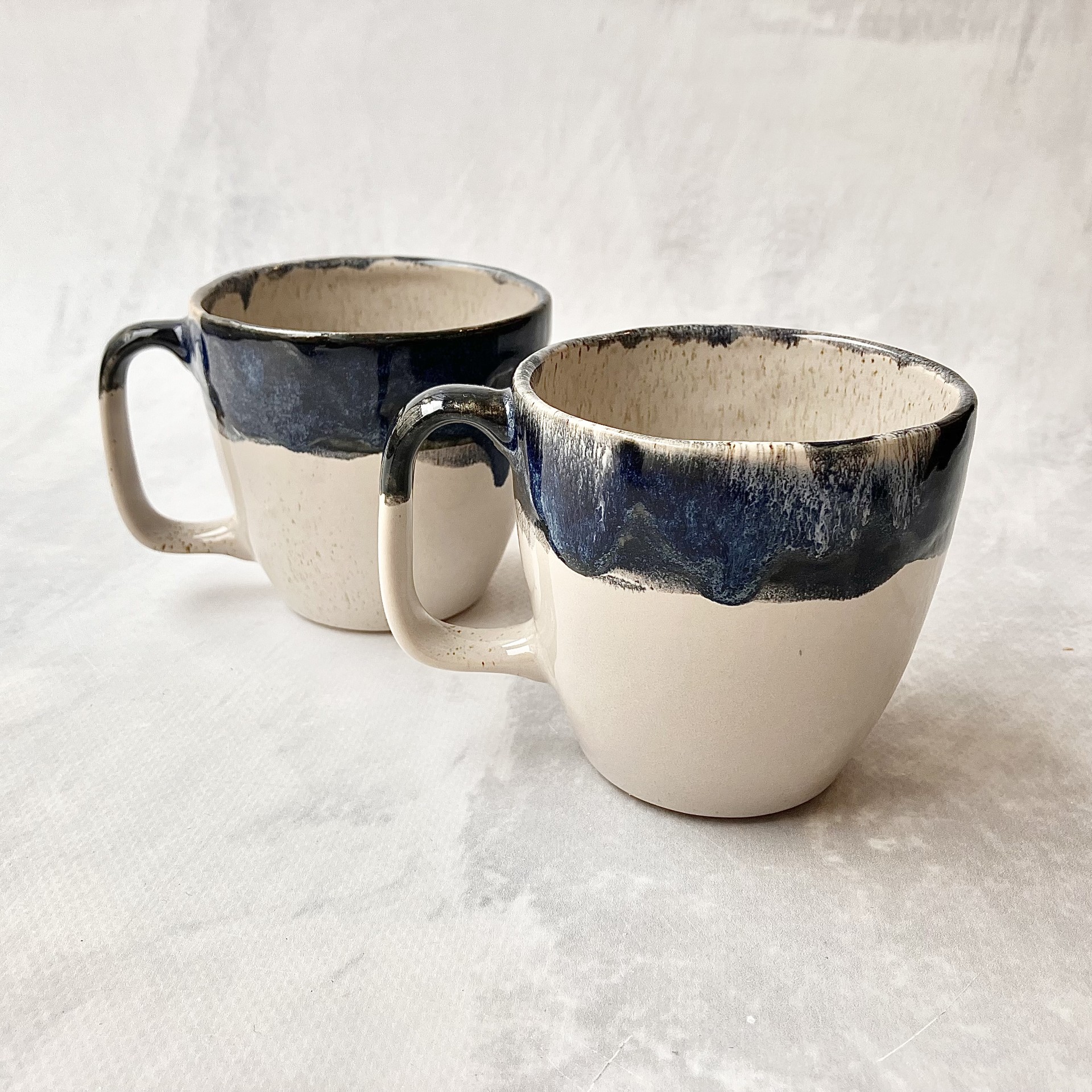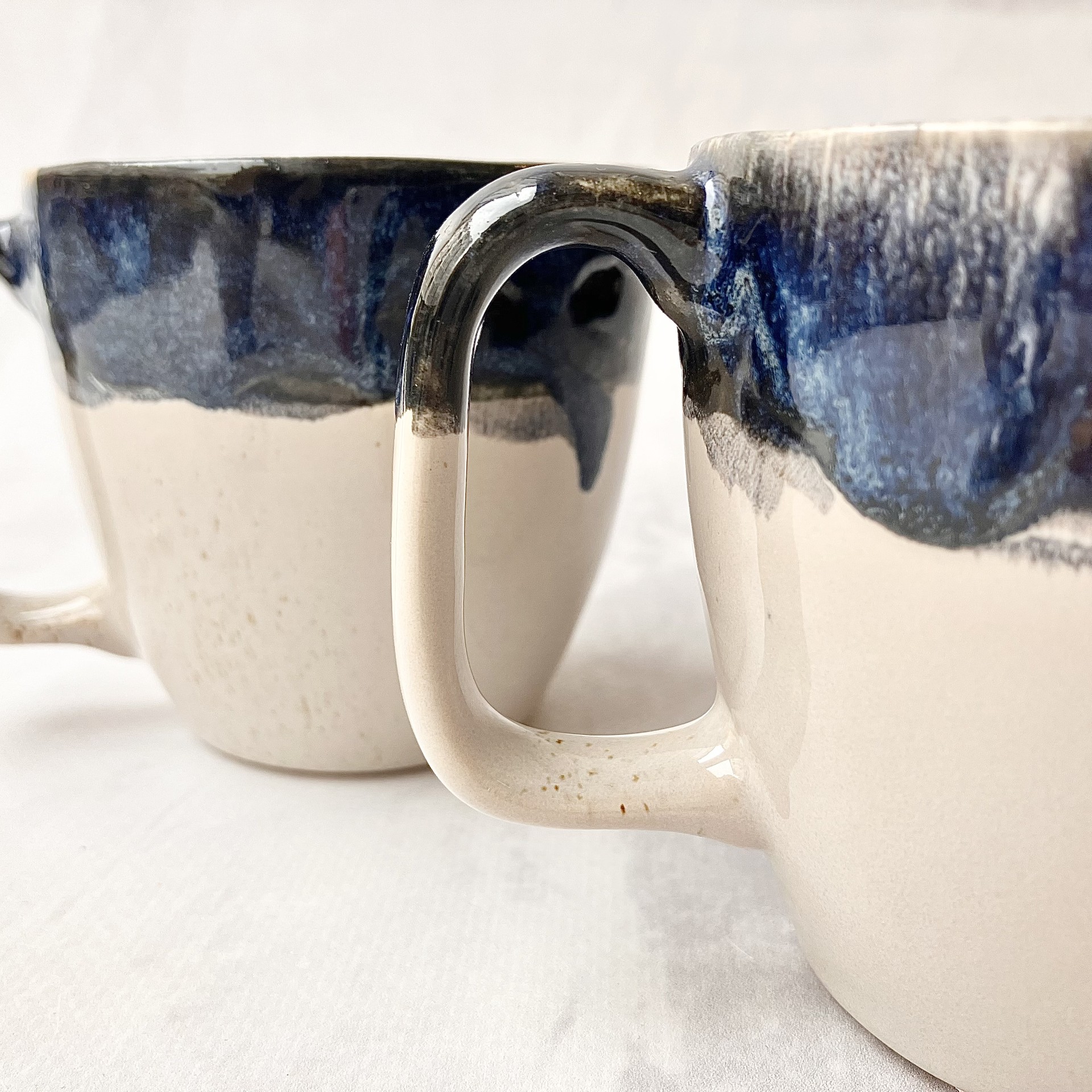 KUBEK *SAND AND NAVY BLUE* to połączenie wygodnego uszka i spokojnych przejść piaskowego beżu i intensywnego granatu. Idealny towarzysz poranków z kawą/herbatą.