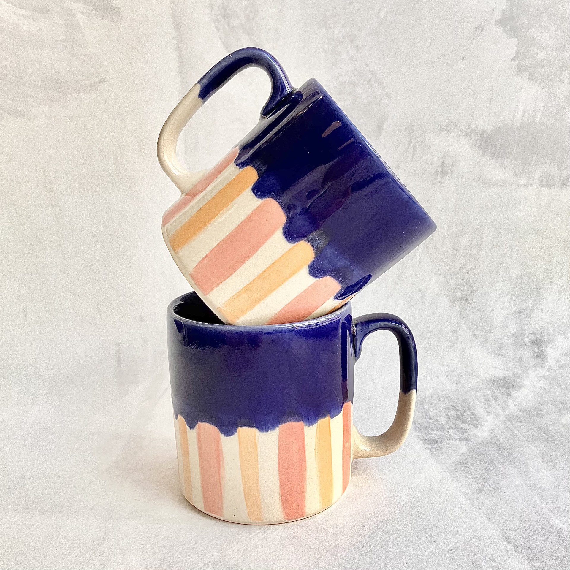 KUBEK *STRIPES* to połączenie granatowego szkliwa i różowo-pomarańczowych paseczków. Ten słodki kubek poprawi Ci nastrój każdego poranka. Idealny do kawy i herbaty.