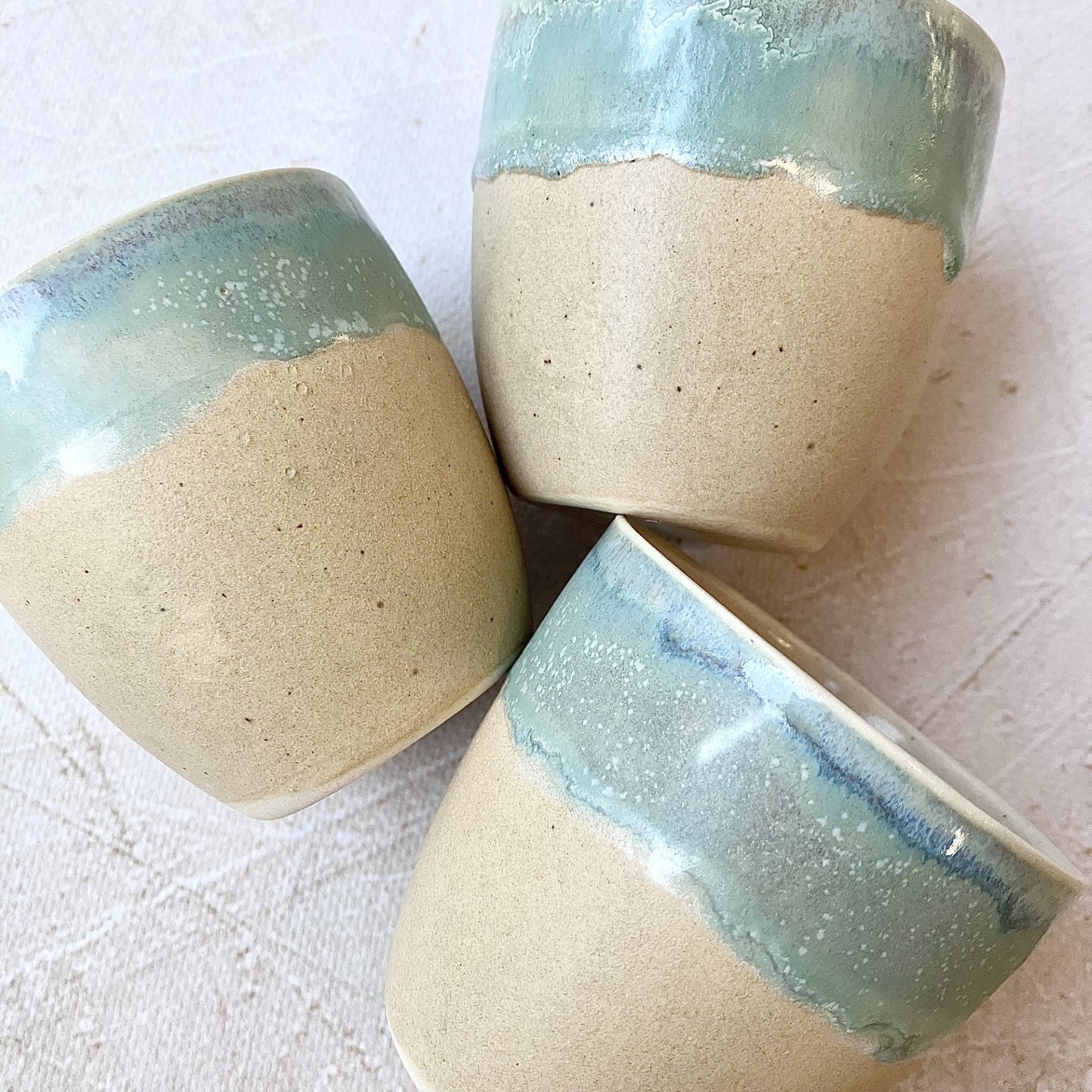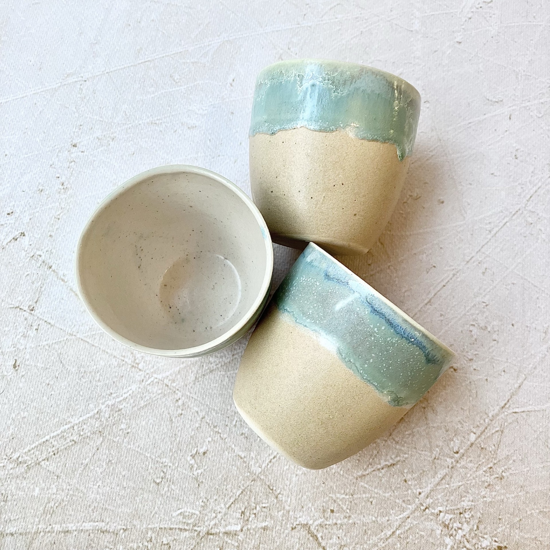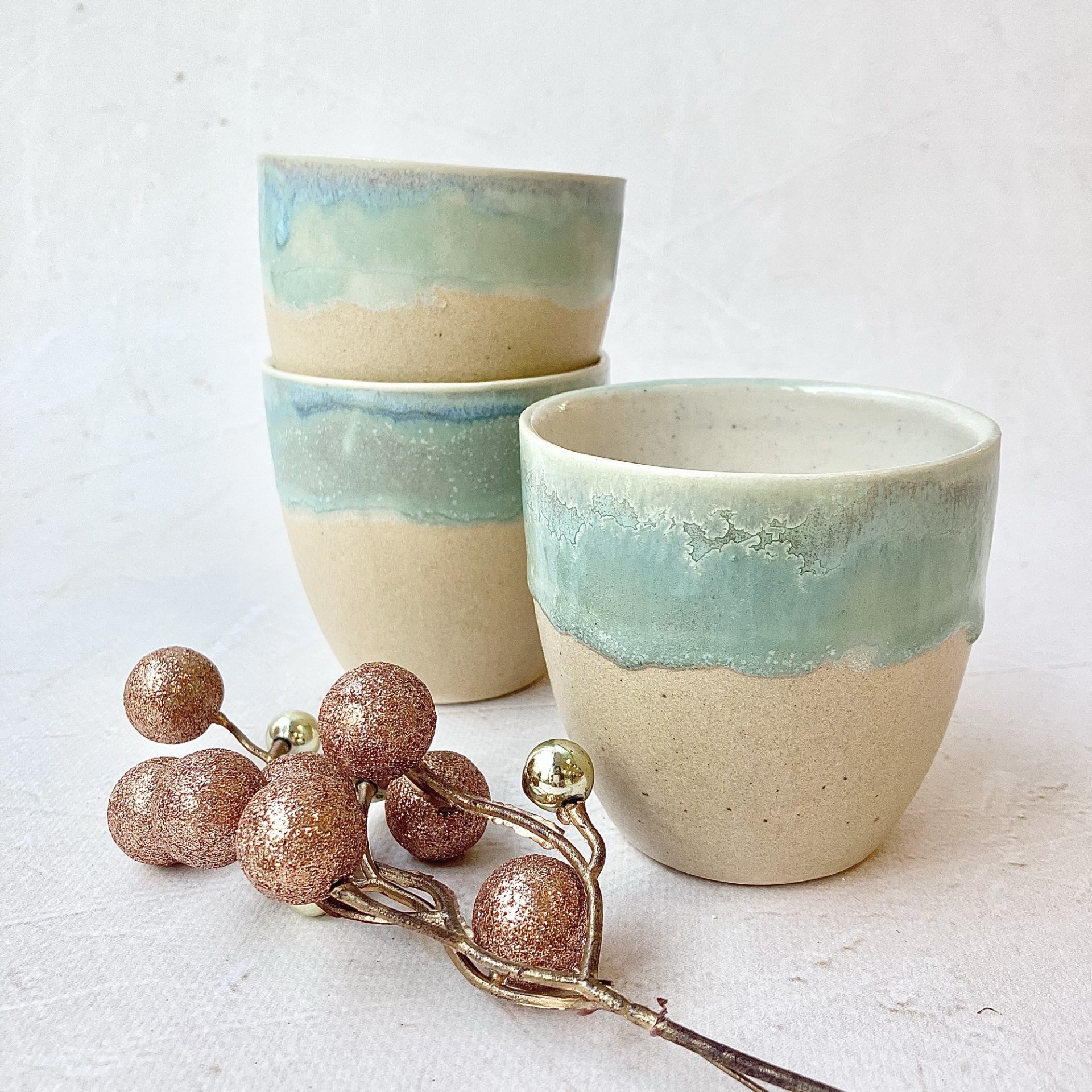 KUBEK *WAVE* to połączenie matowego beżu z pięknym niebieskim szkliwem, które tworzy efektowną warstwę niczym morska fala na piaszczystej plaży. Idealny towarzysz poranków z kawą/herbatą.