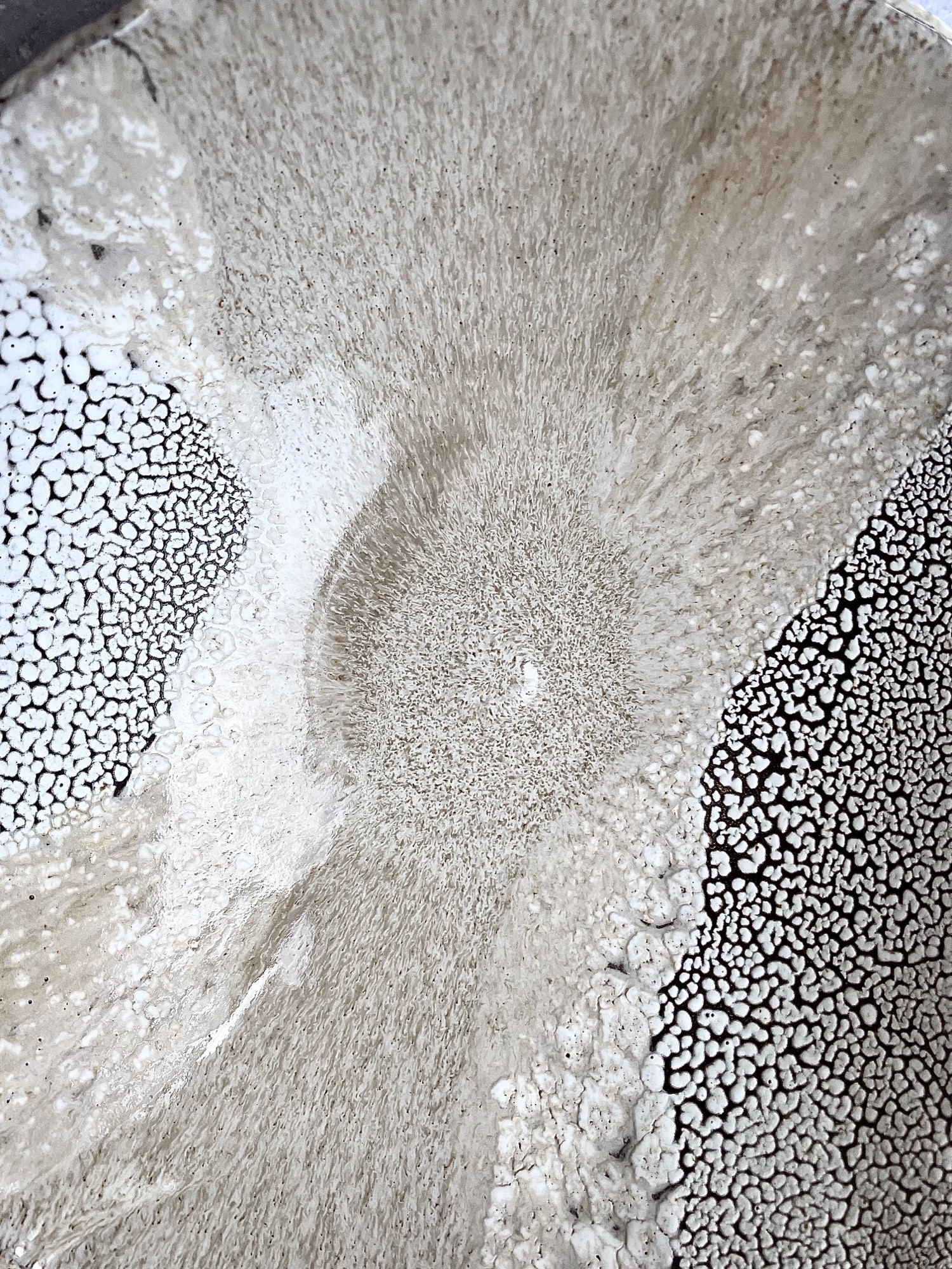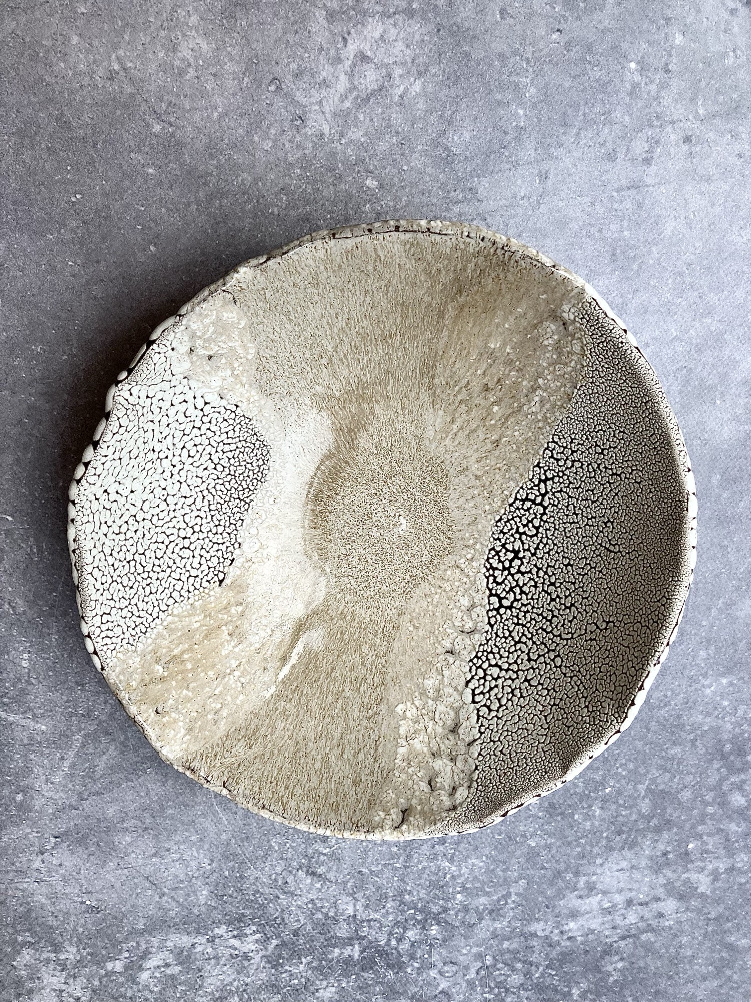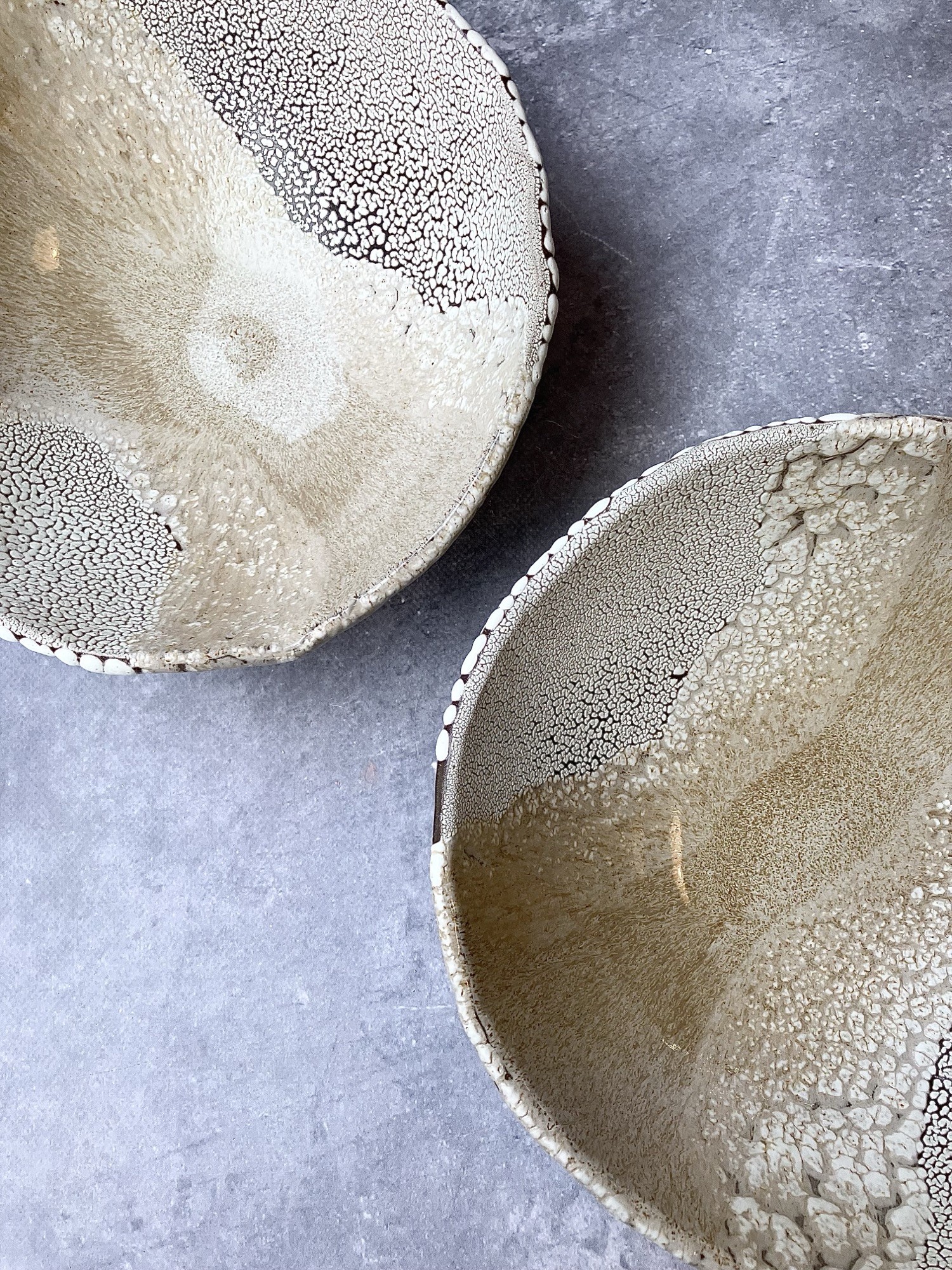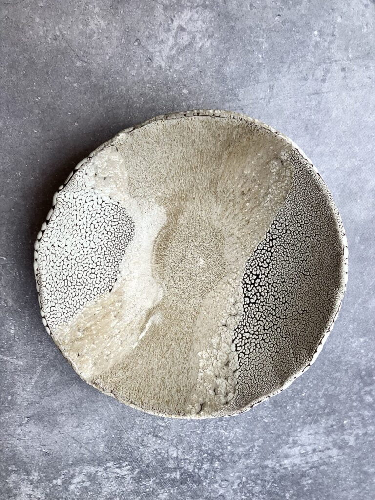 DEEP INTO THE SEA to autorska seria ceramiczna inspirowana ciszą, ciężarem i tajemnicą głębin. Każdy obiekt przypomina fragment podwodnego świata wydobyty na powierzchnię- jakby zastygły ślad procesów, które zachodzą daleko od światła, pod wpływem czasu, ciśnienia i powolnego ruchu materii. Powierzchnie naczyń są gęste, organiczne, pełne mikropęknięć, porów i struktur przywodzących na myśl rafy koralowe, wapienne osady, muszle i skalne dno morza. Kontrast między jasnymi, kredowymi obszarami a ciemniejszą, spękaną siatką tworzy wrażenie mapy nieznanego terenu- topografii głębin. Glazura zachowuje się jak osad mineralny: narasta, cofa się, odsłania warstwy, sugerując naturalne procesy erozji i krystalizacji.
