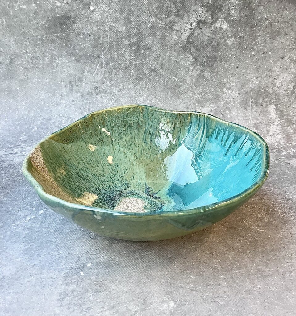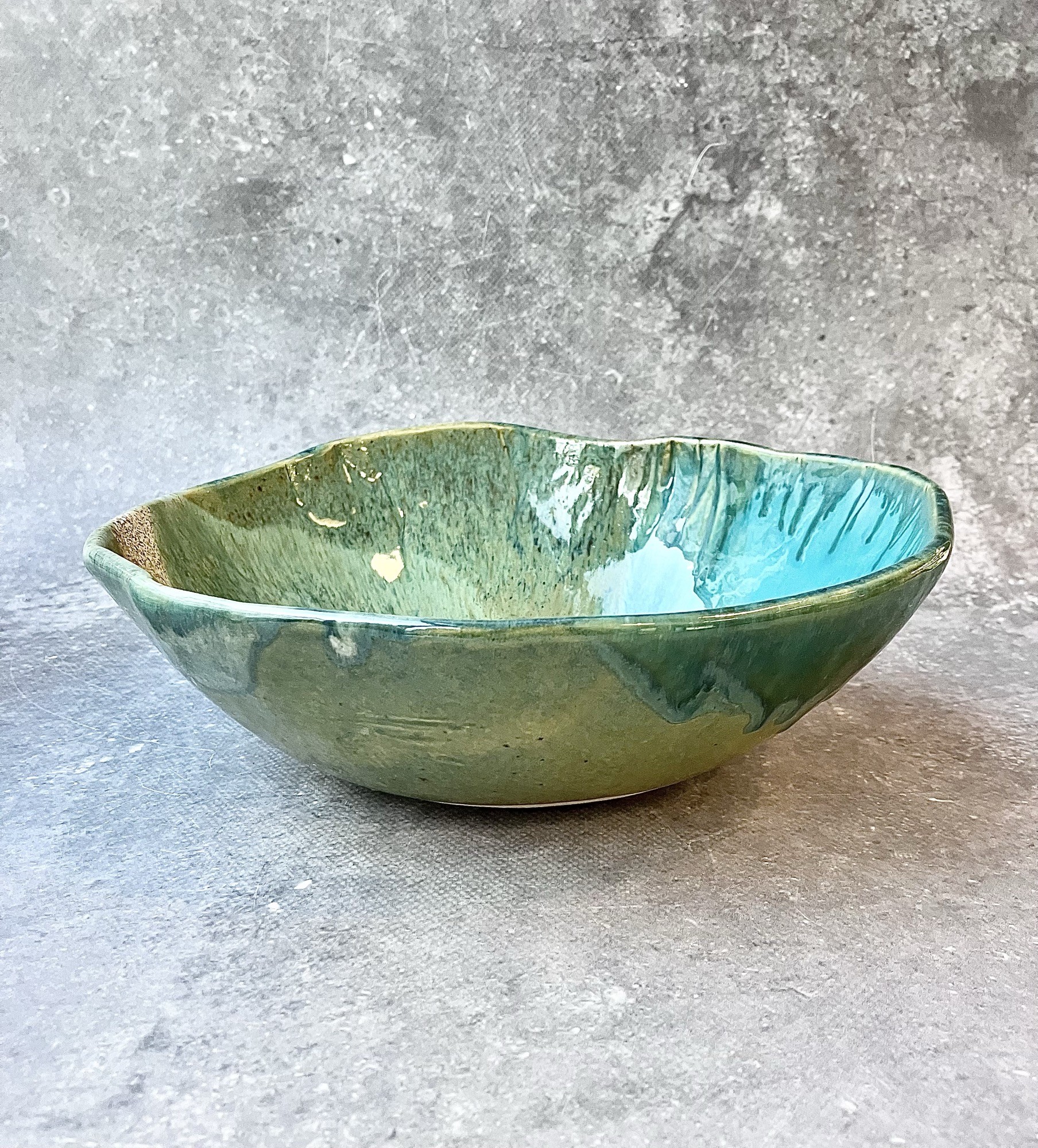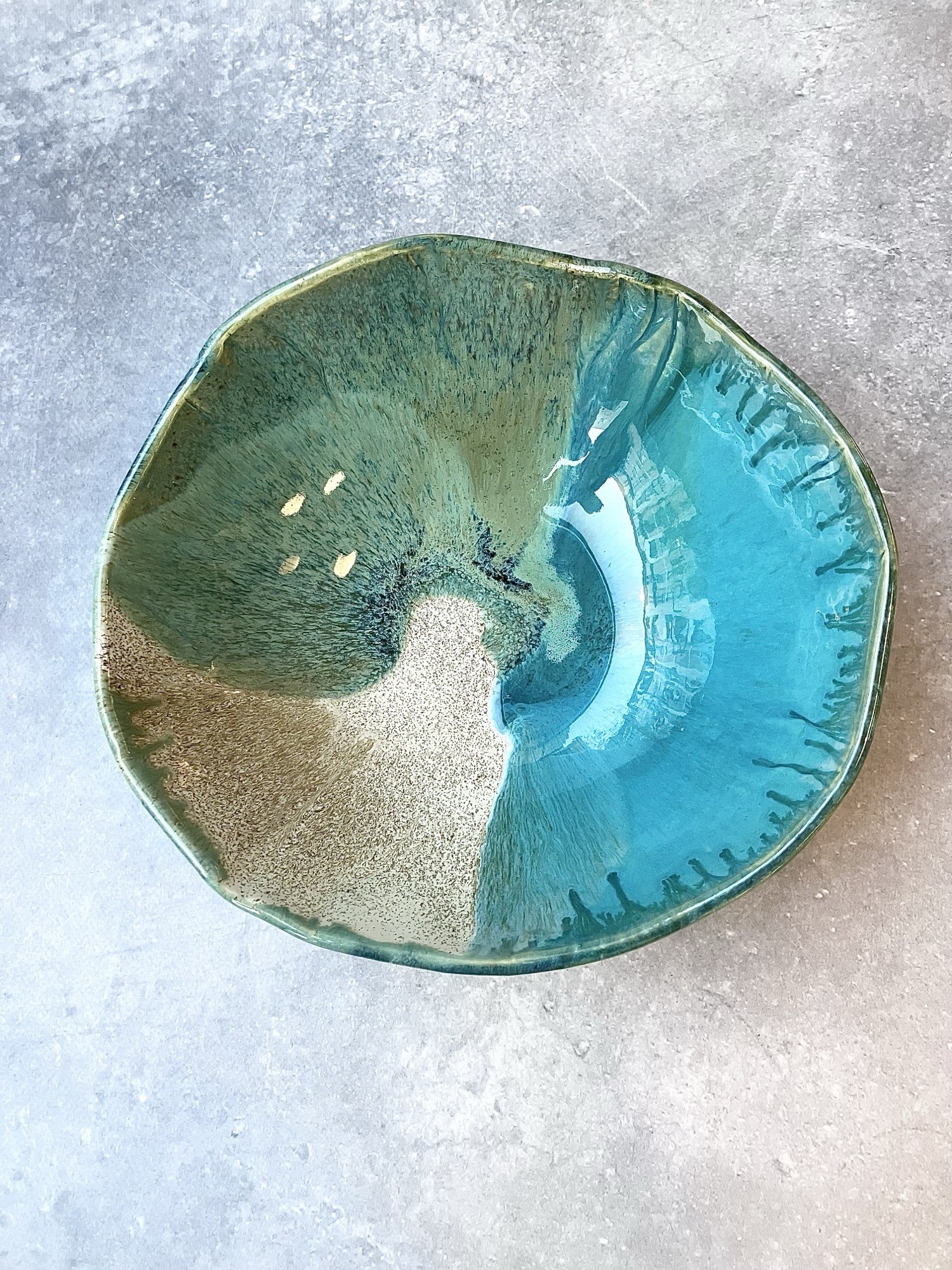 Misa TROPIC to mała podróż w stronę oceanu i ciepłych, letnich krajobrazów. Organiczne przejścia kolorów – od turkusu i morskiej zieleni po piaskowy beż- tworzą niepowtarzalny, malarski efekt inspirowany tropikalną naturą. Delikatne nakrapianie i nieregularna linia szkliwa podkreślają jej ręczne wykonie, dzięki czemu każdy egzemplarz jest jedyny w swoim rodzaju.