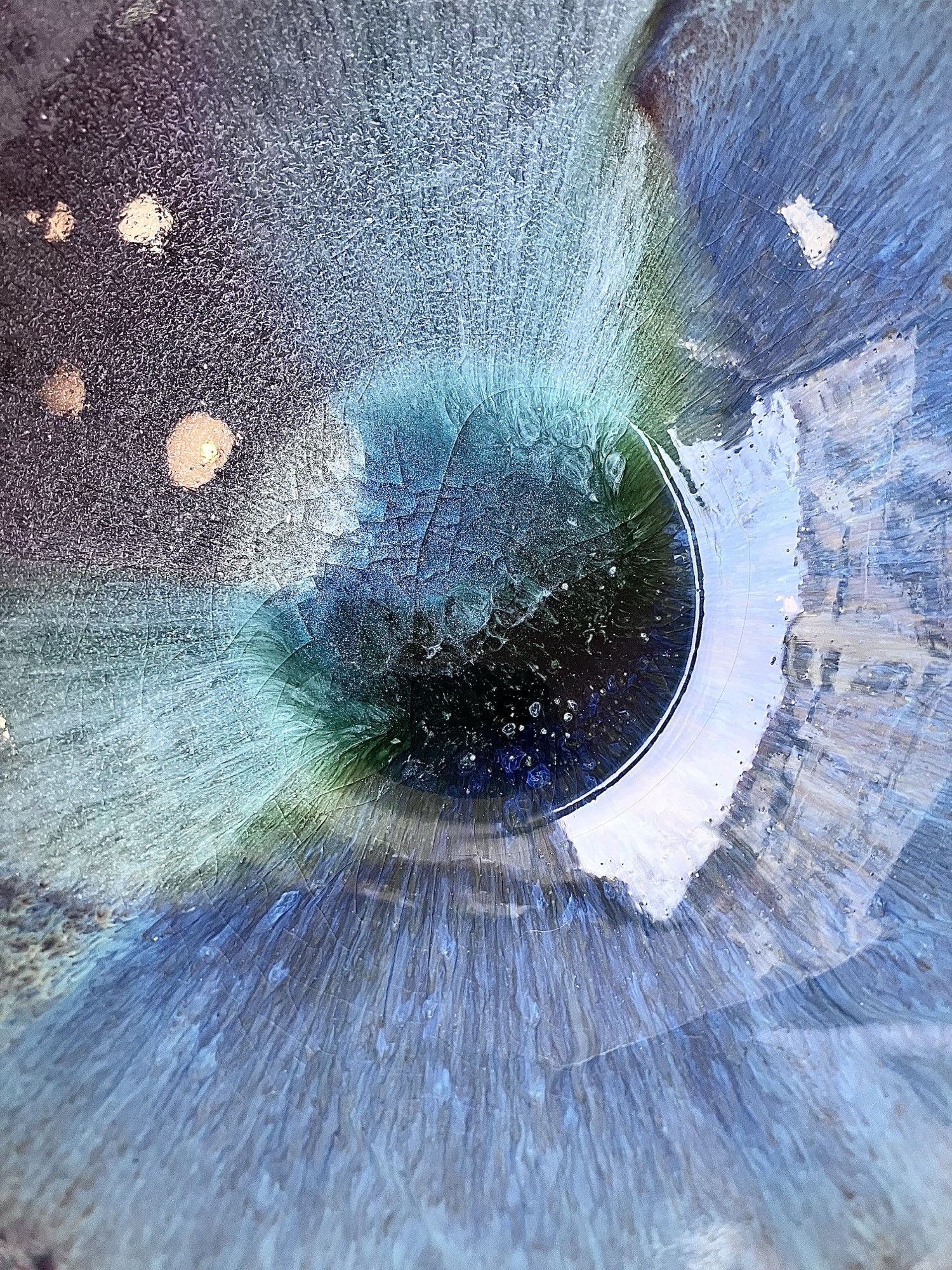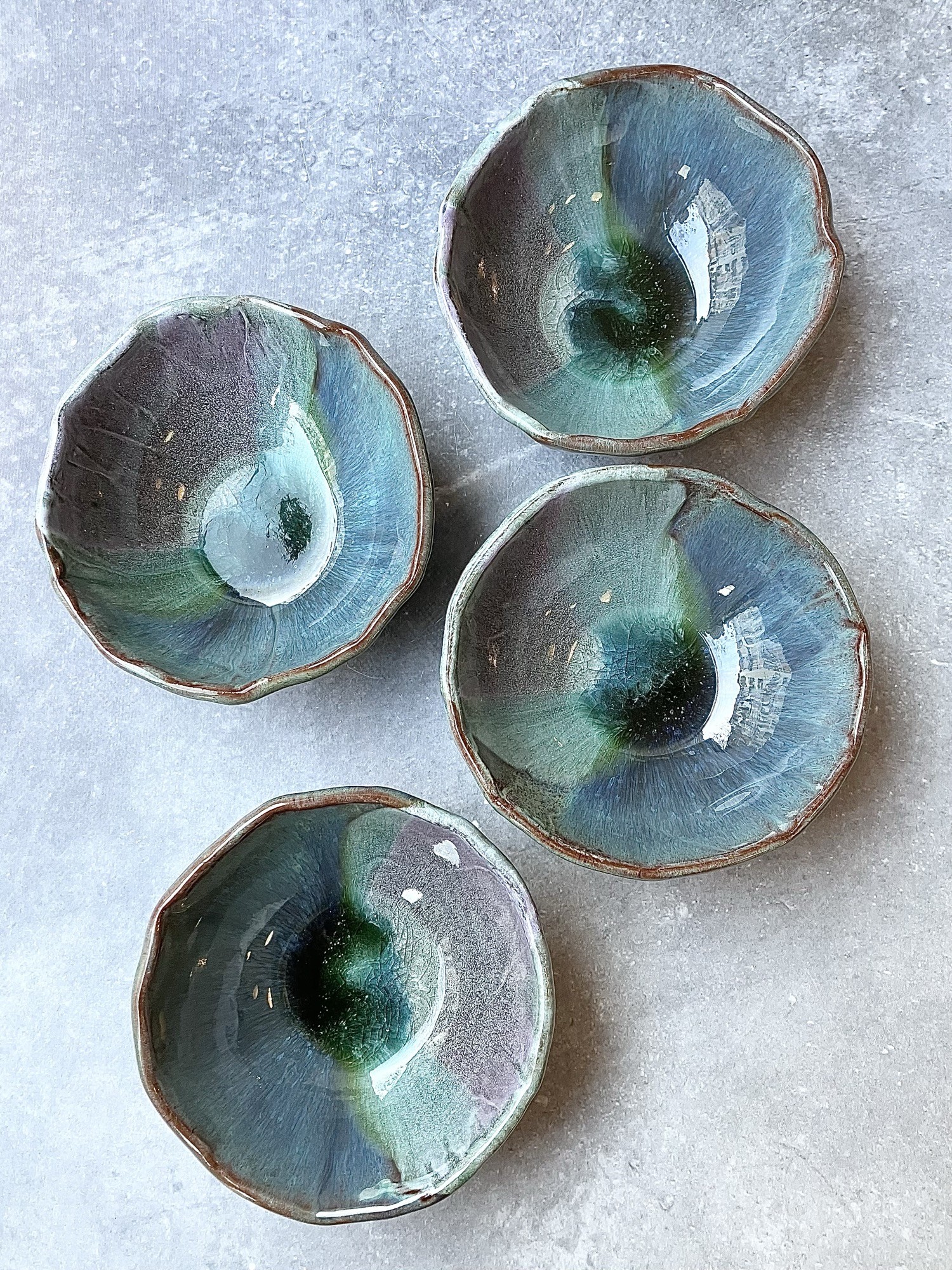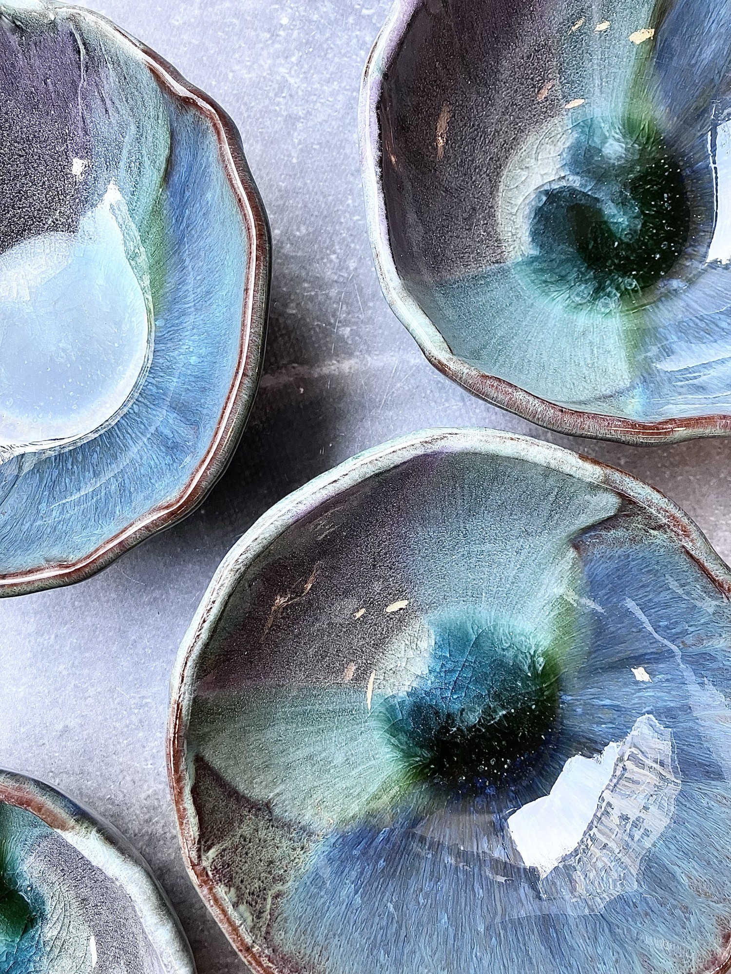 ORGANIC FLOW to seria inspirowana naturalnych ruchem materii- wodą, minerałami i procesami poza ludzką kontrolą. Każda forma powstaje w dialogu z żywiołem ognia, gdzie szkliwo swobodnie rozpływa się, przenika i zatrzymuje w nieprzewidywalnych strukturach, tworząc organiczne pejzaże przypominające przekroje kamieni, głębię oceanu lub mikrokosmos komórkowy. Dominujące odcienie zieleni, błękitu i grafitu płynnie przechodzą jeden w drugi, budując wrażenie ruchu zamkniętego materii. Nieregularne krawędzie i subtelne pęknięcia podkreślają ręczny charakter obiektów oraz ich unikatowość- żaden element serii nie jest identyczny.