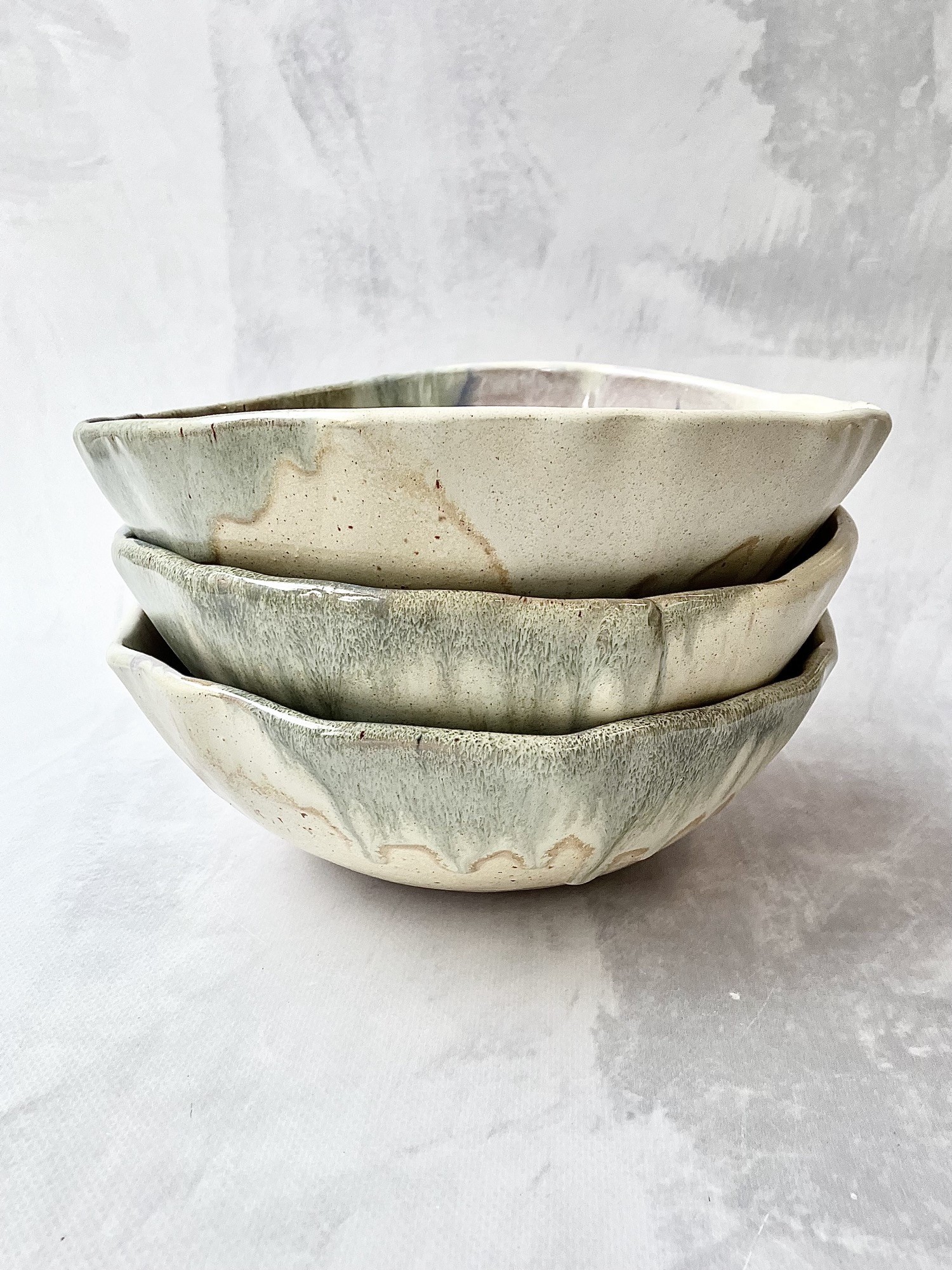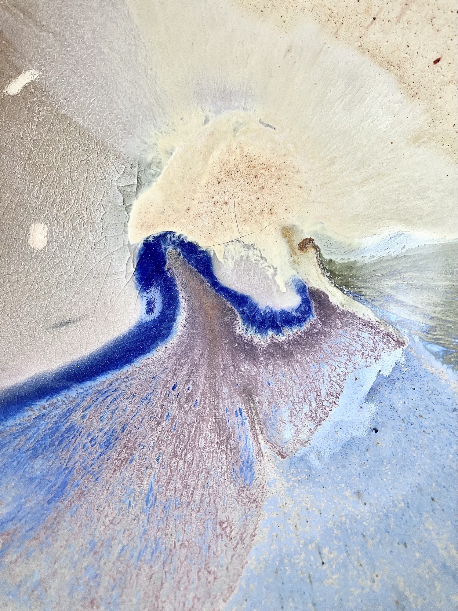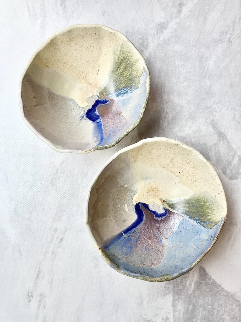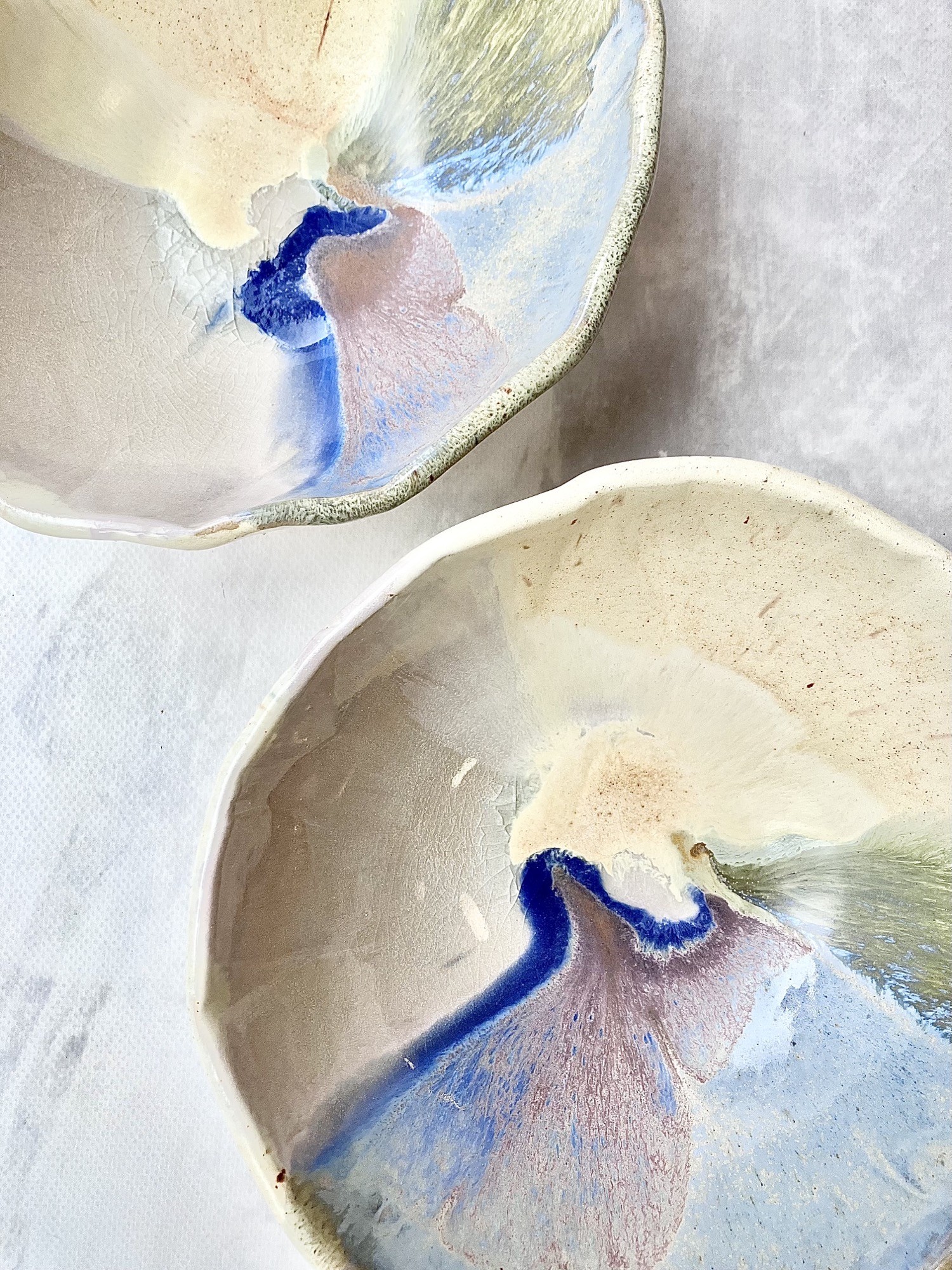 Miska ma nieregularną, naturalną krawędź oraz lekko falującą linię, co podkreśla jej rzemieślniczy charakter. Wnętrze pokryte jest wielowarstwową szkliwną kompozycją z efektem spływów i subtelnego kraklu, dodającym głębi i struktury.
