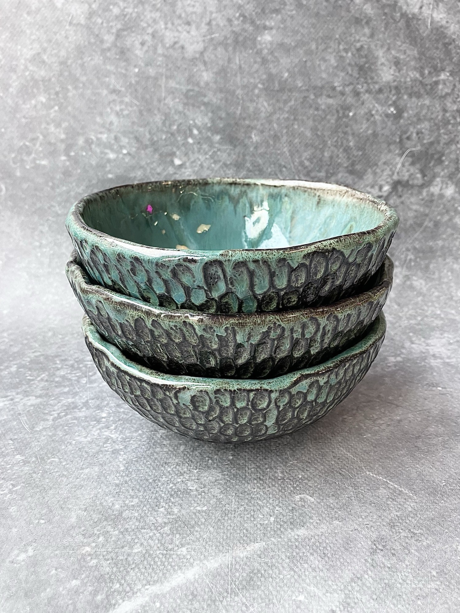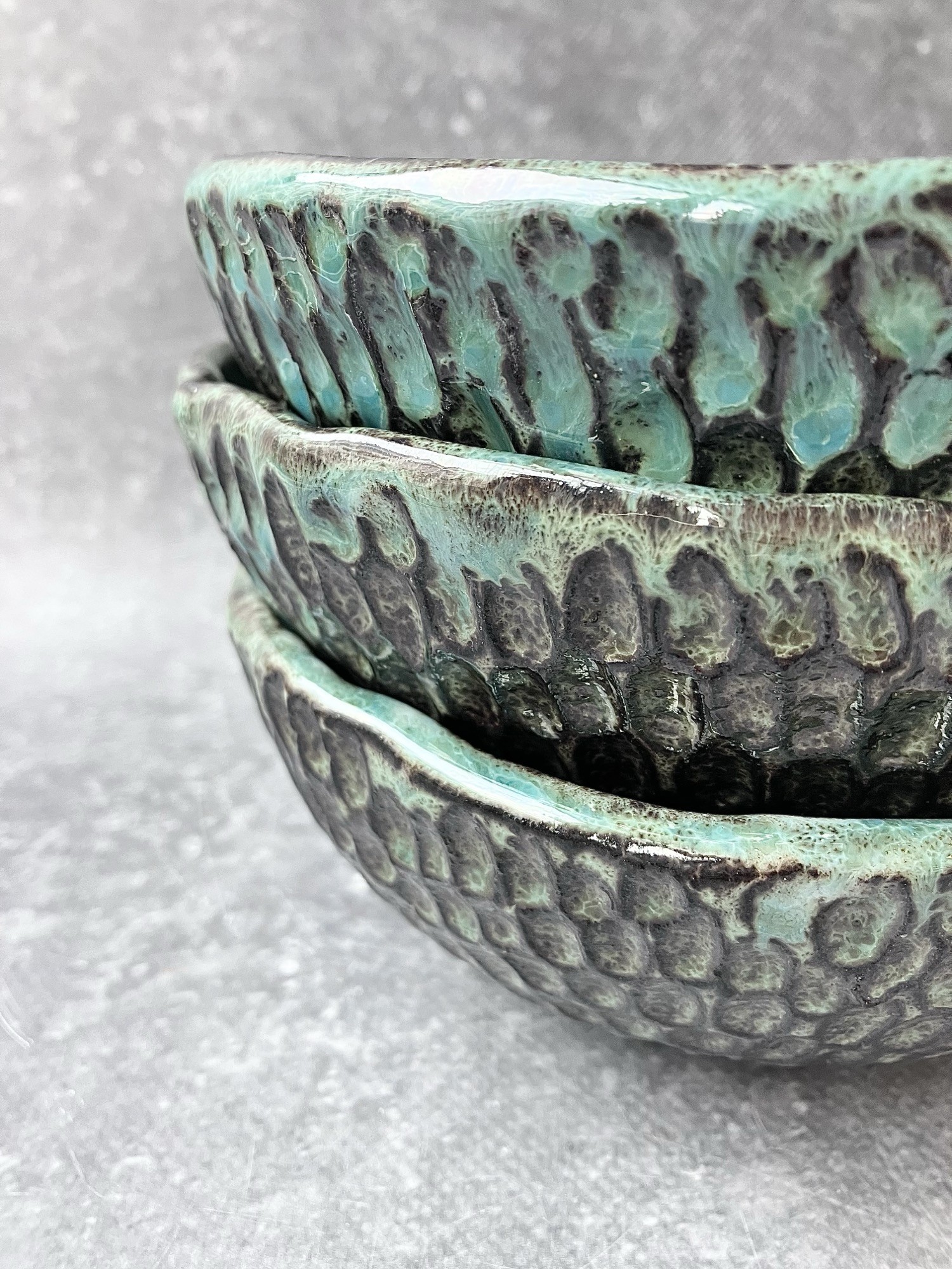 Miseczka LIZARD to unikalny element ceramiczny inspirowany naturą i strukturą gadziej skóry. Jej zewnętrzna, surowa faktura przypomina organiczny wzór łusek, podczas gdy wnętrze zachwyca gładką, turkusową glazurą z efektowymi przejściami kolorystycznymi i charakterystycznym, ciemnym centrum. Każda miseczka jest formowana i szkliwiona ręcznie, dzięki czemu poszczególne egzemplarze różnią się detalami, tworząc kolekcję jedyną w swoim rodzaju.