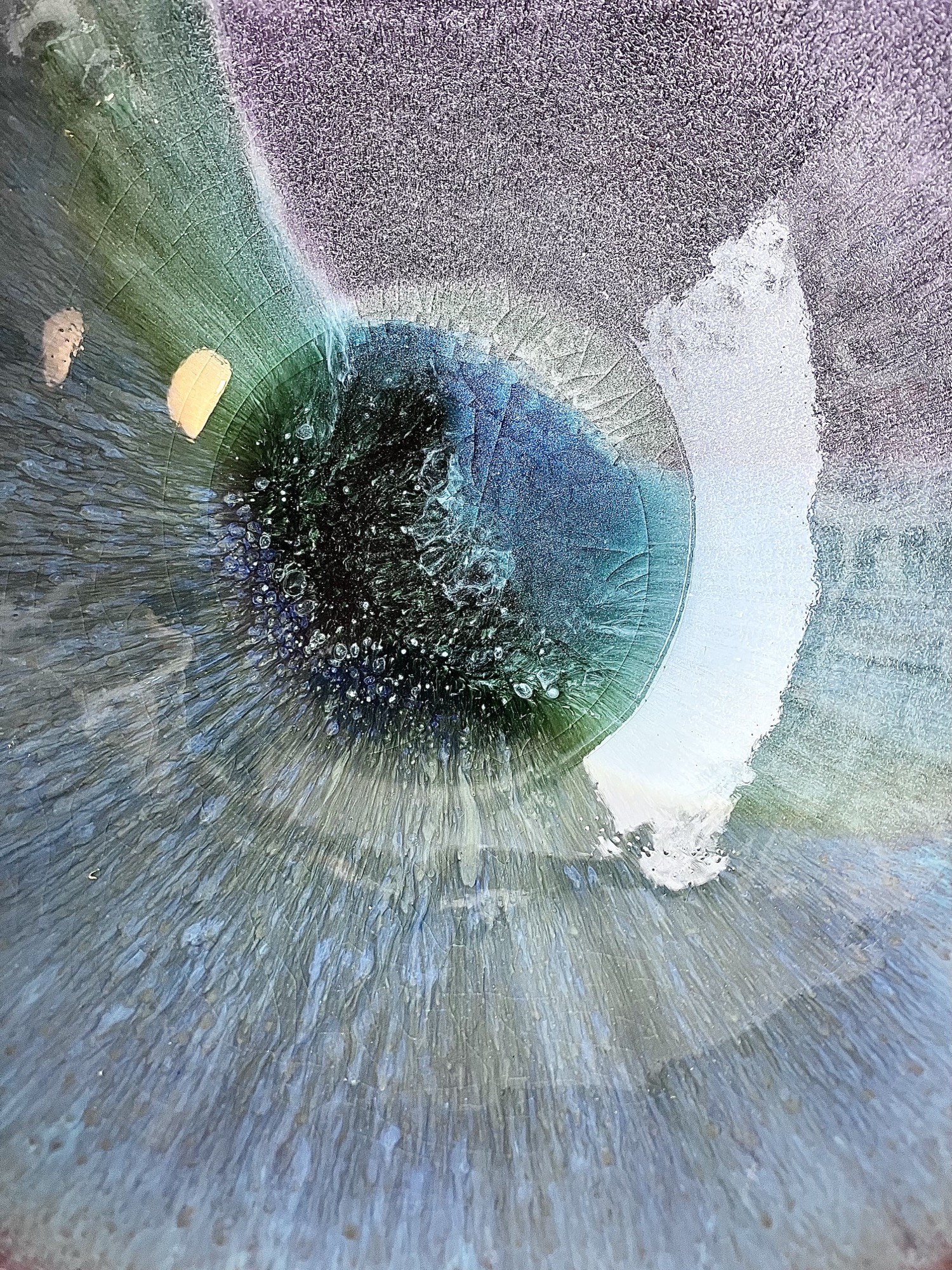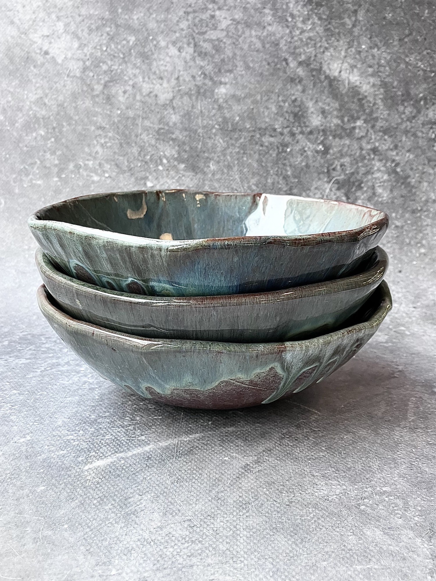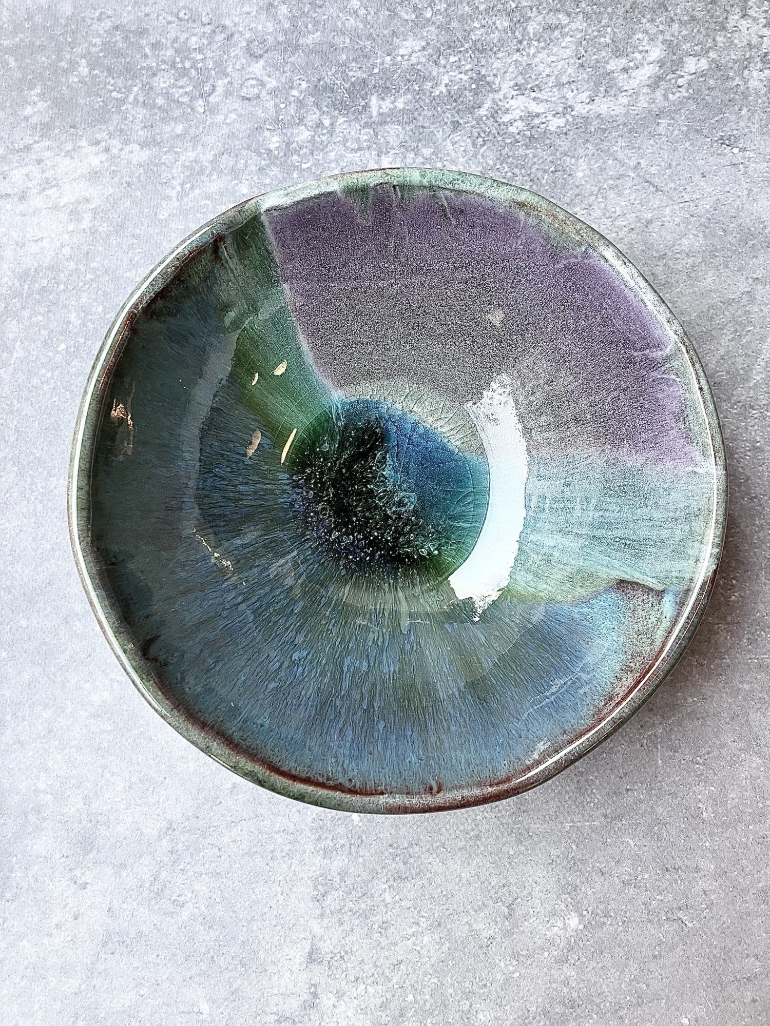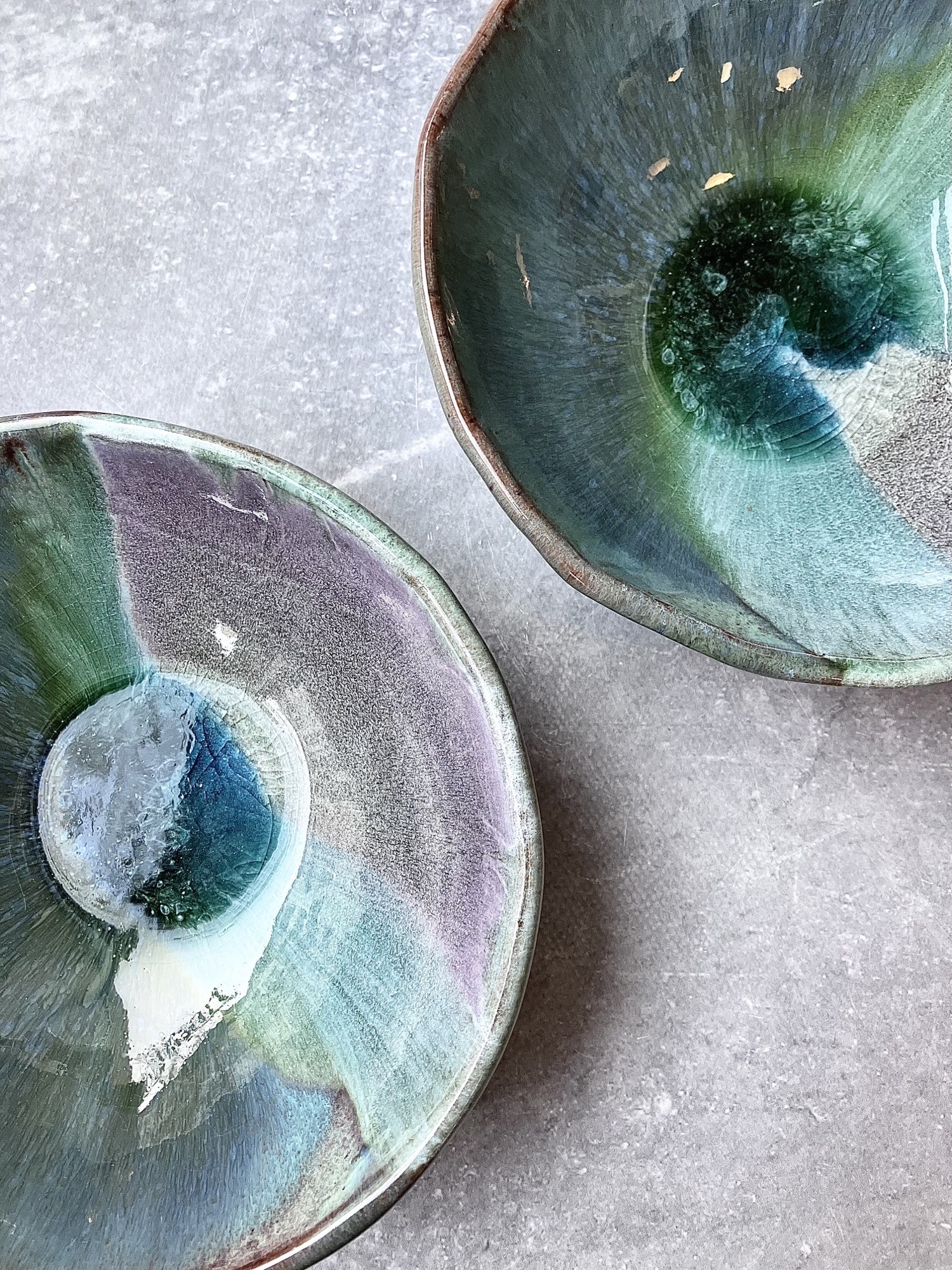 ORGANIC FLOW to seria inspirowana naturalnych ruchem materii- wodą, minerałami i procesami poza ludzką kontrolą. Każda forma powstaje w dialogu z żywiołem ognia, gdzie szkliwo swobodnie rozpływa się, przenika i zatrzymuje w nieprzewidywalnych strukturach, tworząc organiczne pejzaże przypominające przekroje kamieni, głębię oceanu lub mikrokosmos komórkowy. Dominujące odcienie zieleni, błękitu i grafitu płynnie przechodzą jeden w drugi, budując wrażenie ruchu zamkniętego materii. Nieregularne krawędzie i subtelne pęknięcia podkreślają ręczny charakter obiektów oraz ich unikatowość- żaden element serii nie jest identyczny.