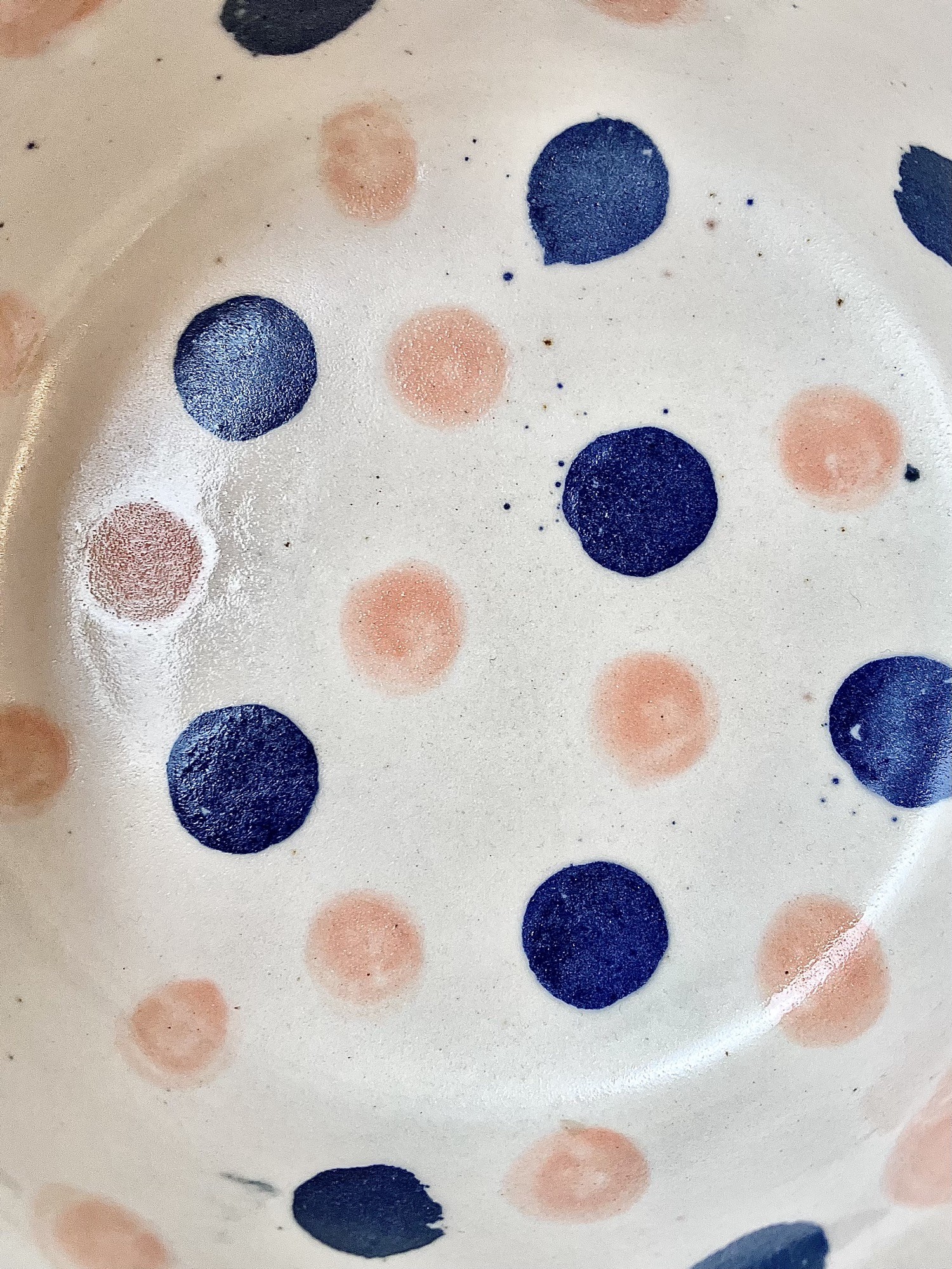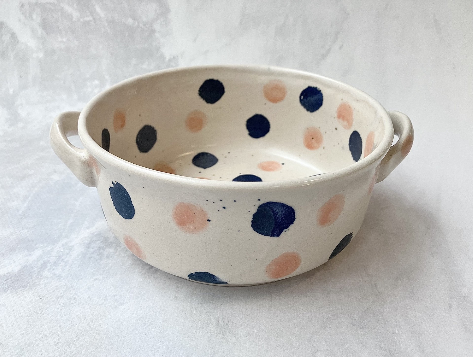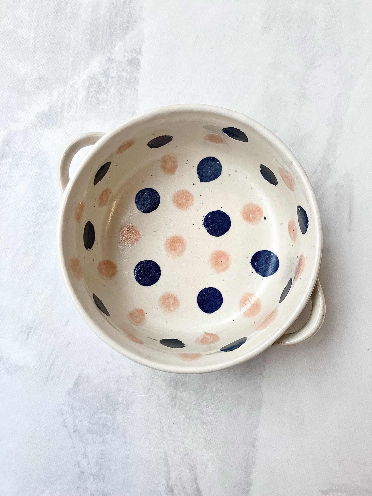 Kamionkowe naczynie do pieczenia zachwyca ręcznym wykonaniem i subtelnym, rzemieślniczym charakterem. Jasna, kremowa glazura została ozdobiona nieregularnymi kropkami w odcieniach brzoskwini i granatu, co nadaje całości lekkości i unikatowego wyglądu- każde naczynie może nieznacznie różnić się detalami.