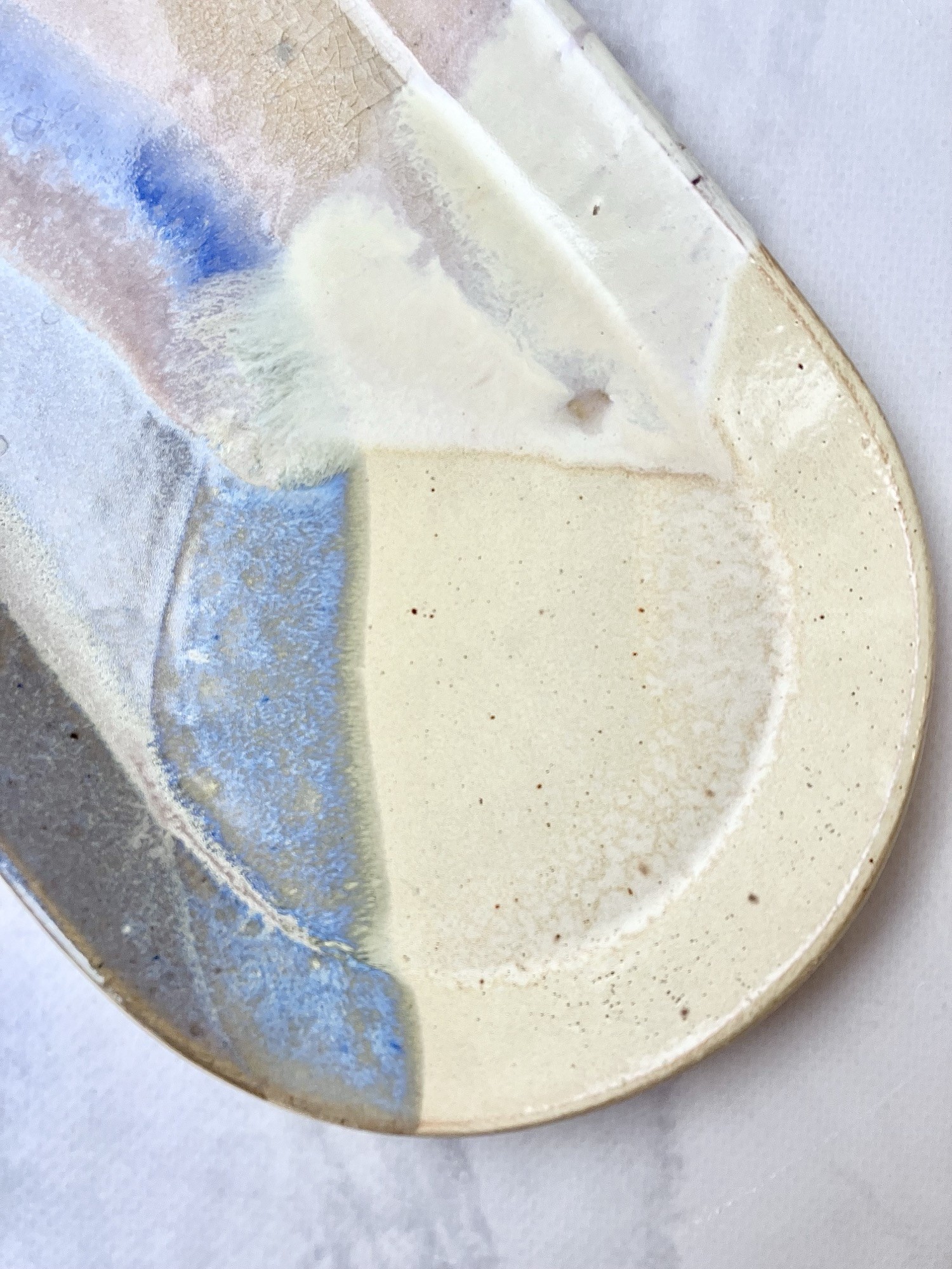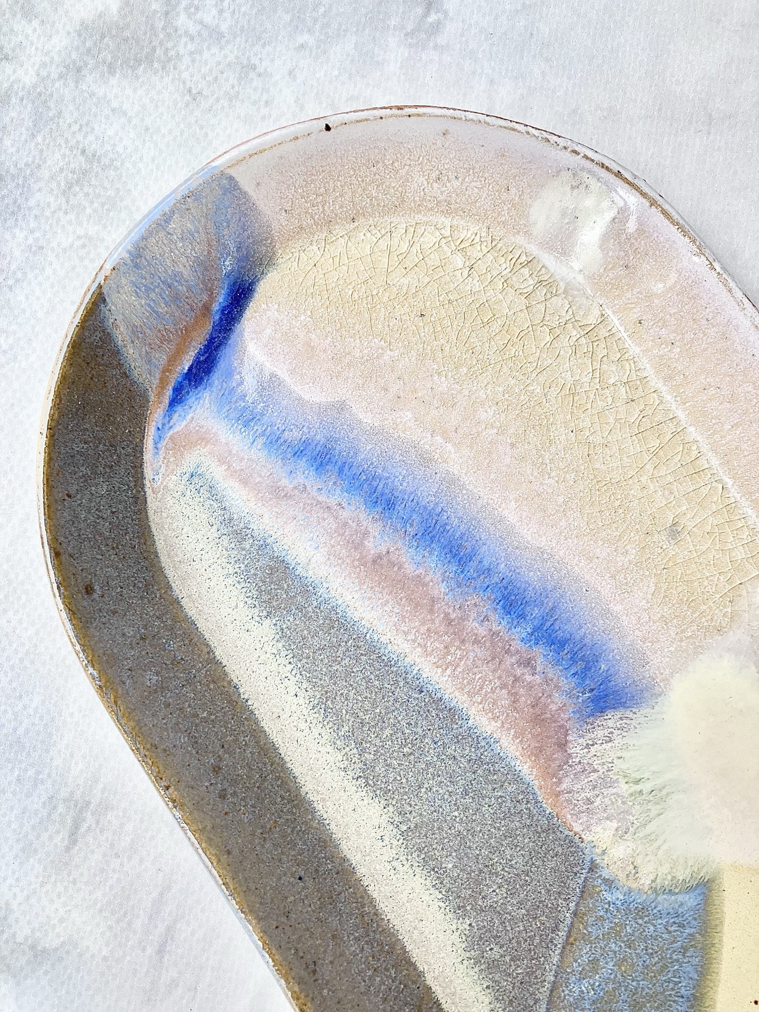 Patera AURORA to unikatowy, ręcznie szkliwiony element ceramiki artystycznej, który łączy w sobie subtelność natury i nowoczesne wzornictwo. Jej owalna forma o długości 28 cm tworzy idealne tło dla malarskiej kompozycji szkliw, w której przenikają się odcienie kremu, jasnego piasku, chłodnego błękitu i intensywnego granatu.
