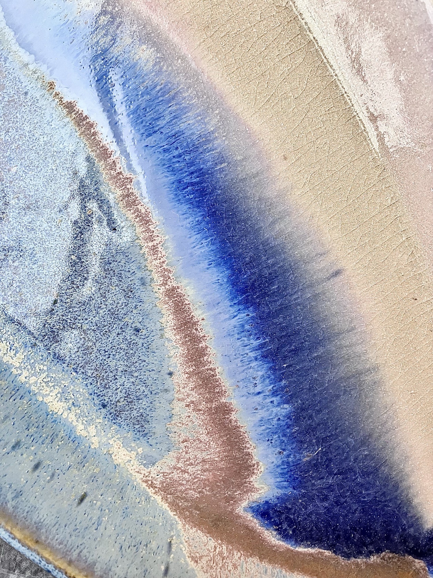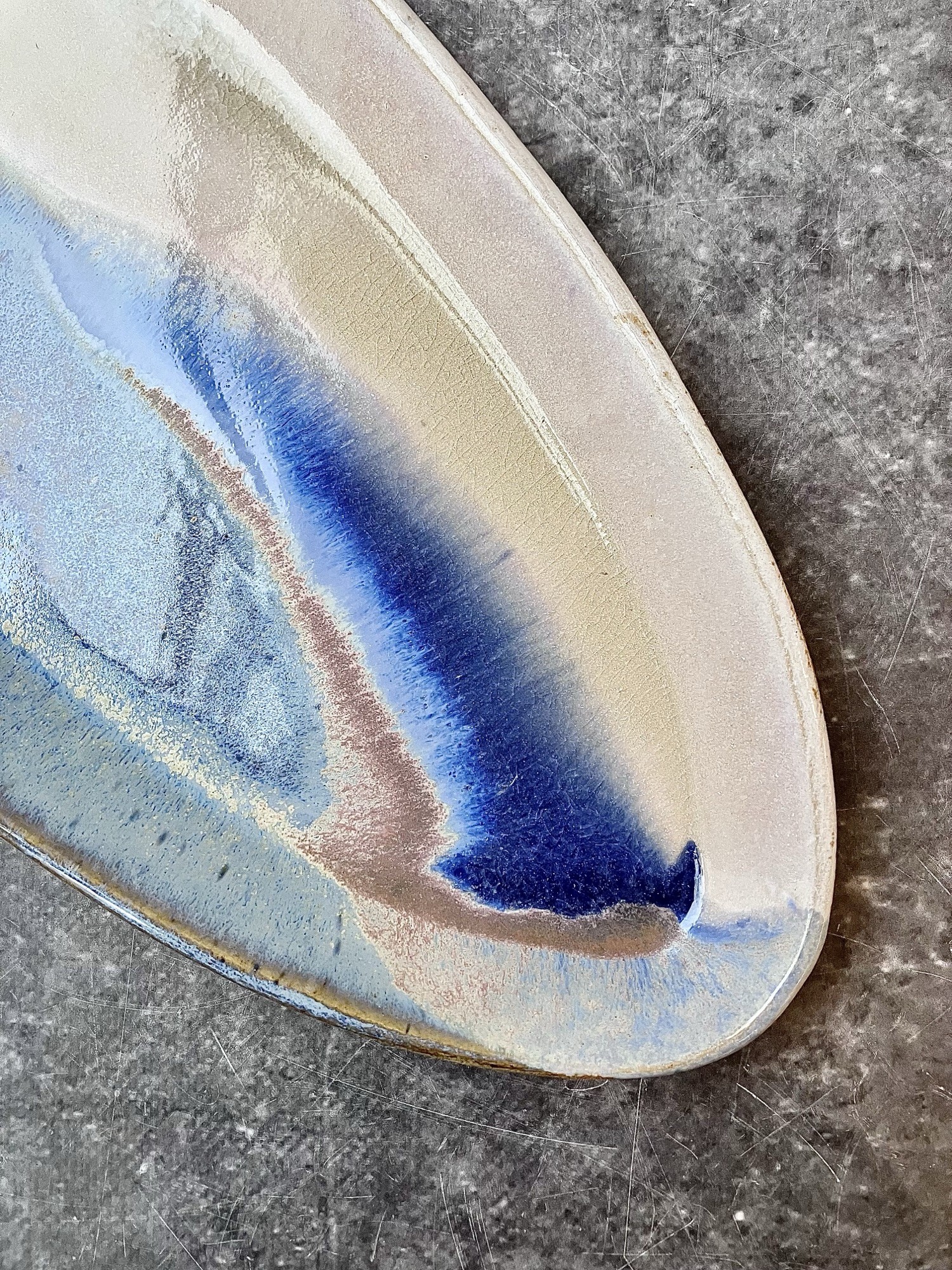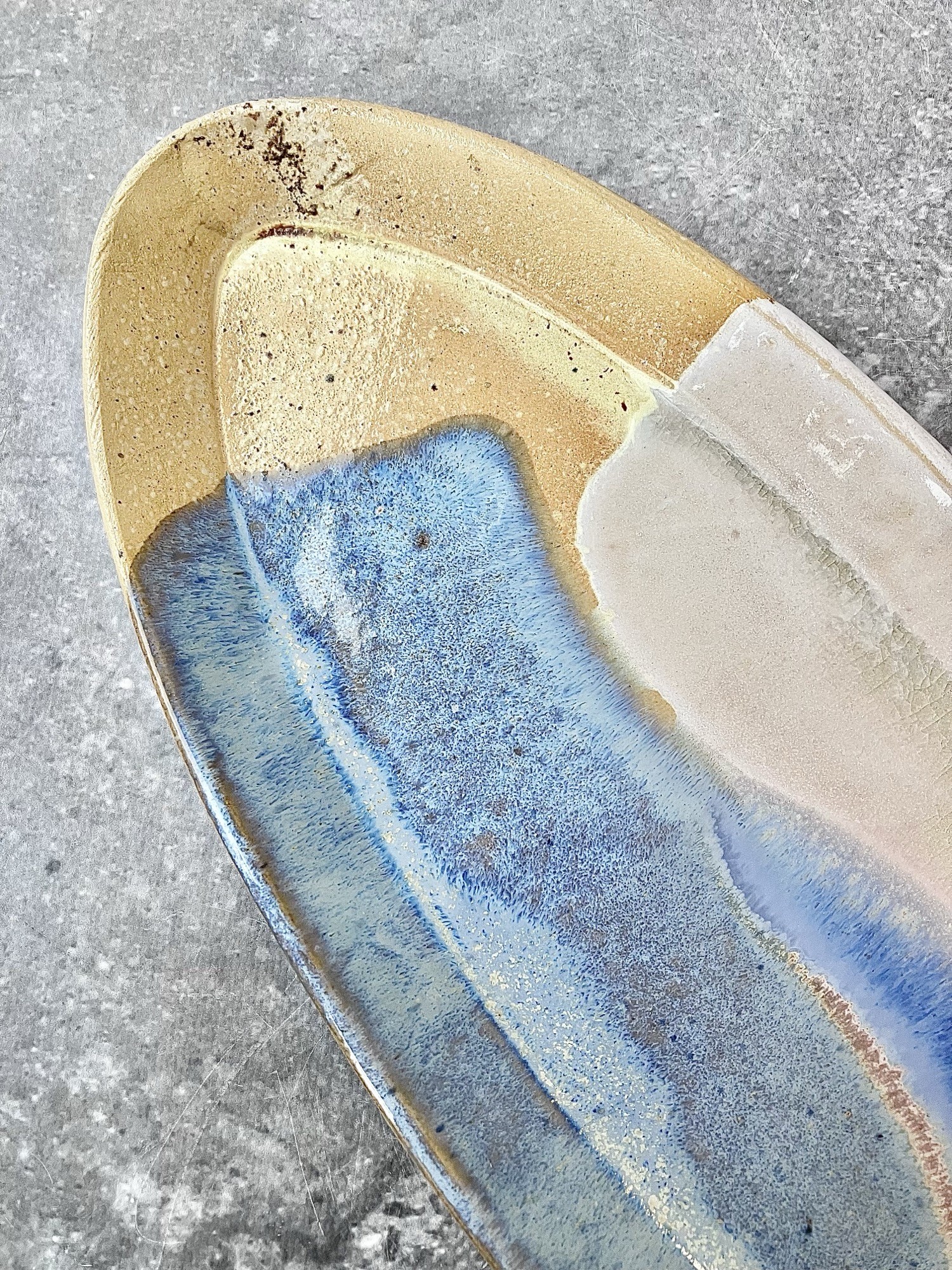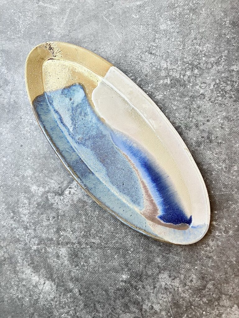 Patera AURORA to unikatowy, ręcznie szkliwiony element ceramiki artystycznej, który łączy w sobie subtelność natury i nowoczesne wzornictwo. Jej owalna forma o długości 35 cm tworzy idealne tło dla malarskiej kompozycji szkliw, w której przenikają się odcienie kremu, jasnego piasku, chłodnego błękitu i intensywnego granatu.