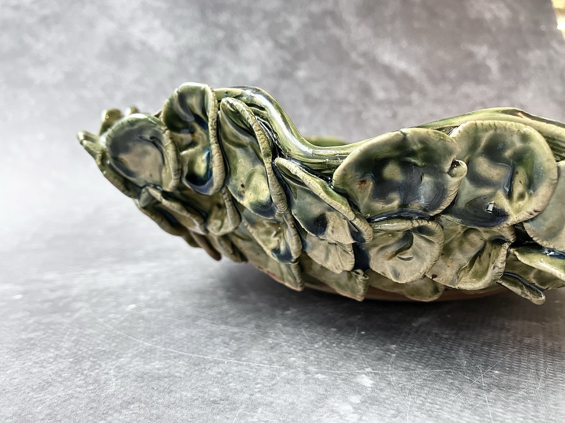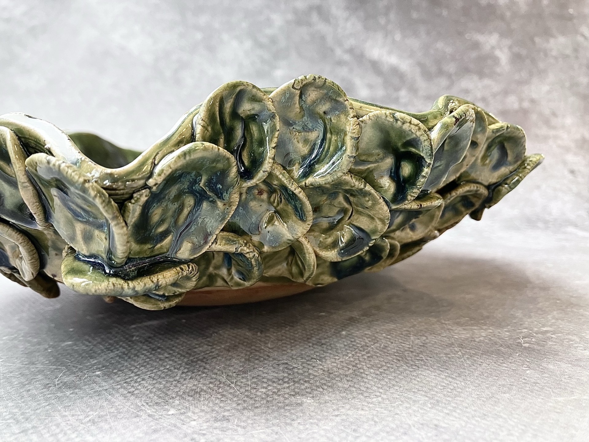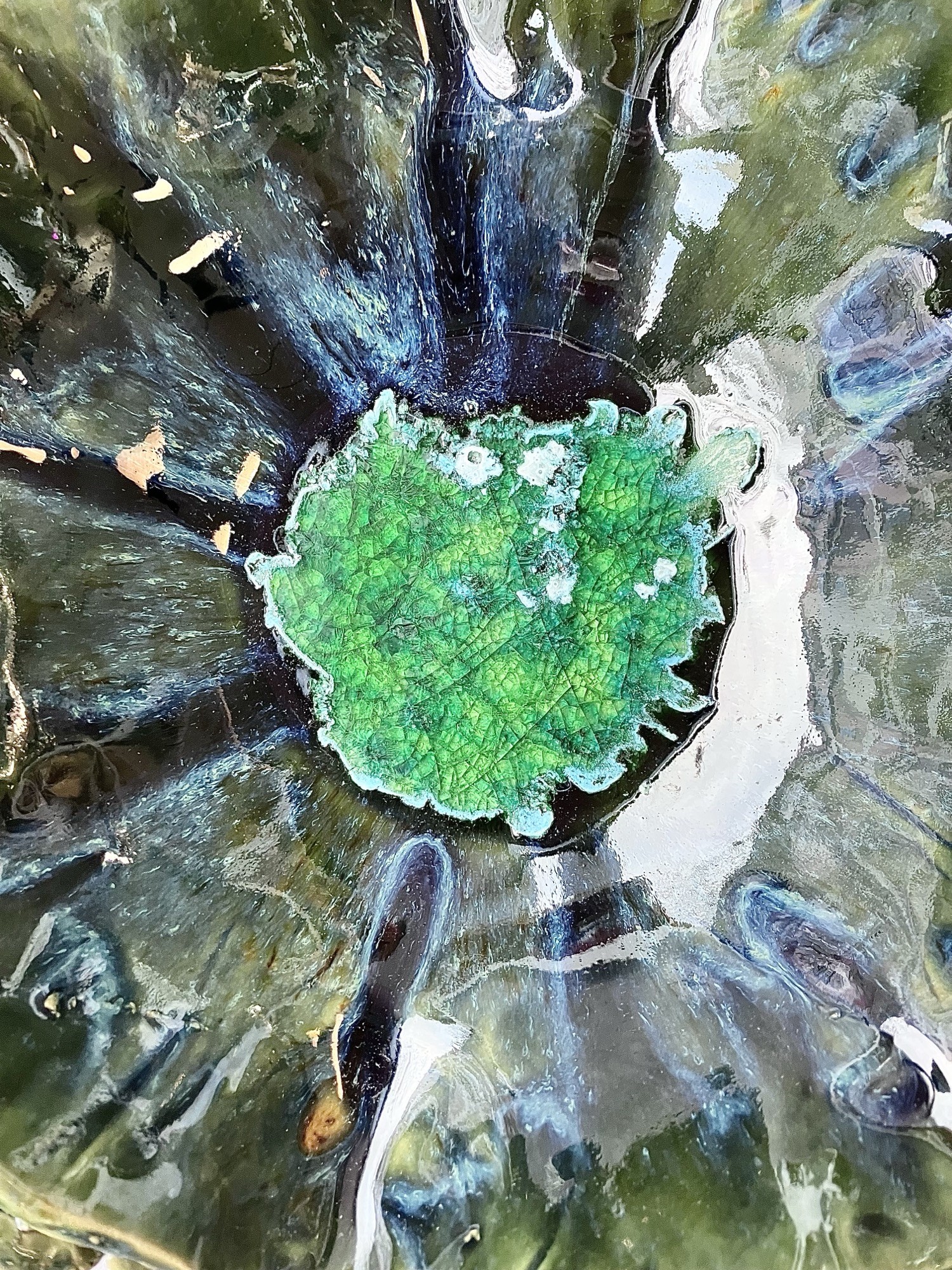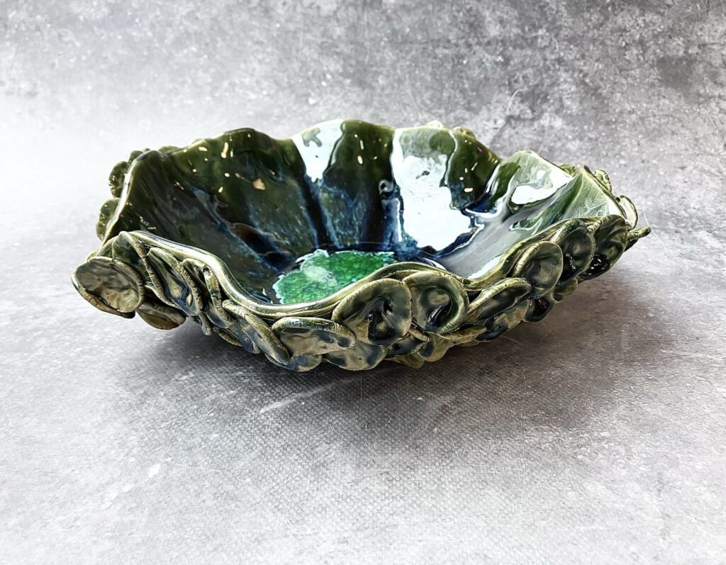 Centralna, szmaragdowa plama o wyraźnej, spękanej strukturze przyciąga wzrok i nadaje formie niemal organiczny charakter- jakby była fragmentem dna morskiego lub zatopionym minerałem. Wnętrze patery płynnie przechodzi w ciemniejsze, chłodne odcienie, tworząc wrażenie ruchu i głębi. Nieregularny, dekoracyjny rant wzmacnia naturalny, rzeźbiarki wyraz obiektu.