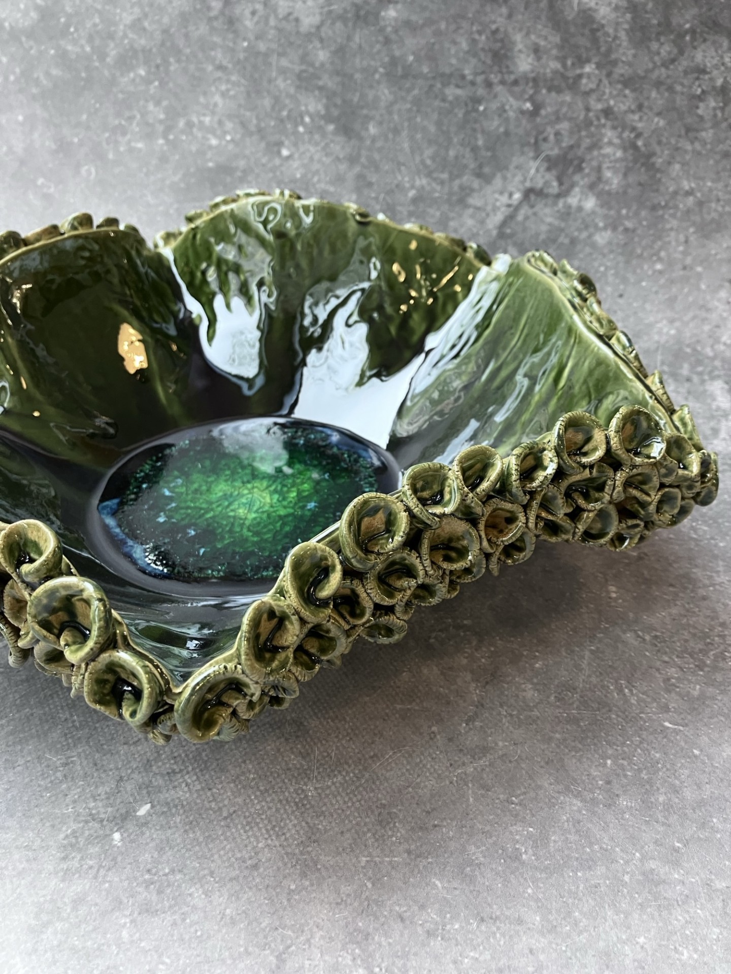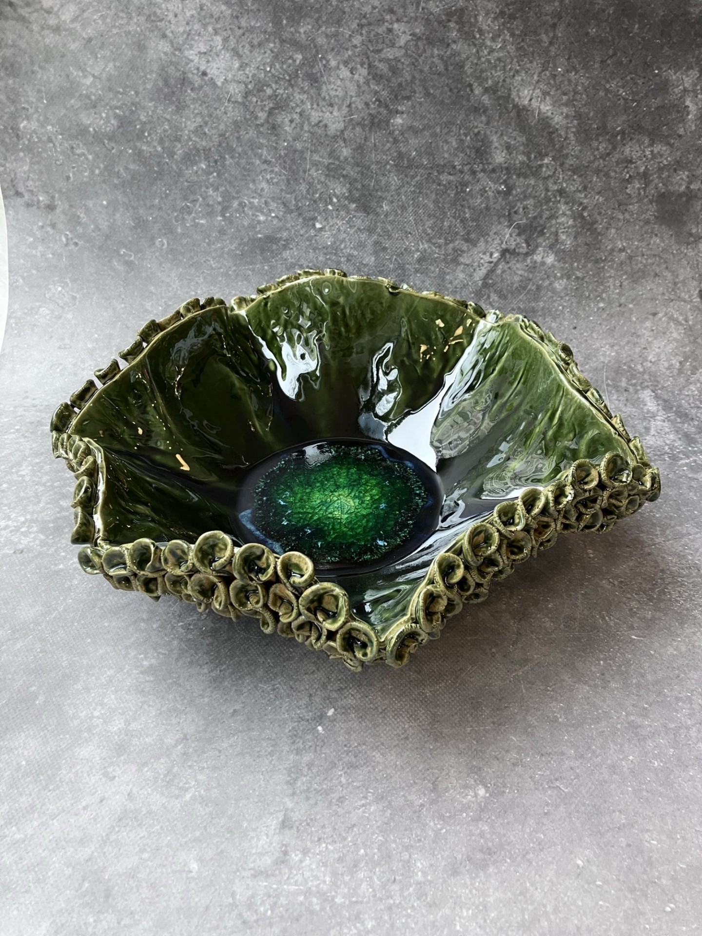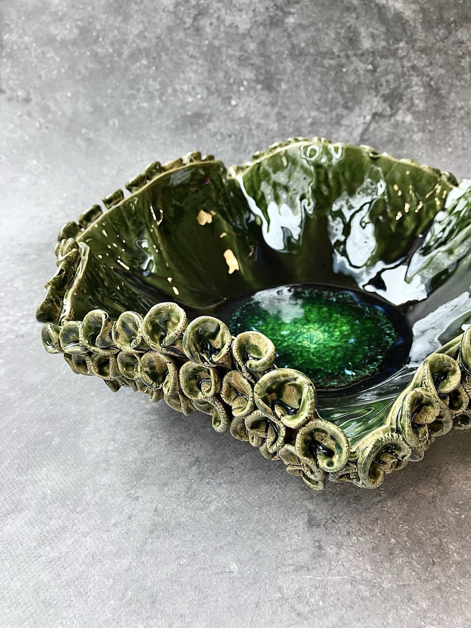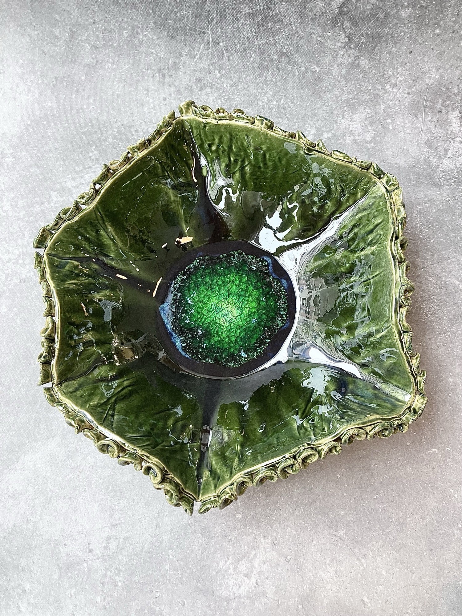 Centralnym punktem patery jest intensywnie zielony, szmaragdowy rdzeń o spękanej, krystalicznej strukturze, przypominającej minerał lub bioluminescencyjne serce oceanu. Otacza go głęboka, wielowymiarowa zieleń przechodząca w ciemniejsze tony, z wysokim połyskiem szkliwa, który podkreśla organiczny charakter formy. Falujące ścianki oraz bogato zdobiony, reliefowy rant przywołują skojarzenia z koralowcem lub muszlą uformowaną przez morskie prądy.