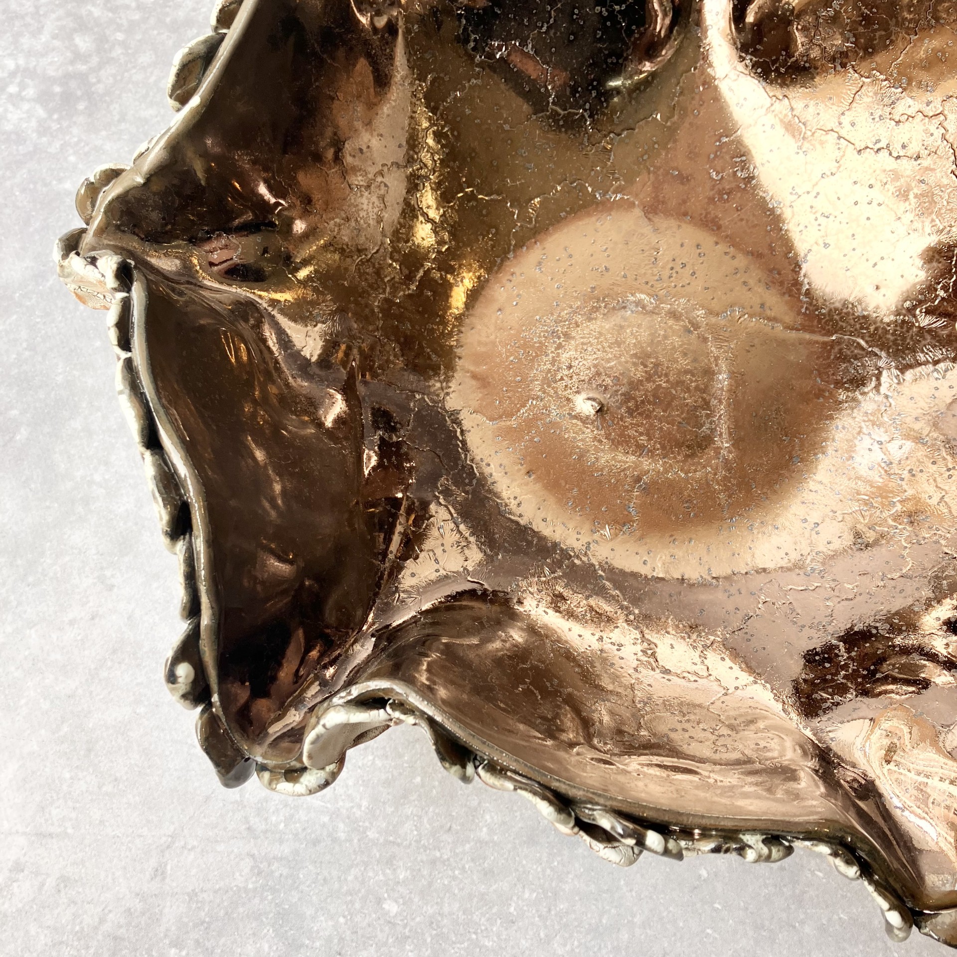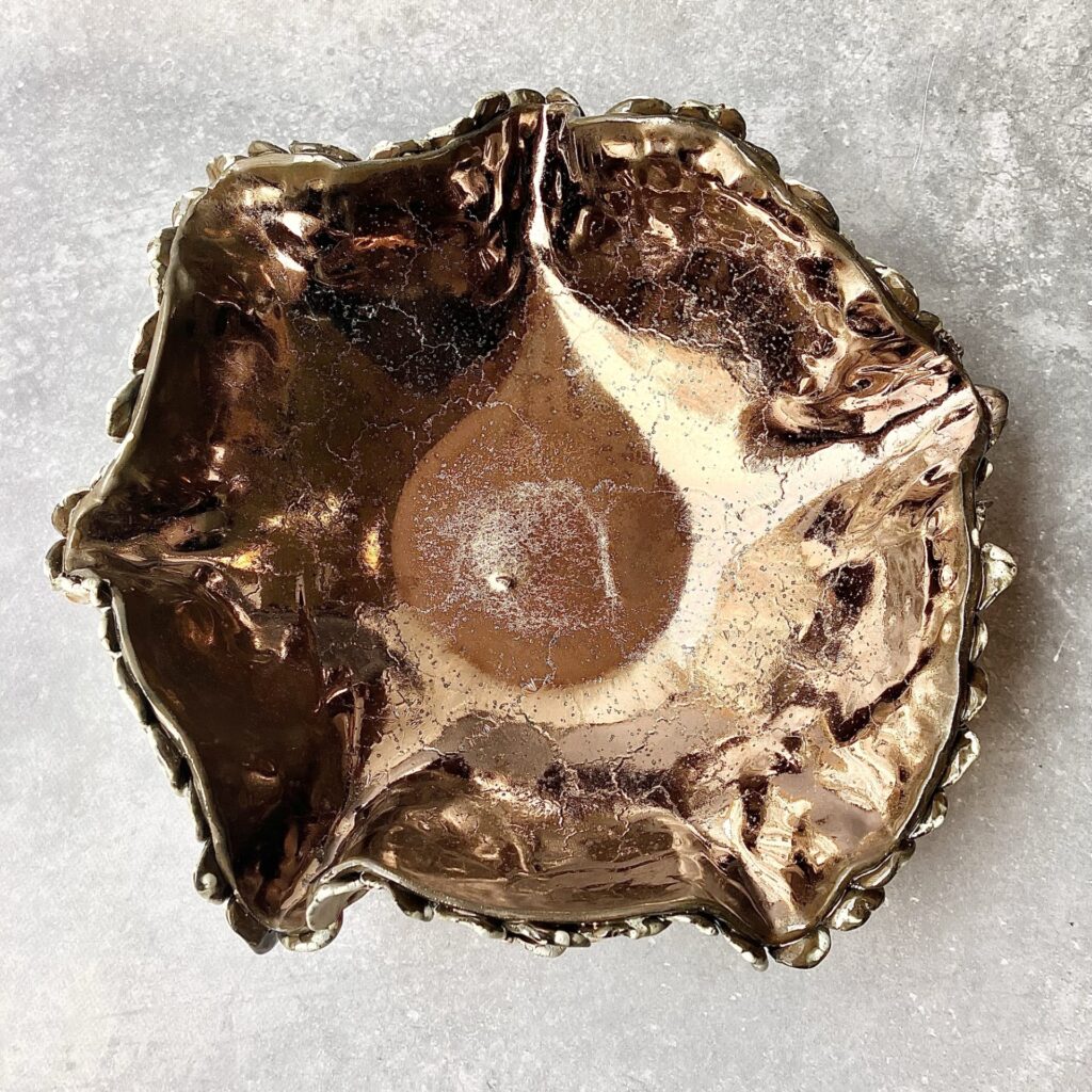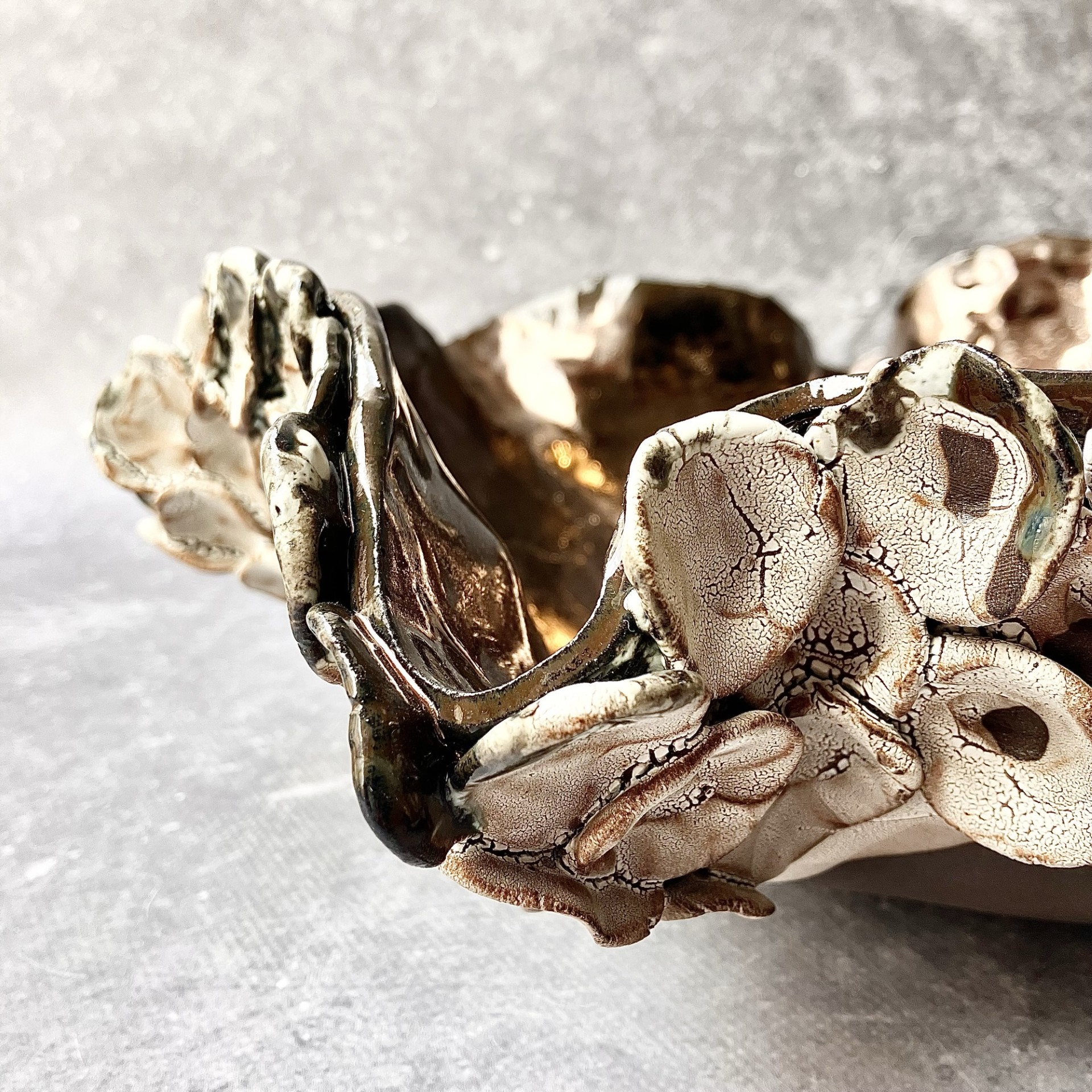 PATERA *DEEP INTO THE SEA. GOLD* to połączenie niezwykłej formy niczym z morskich głębin z pięknym złotym wnętrzem i przejściami bieli i brązu na zewnętrznych zdobieniach. Idealna na owoce lub jako element dekoracyjny w twoim wnętrzu.