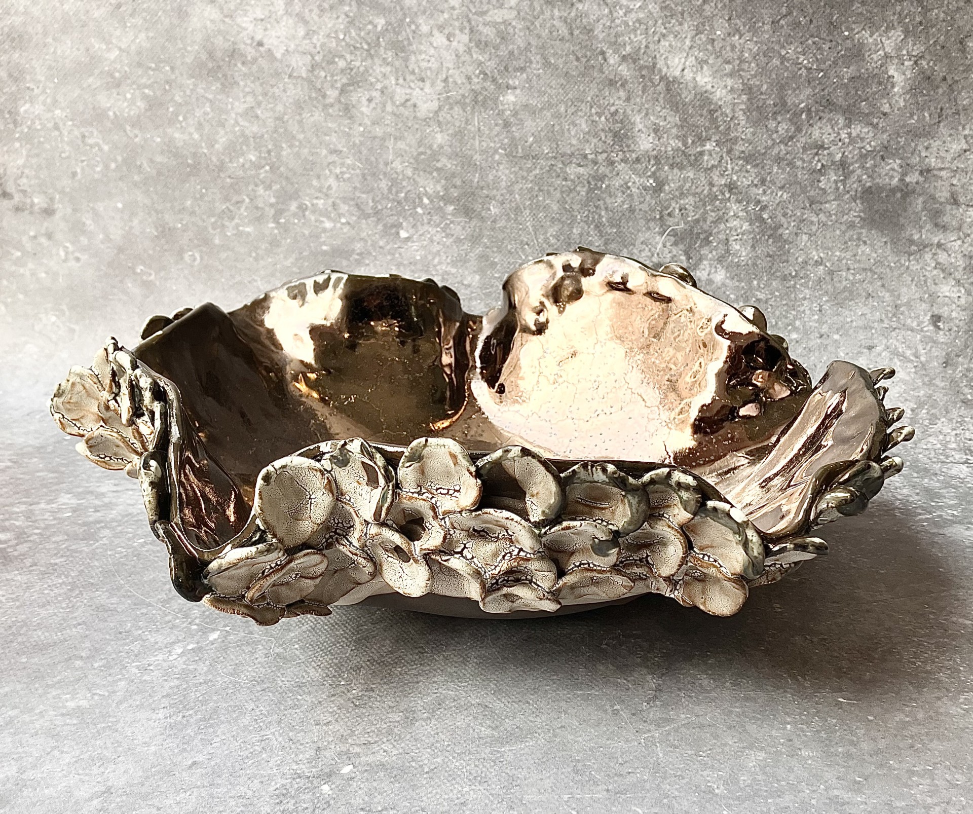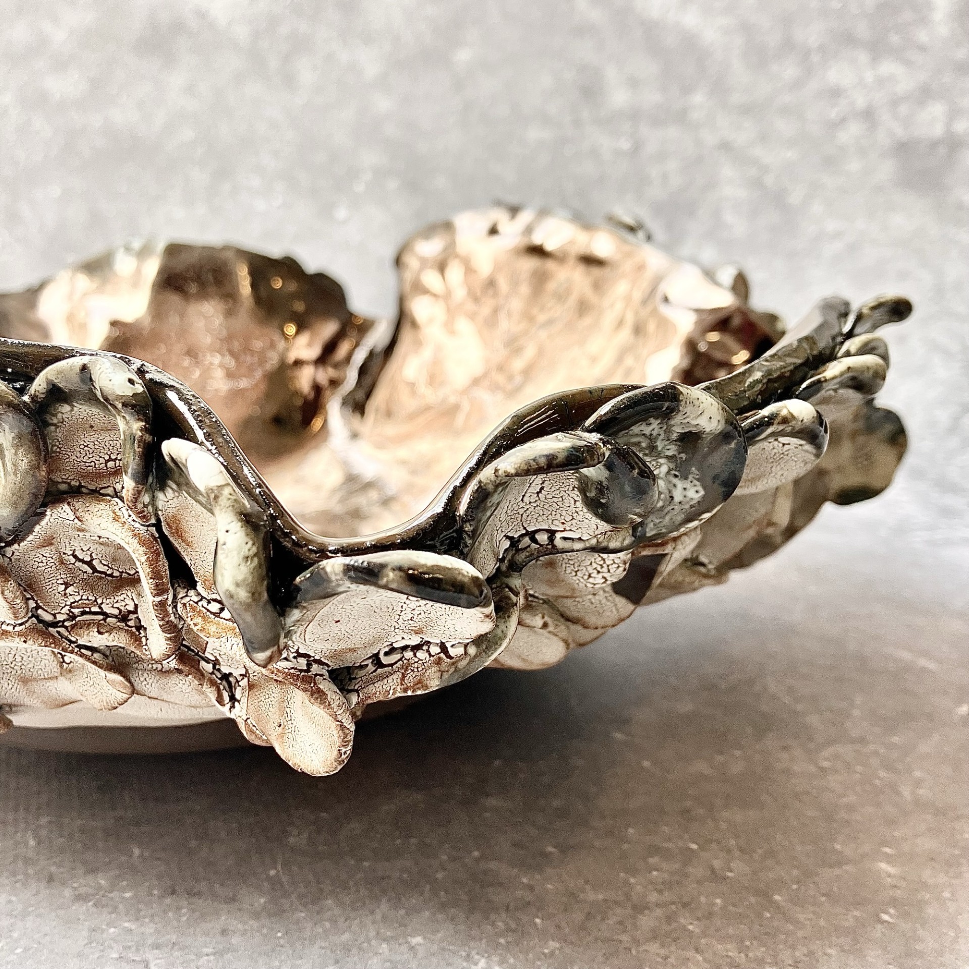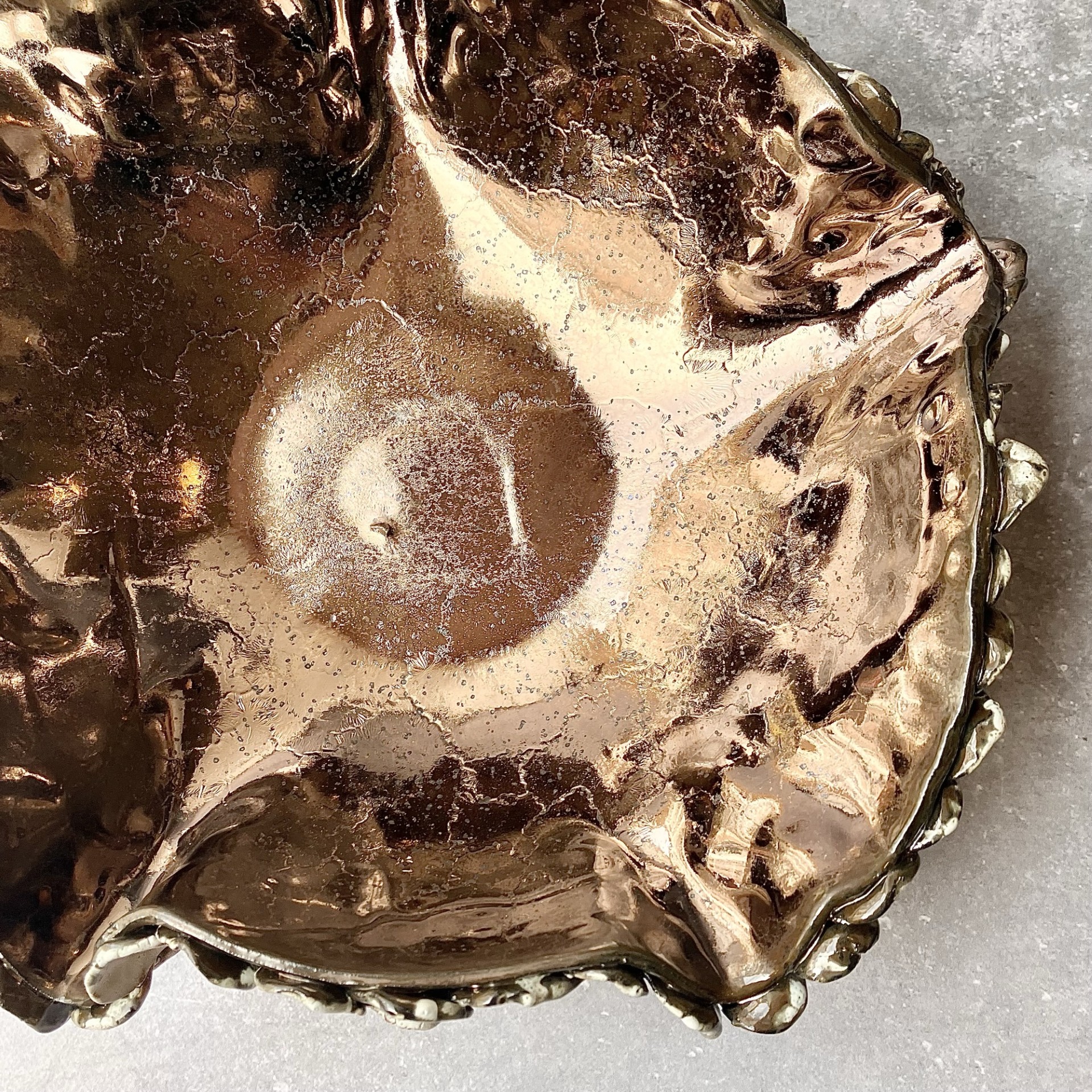 PATERA *DEEP INTO THE SEA. GOLD* to połączenie niezwykłej formy niczym z morskich głębin z pięknym złotym wnętrzem i przejściami bieli i brązu na zewnętrznych zdobieniach. Idealna na owoce lub jako element dekoracyjny w twoim wnętrzu.
