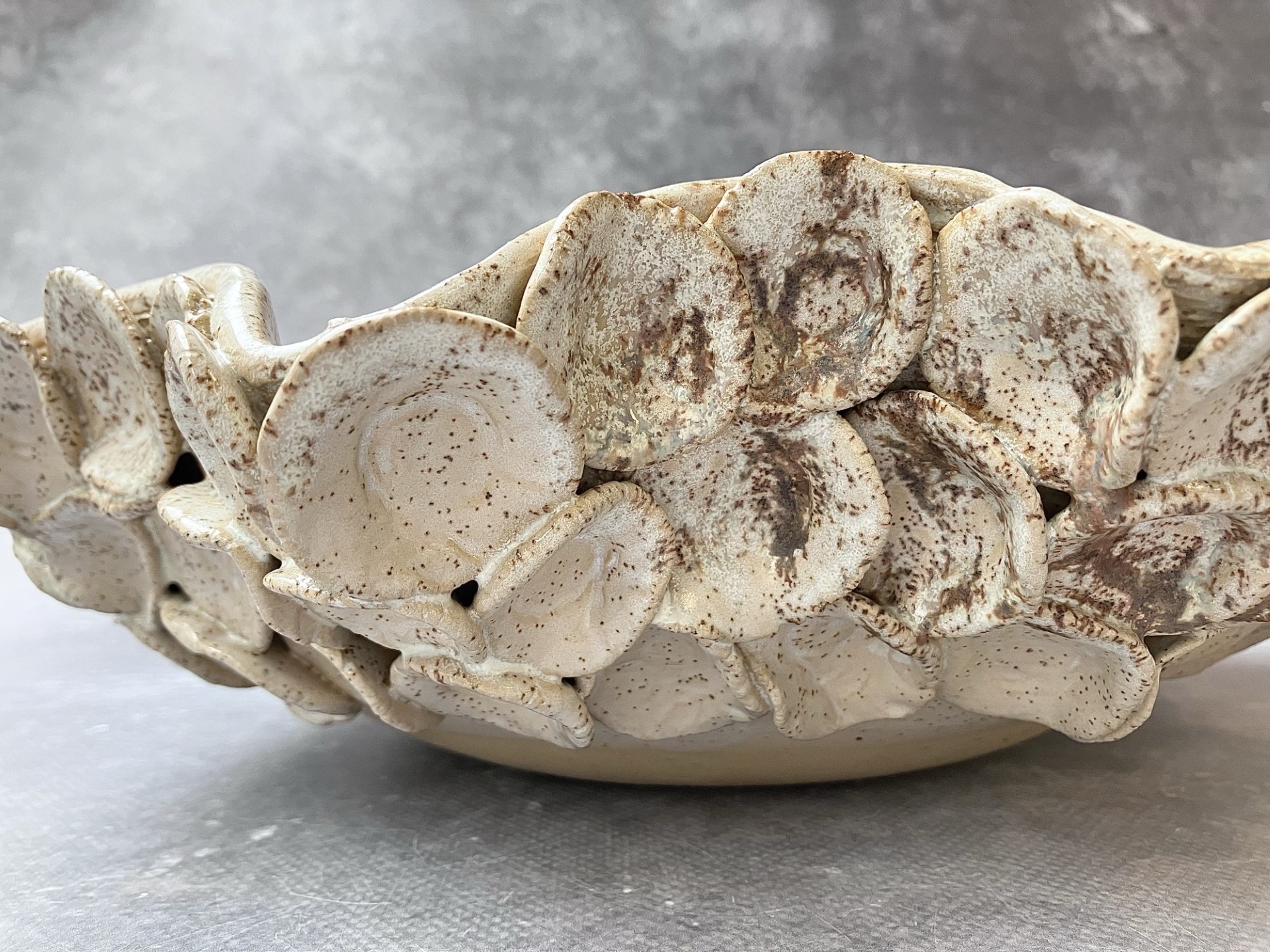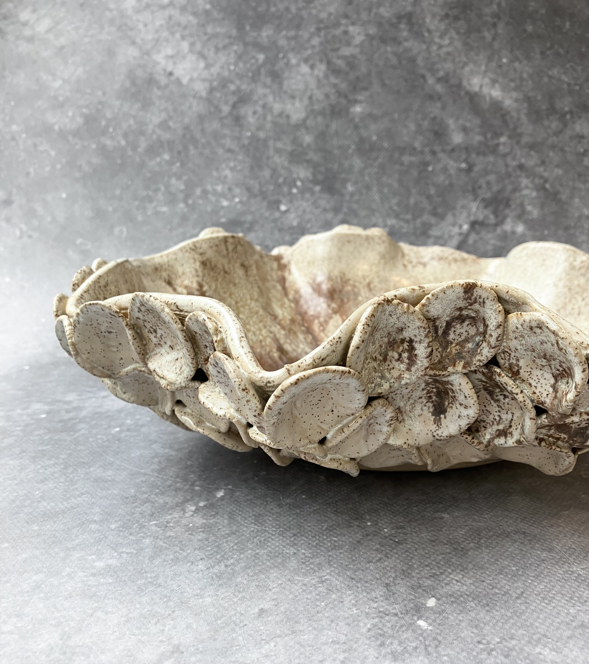 DEEP INTO THE SEA to ręcznie wykonana patera inspirowana podwodnym światem i naturalnymi formami oceanu. Jej nieregularna linia oraz falujący brzeg przywodzą na myśl muszle i morskie skały wygładzone przez wodę. Dekoracyjny rant z organicznych, warstwowych elementów nadaje całości rzeźbiarki charakter i sprawia, że patera jest wyjątkowa z każdej strony.