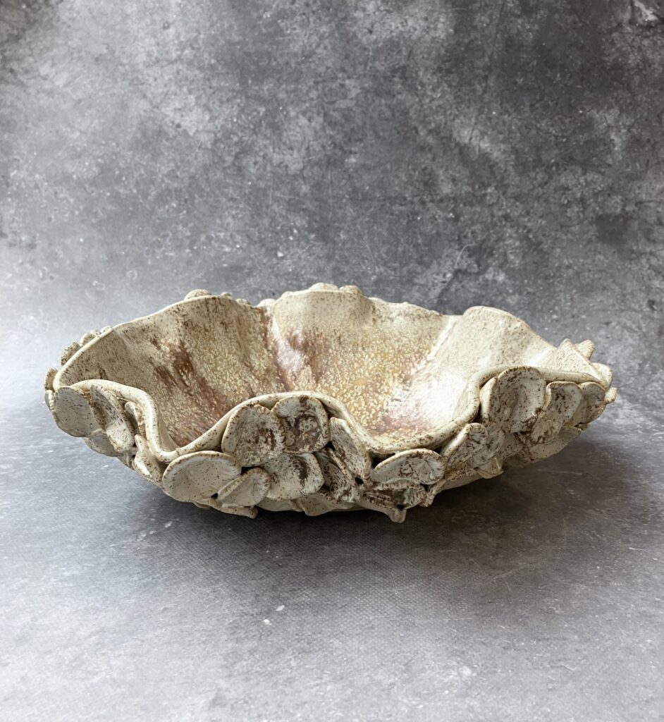 Powierzchnia utrzymana jest w subtelnej, kremowo-piaskowej tonacji z delikatnymi, brunatnymi przebarwieniami, które przypominają naturalne osady i morską patynę. Szkliwo tworzy niepowtarzalne przejścia kolorystyczne- każda patera jest jedyna w swoim rodzaju.