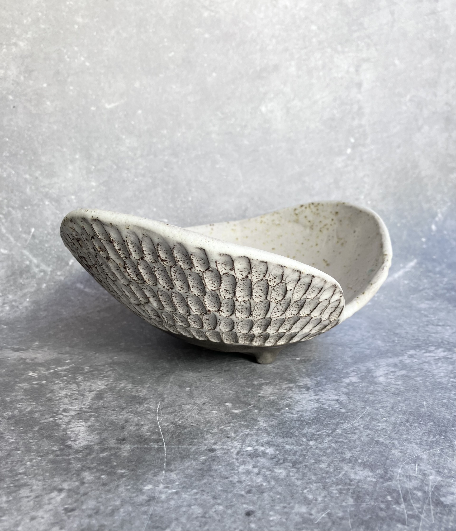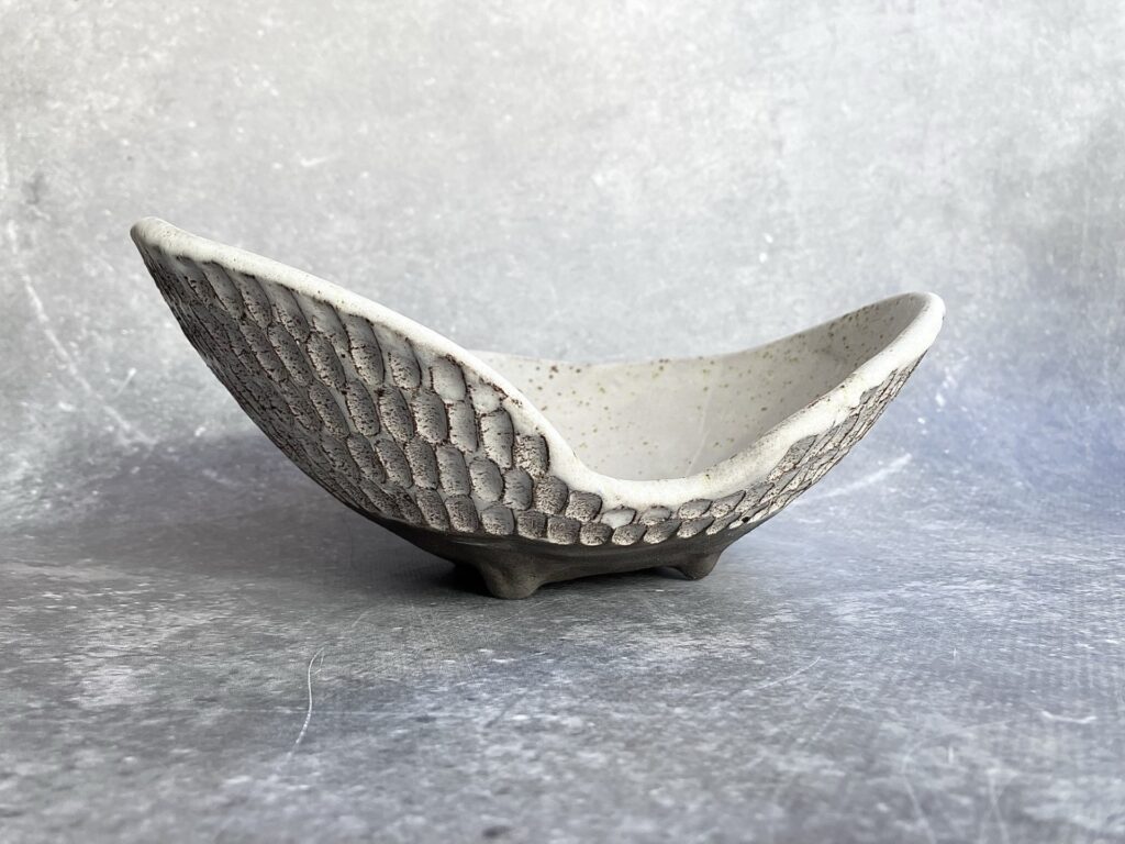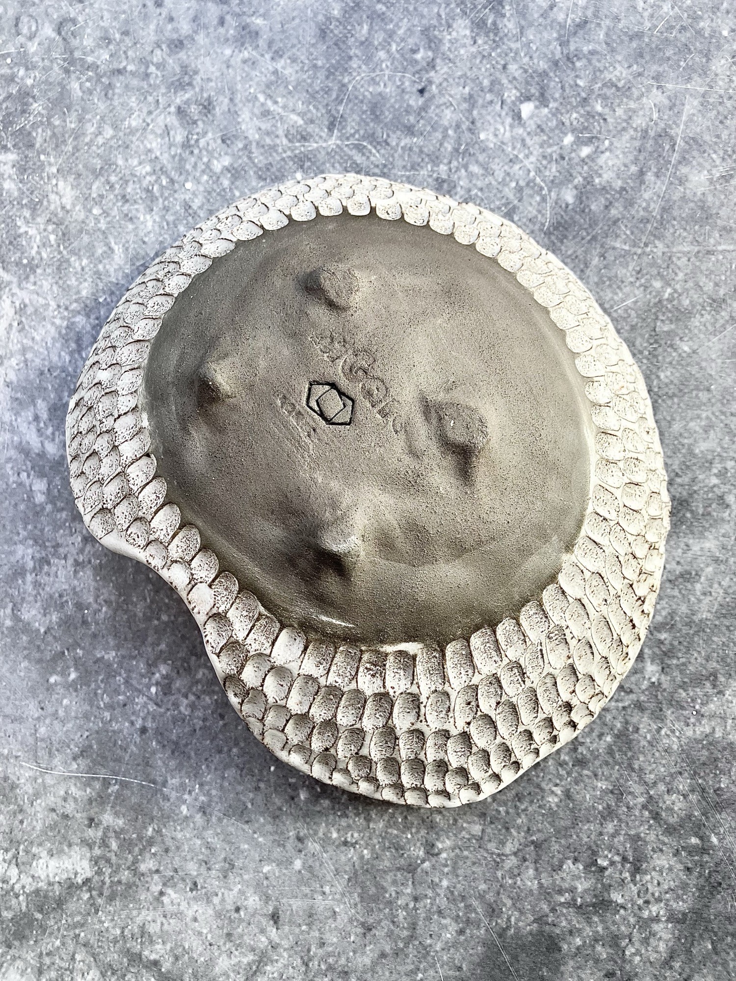 Boki naczynia ozdobione są ręcznie wycinanym, rytmicznym wzorem przypominającym naturalne struktury-łuski, płatki lub kamień- tworząc piękną taktylną powierzchnię. Spód patery pozostawia widoczną surowość gliny oraz sygnaturę autora, a cztery niewielkie nóżki dodają jej lekkości i podnoszą formę nad podłoże.