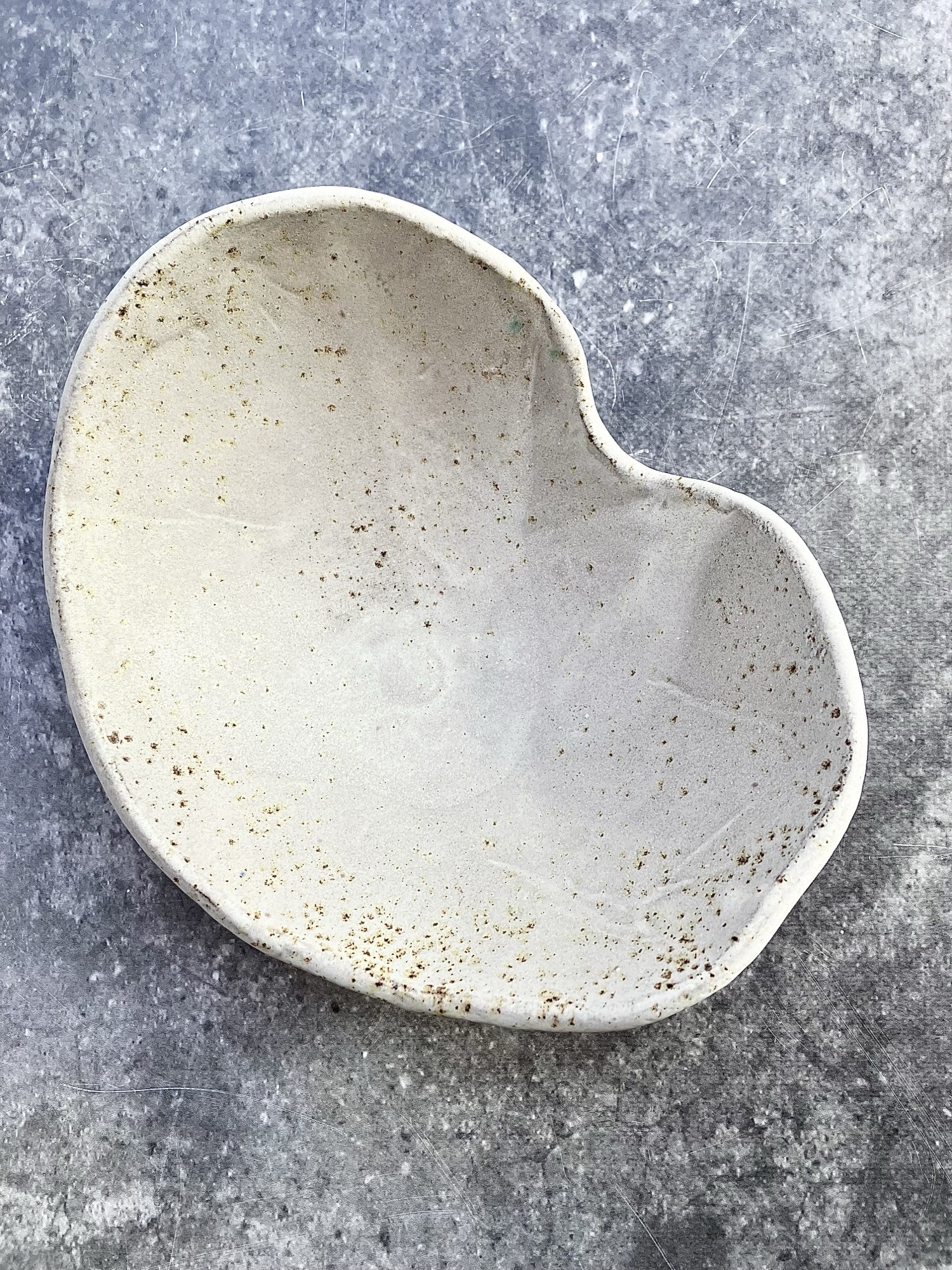 FASOLKA to unikatowa, ręcznie formowana patera o nieregularnym kształcie przypominającym ziarenko fasoli. Jej wnętrze pokryte jest jasnym delikatnie nakrapianym szkliwem, które nadaje jej naturalny, subtelny charakter.