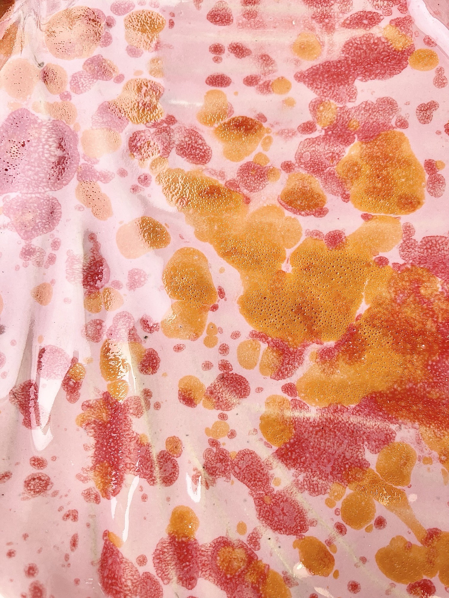 Utrzymana w pudrowo-różowej tonacji, ozdobiona jest nieregularnymi plamkami w odcieniach soczystej pomarańczy i czerwieni. Efekt nakrapiania tworzy dynamiczny, artystyczny wzór- każda patera jest unikatowa i niepowtarzalna. Błyszczące szkliwo podkreśla głębię kolorów oraz fakturę zdobień.