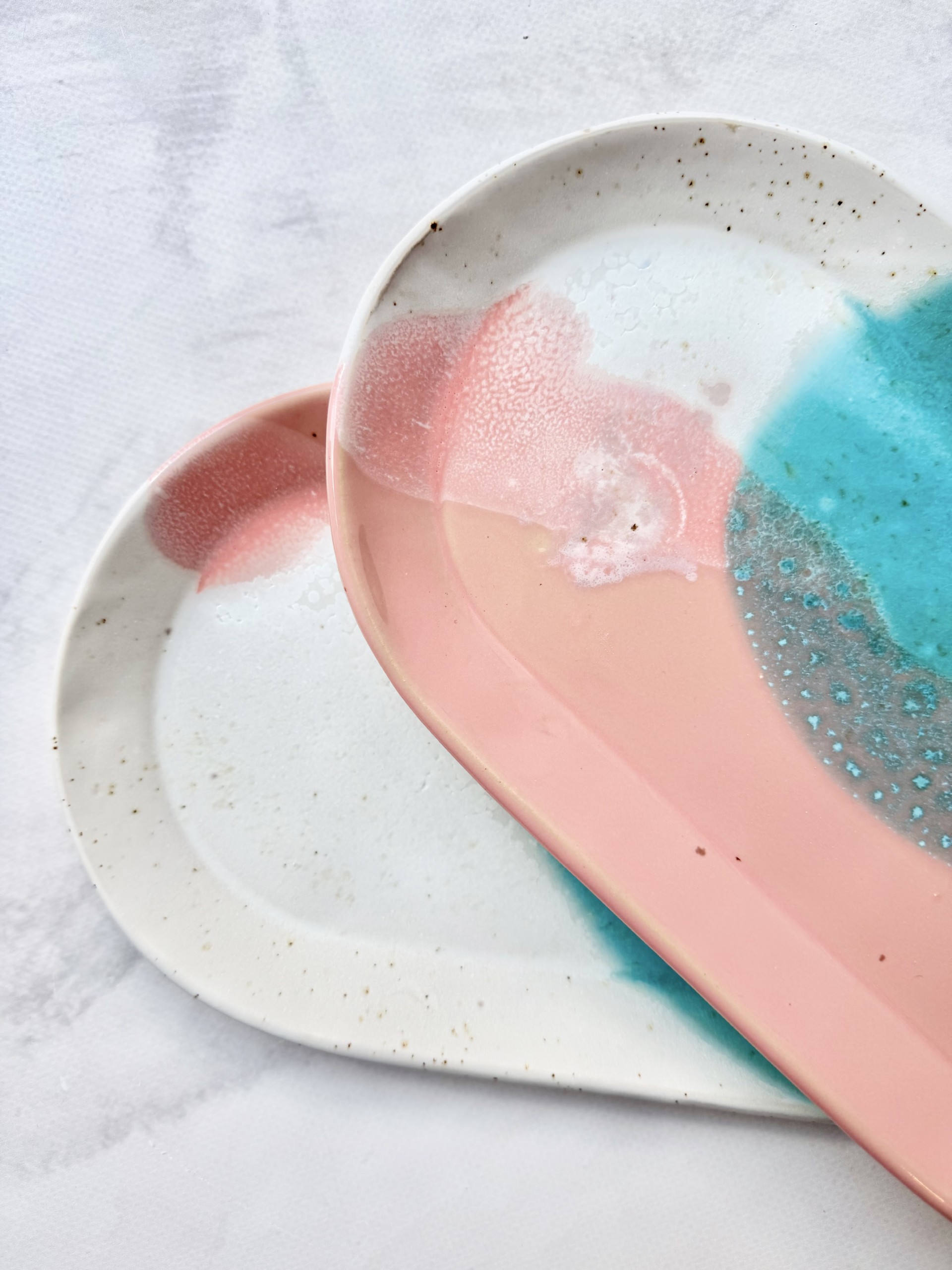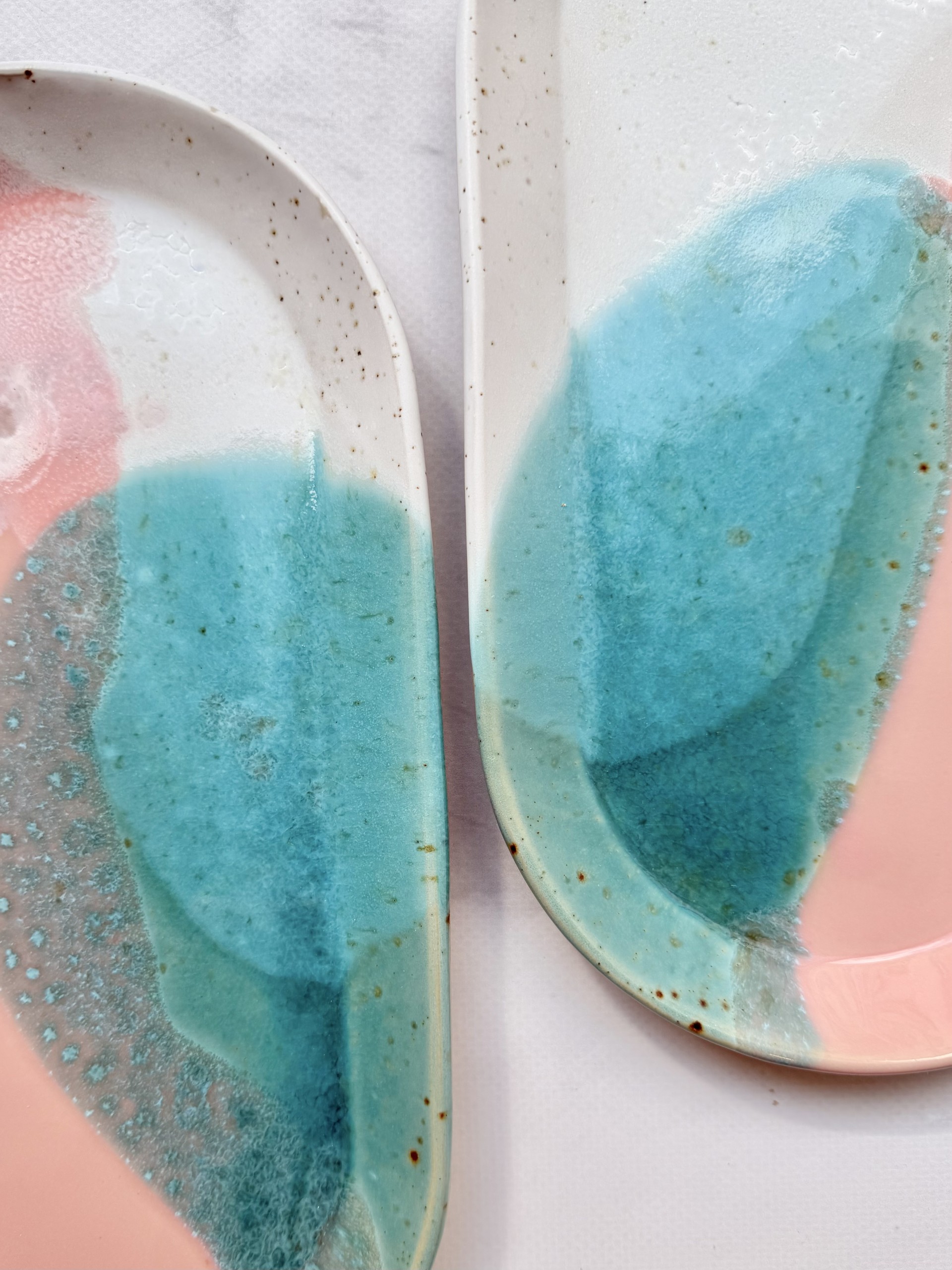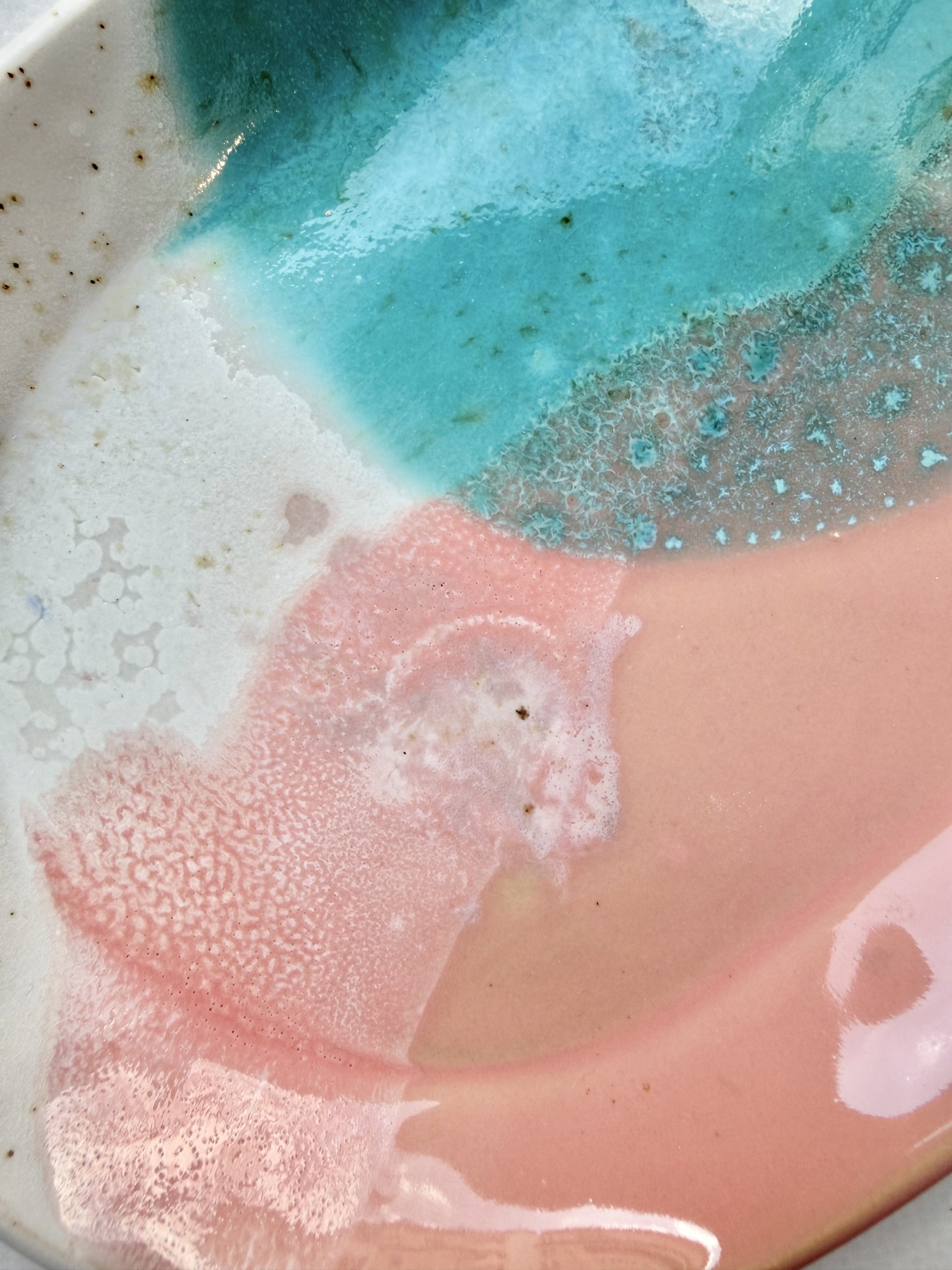 Delikatna jak pianka, patera Marshmallow zachwyca pastelową paletą różu, błękitu i kremowej bieli, które przenikają się w miękkich, organicznych kształtach. Subtelne nakrapiania dodają jej rękodzielniczego charakteru i sprawiają, że każdy egzemplarz jest niepowtarzalny.