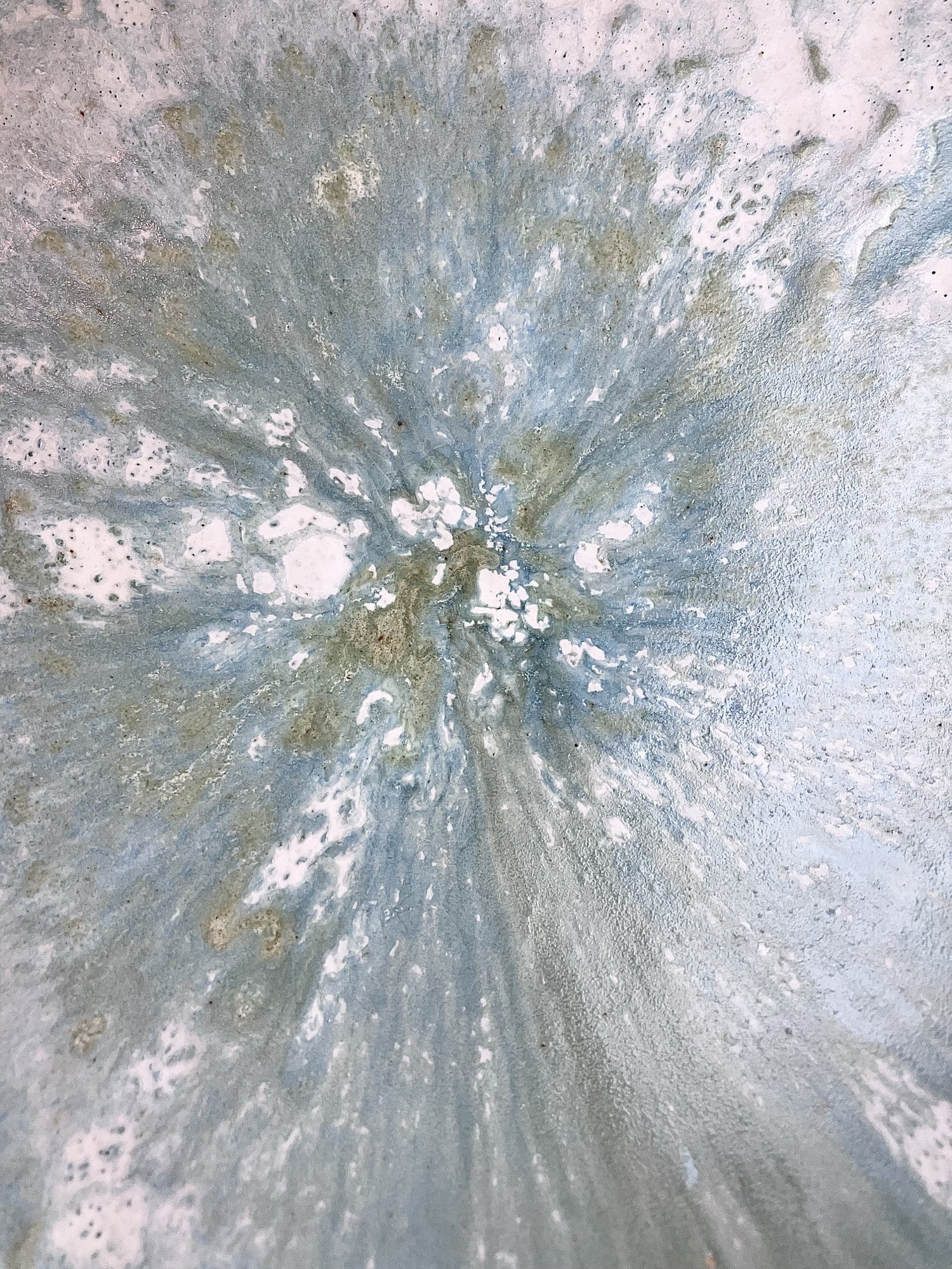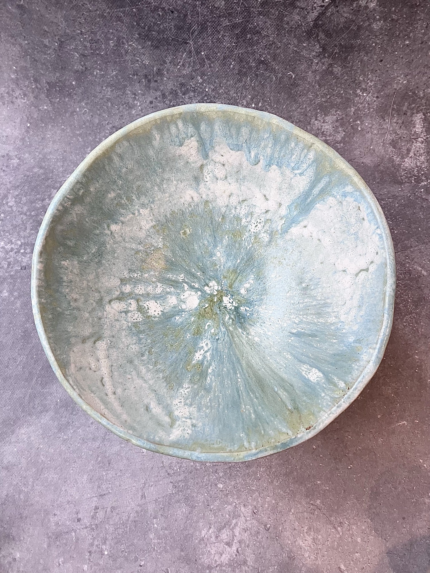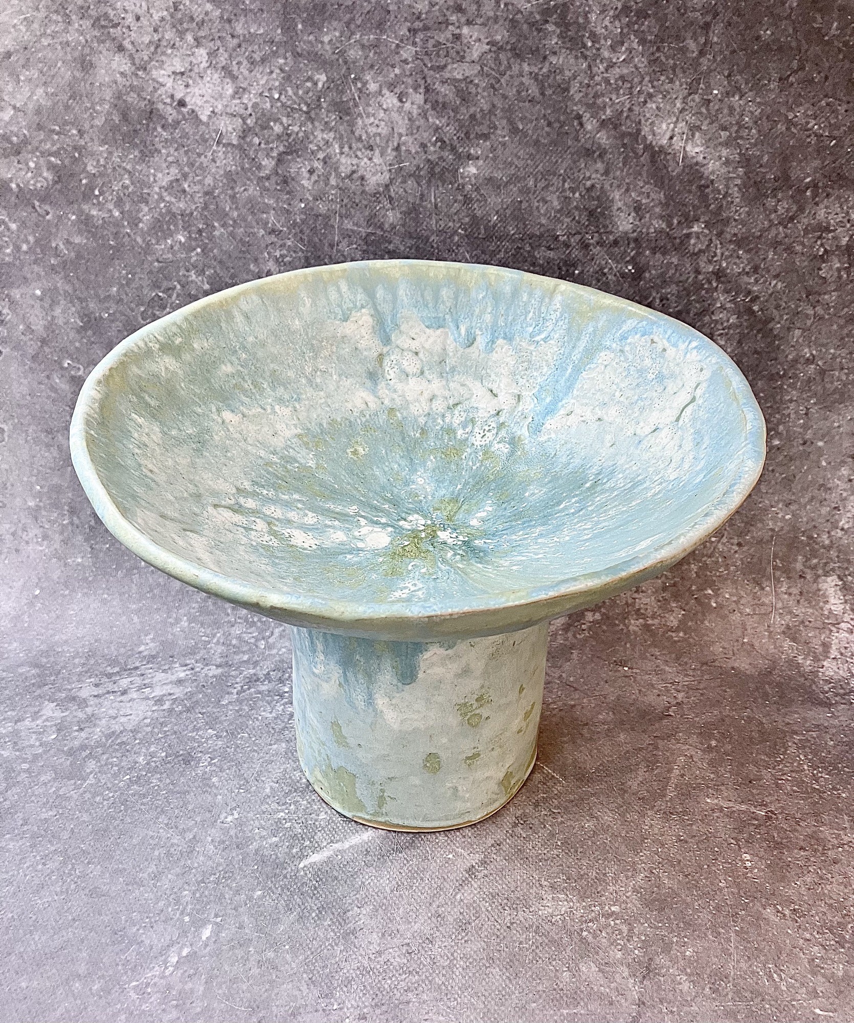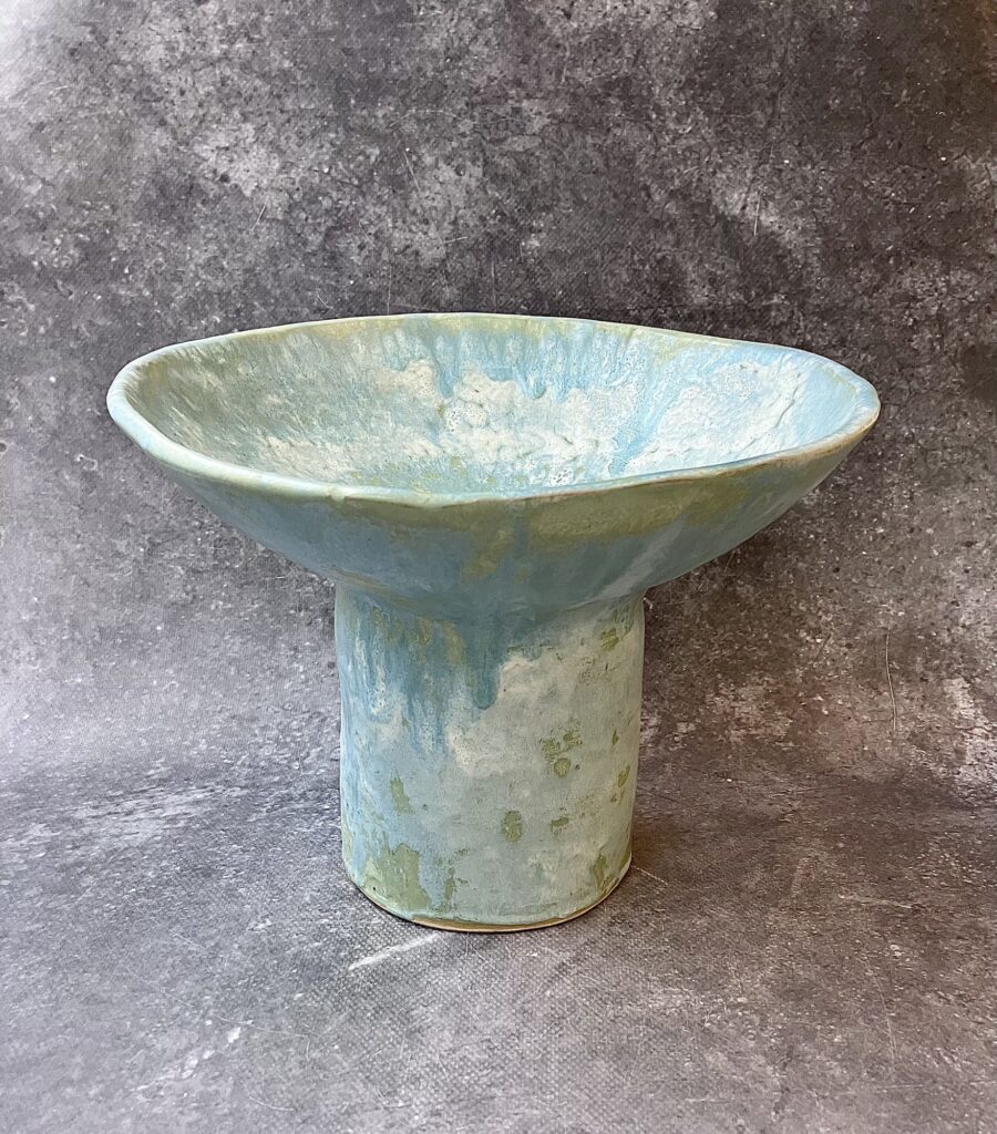 Unikatowa patera na nóżce o delikatnie organicznej formie, wykonana ręcznie z dbałością o każdy detal. Jej powierzchnię pokrywa szkliwo w odcieniach błękitu, zieleni i jasnych, perłowych tonów, które układają się w miękkie, malarskie przejścia. Struktura szkliwa przypomina subtelne, warstwowe pociągnięcia pędzla Claude’a Moneta- lekkie, rozbielone i pełne świetlistości, jak w impresjonistycznych pejzażach.