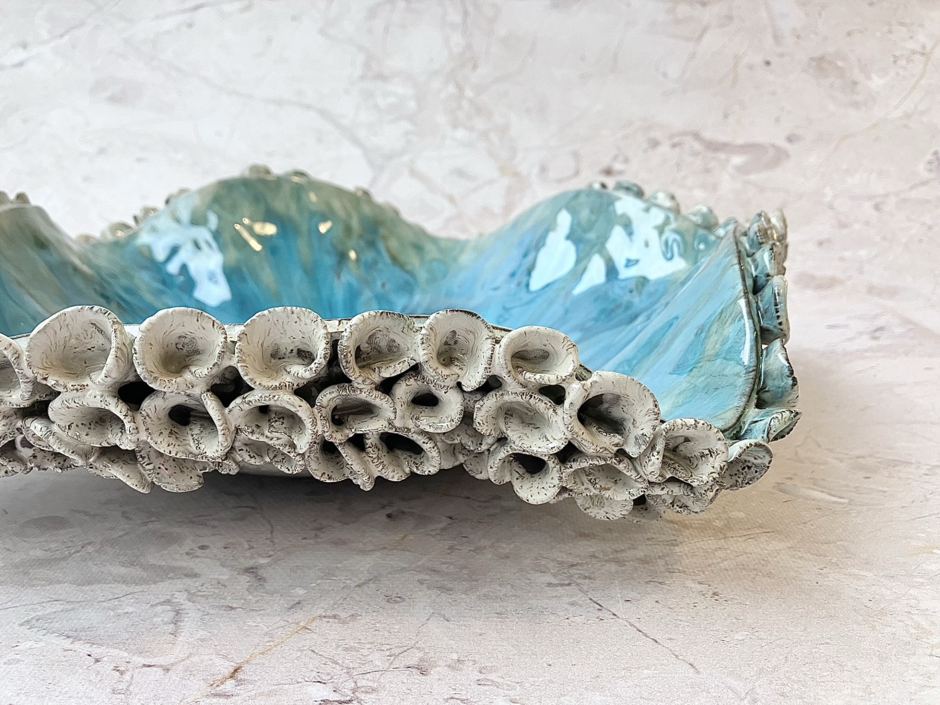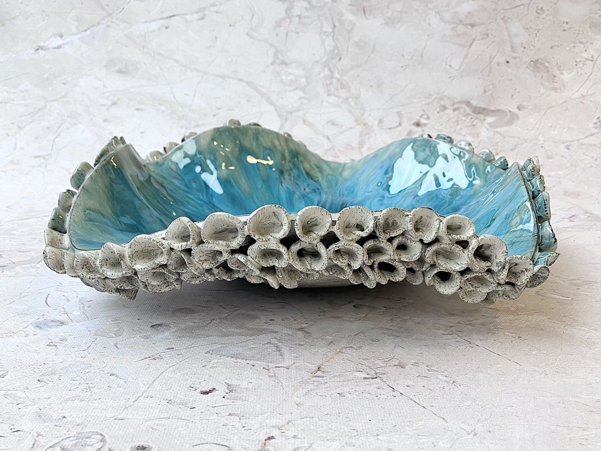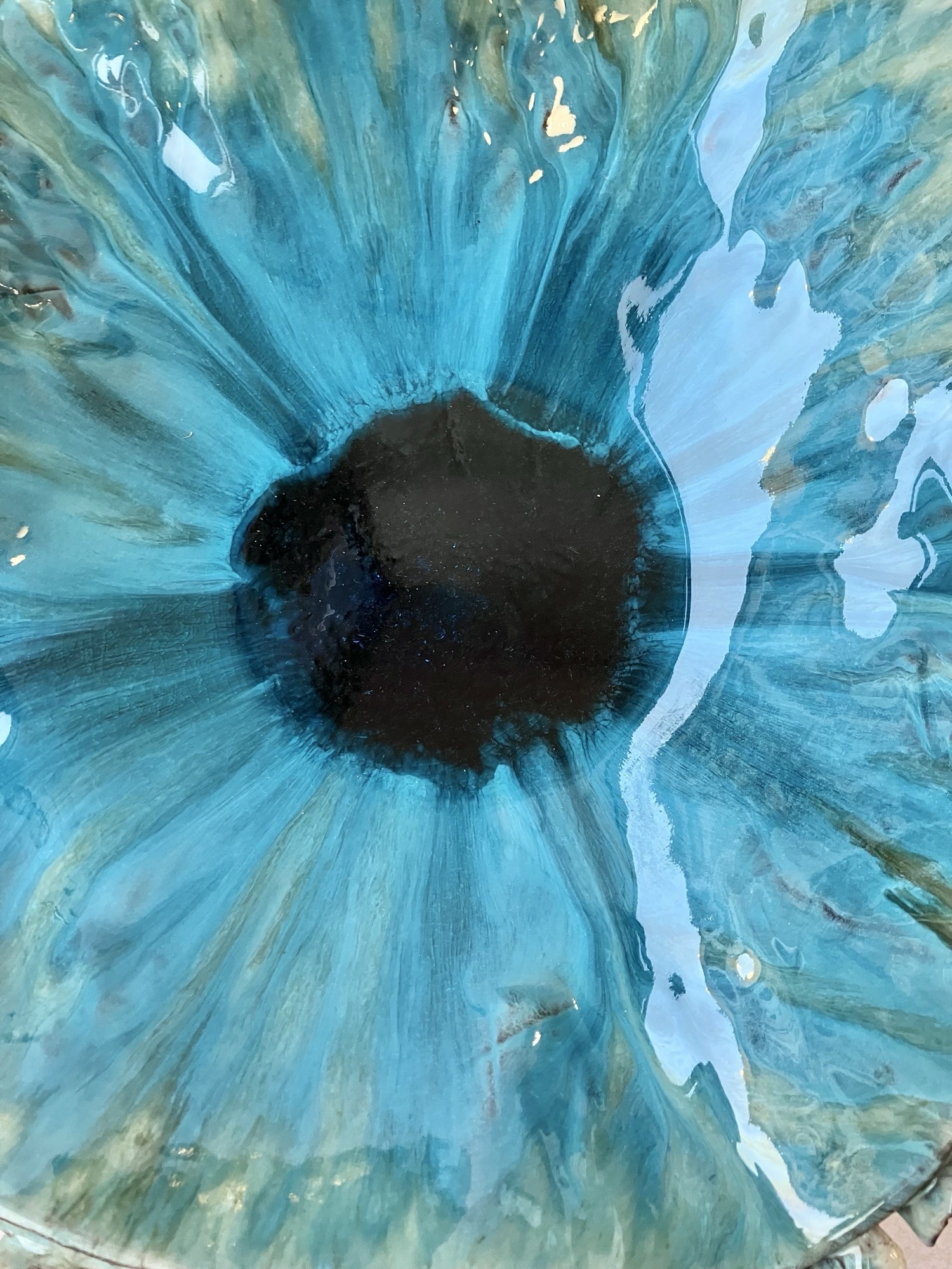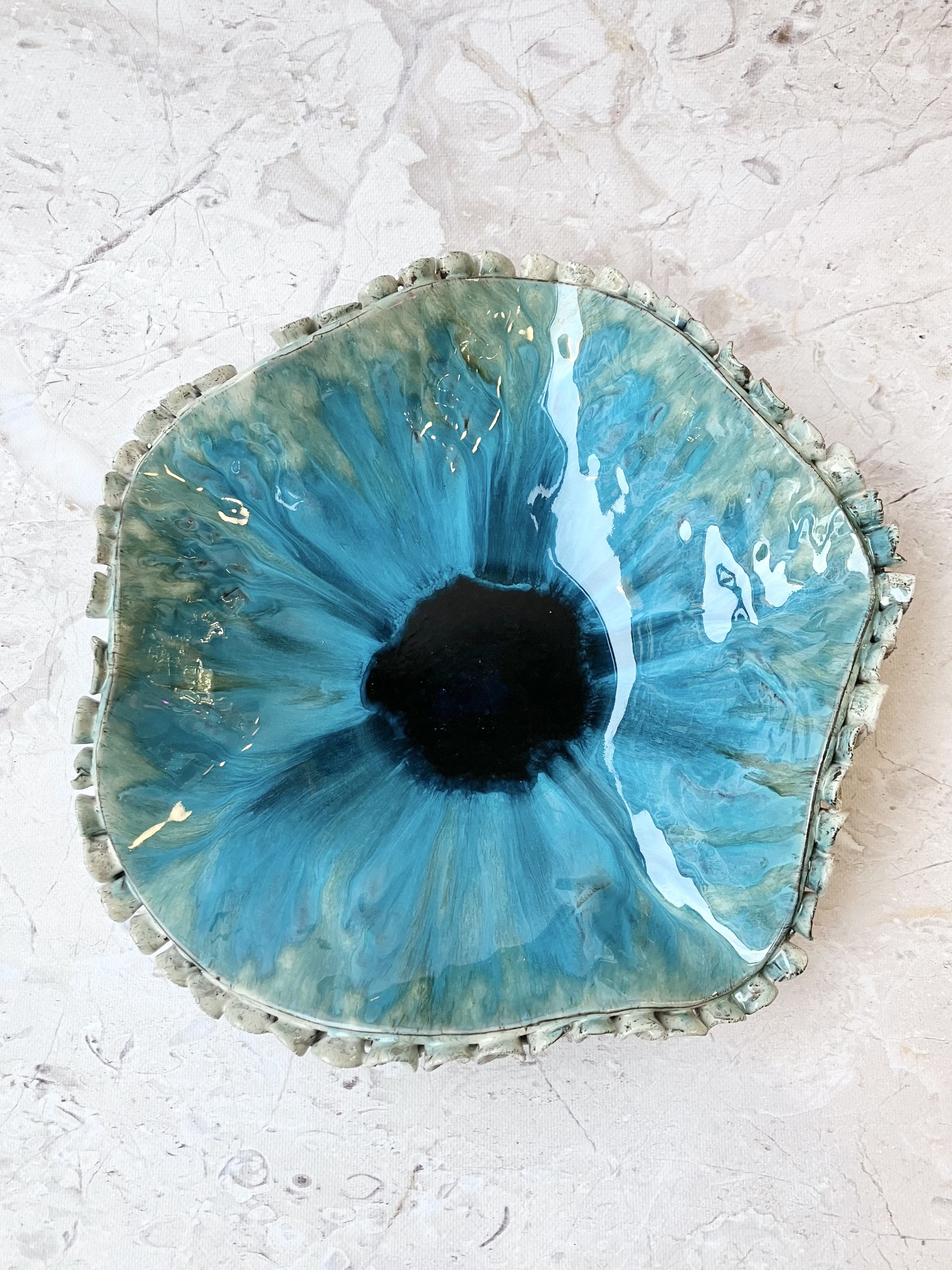 Ta ręcznie uformowana ceramiczna patera to małe dzieło sztuki zamknięte w organicznym, nieokreślonym geometrycznie kształcie – jakby natura sama postanowiła nadać mu formę. Wnętrze błyszczy niczym spokojna, ale wciąż żywa tafla tropikalnego oceanu. Turkusowe i szmaragdowe tonacje płynnie przenikają się z głębokim błękitem, tworząc ruch, który przypomina wirującą wodę albo pociągnięcia pędzla na mokrym płótnie.