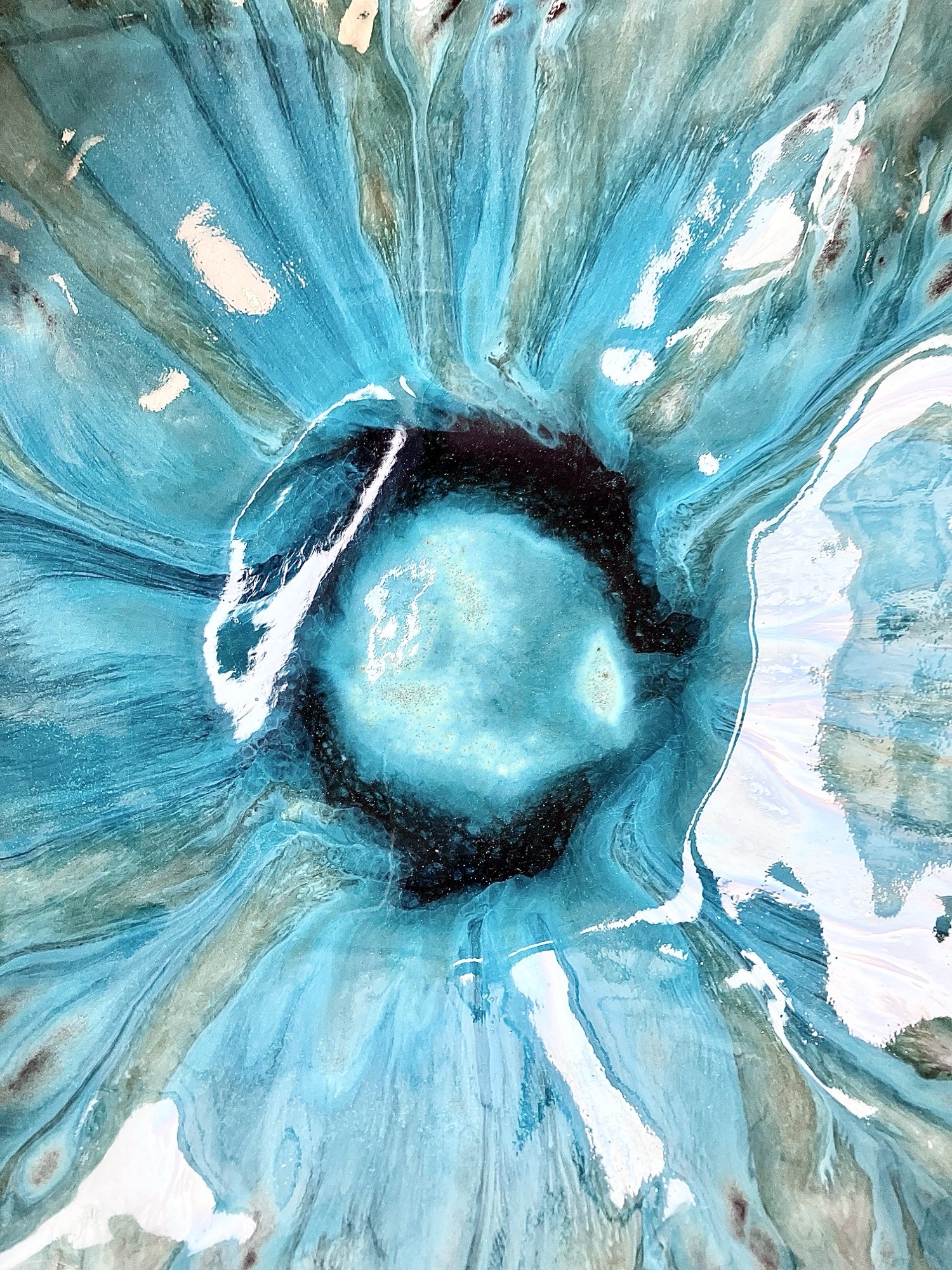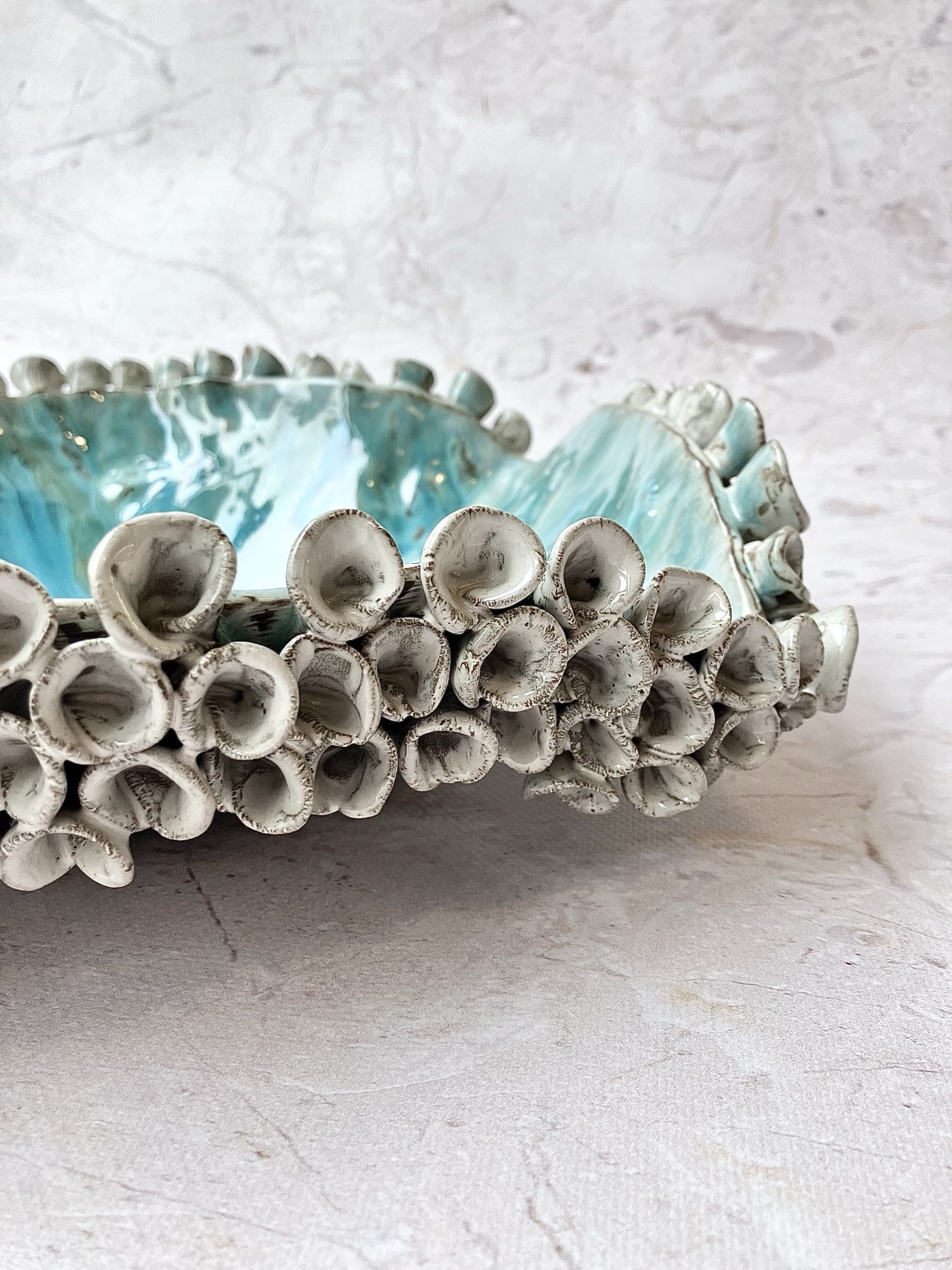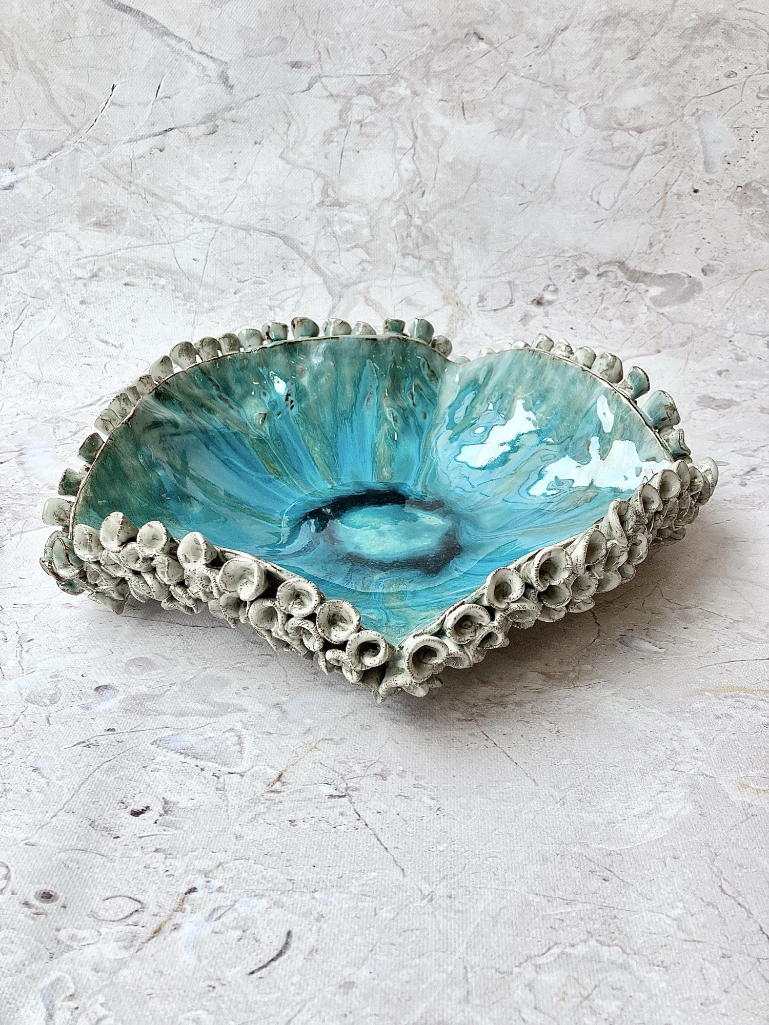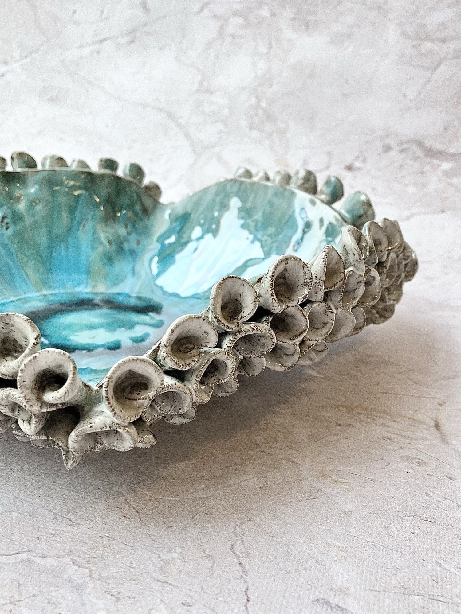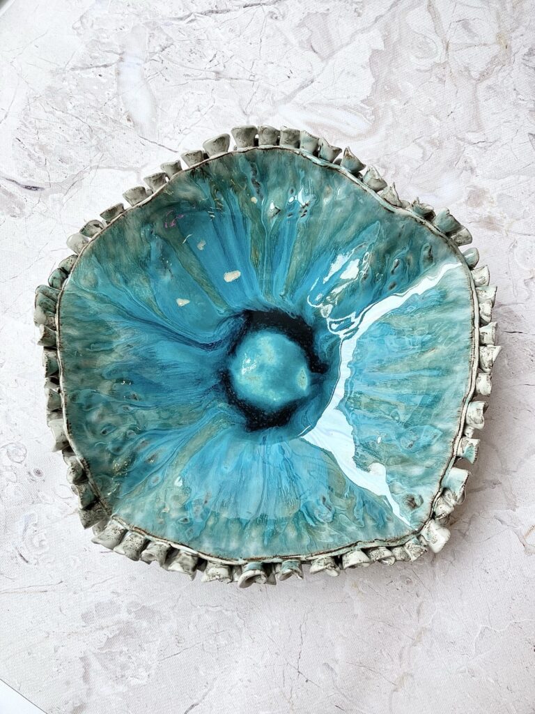 PATERA *DEEP INTO THE SEA*. Ta unikatowa, ręcznie wykonana patera zachwyca organiczną formą i artystycznym wykończeniem. Łączy w sobie intensywny turkus i morskie odcienie szkliwa, tworzące efekt głębi i delikatnych, wodnych refleksów. Brzeg naczynia zdobią misternie formowane, ceramiczne wypustki przypominające naturalne struktury-muszle i koralowce. Patera jest nie tylko dekoracyjna, ale również funkcjonalna. Doskonale sprawdzi się jako centralna ozdoba stołu, naczynie na owoce lub słodkości. Jej wyjątkowy charakter i kunsztowne wykonanie czynią ją idealnym prezentem dla miłośników rękodzieła i przedmiotów o niepowtarzalnej estetyce.