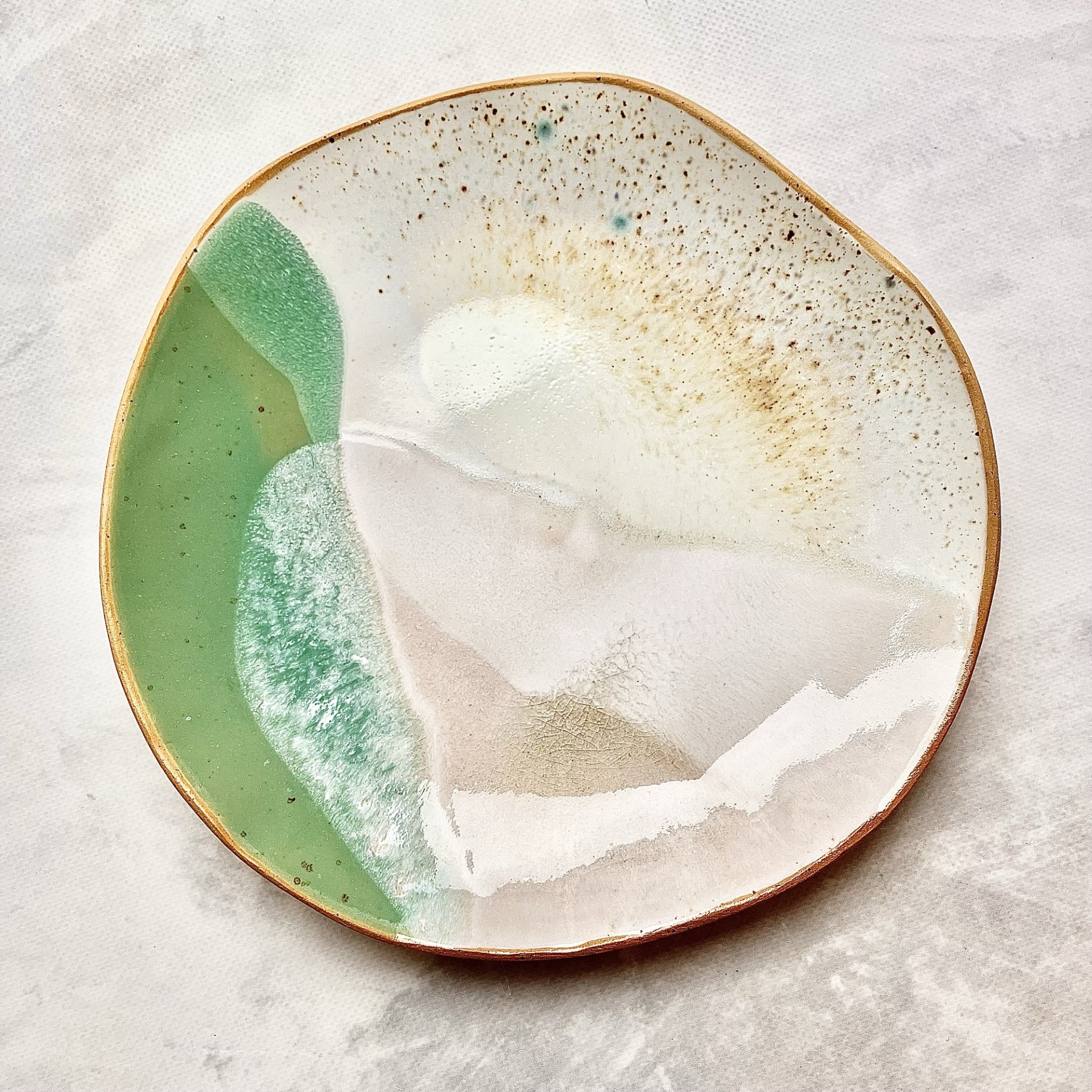 Talerz obiadowy SELEDYN ręcznie robiony. Charakteryzuje się niezwykłym przenikliwym kolorem zielonego oraz delikatnymi piegami z dodatkiem białego akcentu.