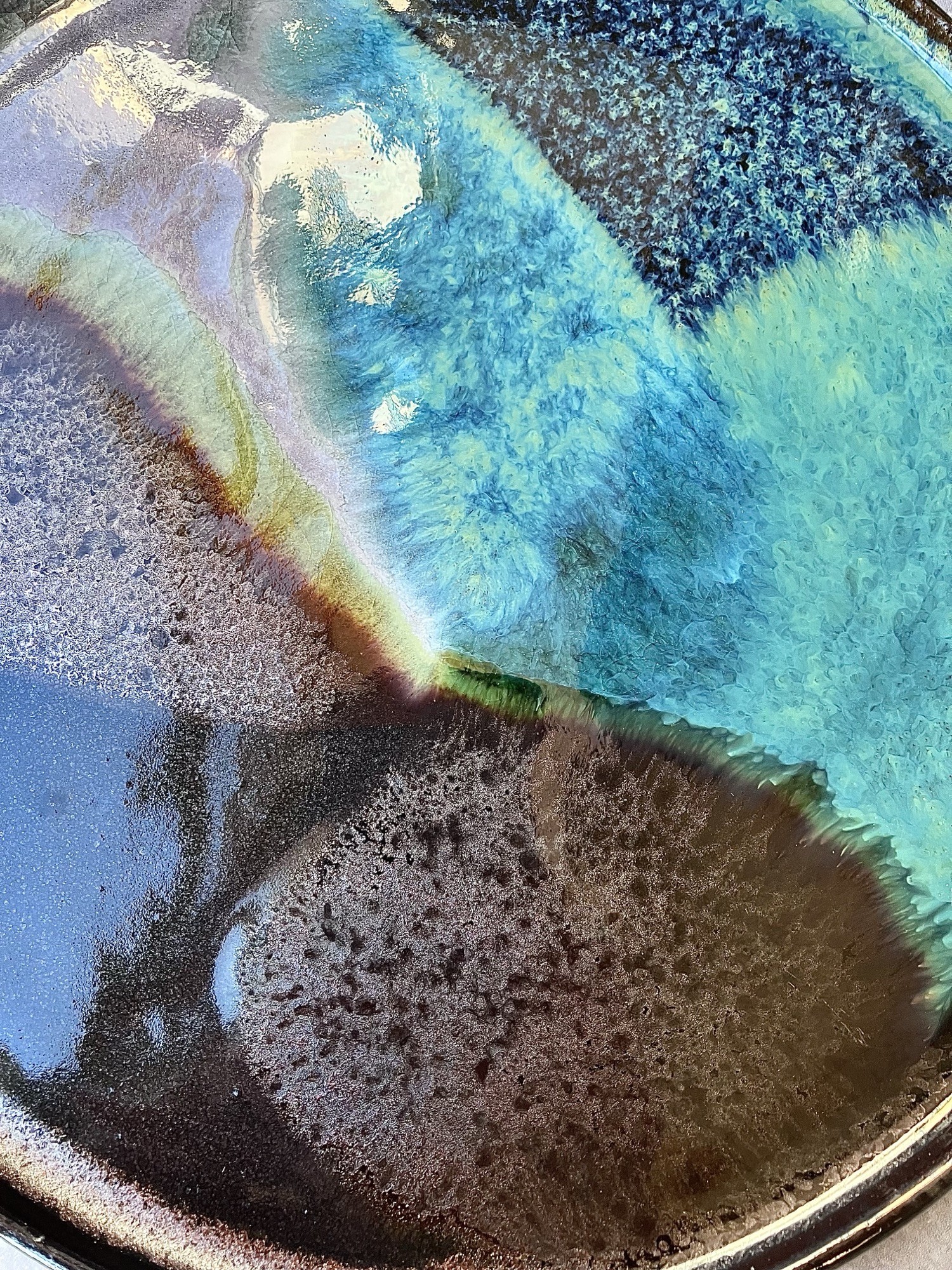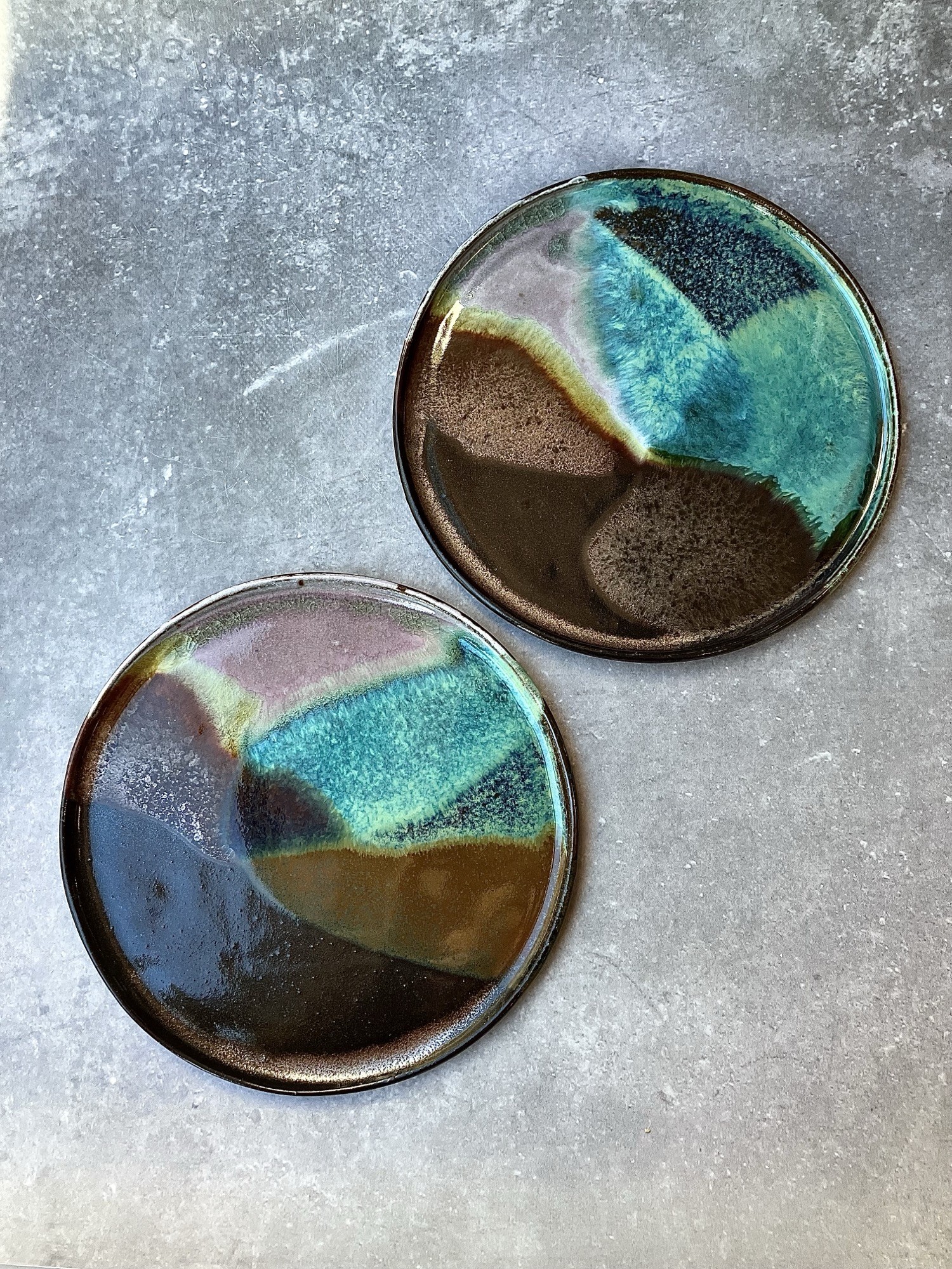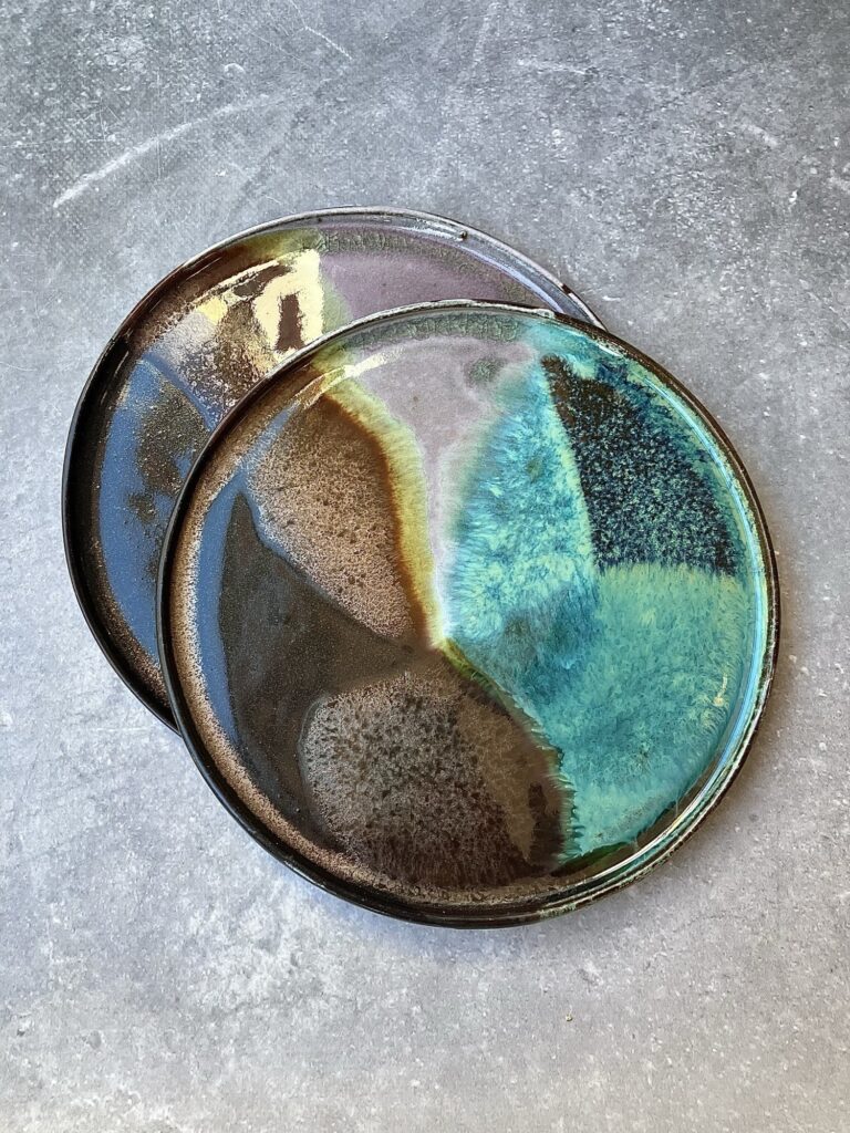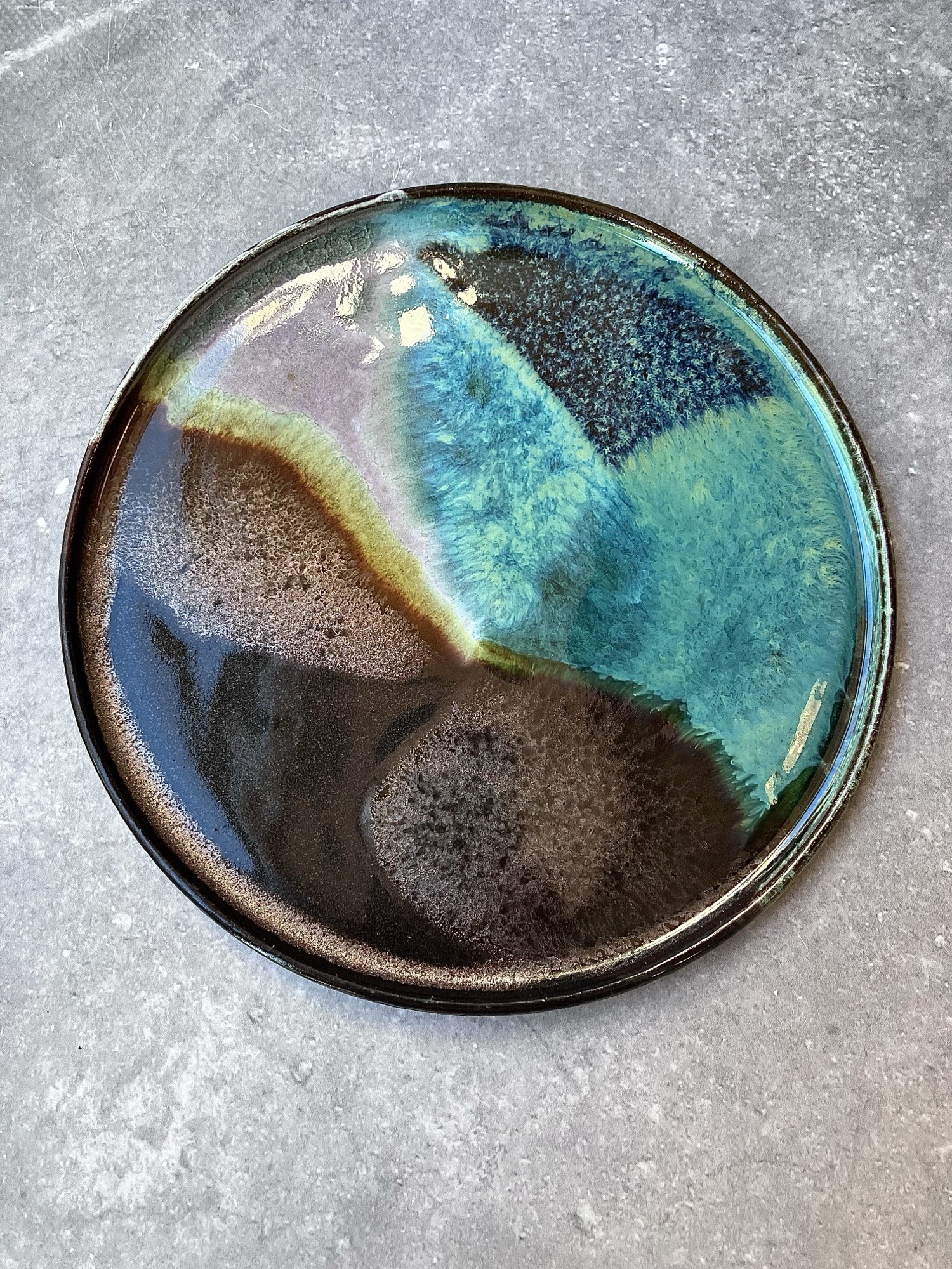 Talerz Galaxy to unikatowa ceramika inspirowana kosmiczną przestrzenią i naturalnymi zjawiskami światła. Ręcznie szkliwiona powierzchnia zachwyca płynnym przejściem barw – od głębokich błękitów i turkusów, przez zielenie, aż po ciepłe brązy i lawendowy fiolet. Każdy egzemplarz jest niepowtarzalny, a nieregularne granice kolorów przypominają mgławice i odległe galaktyki.