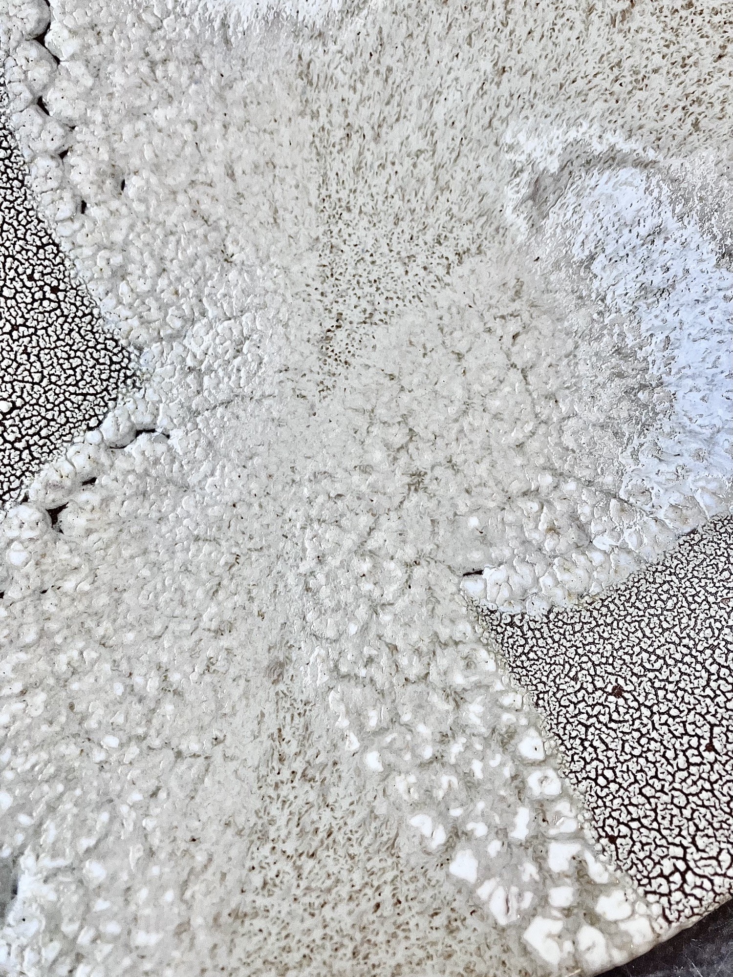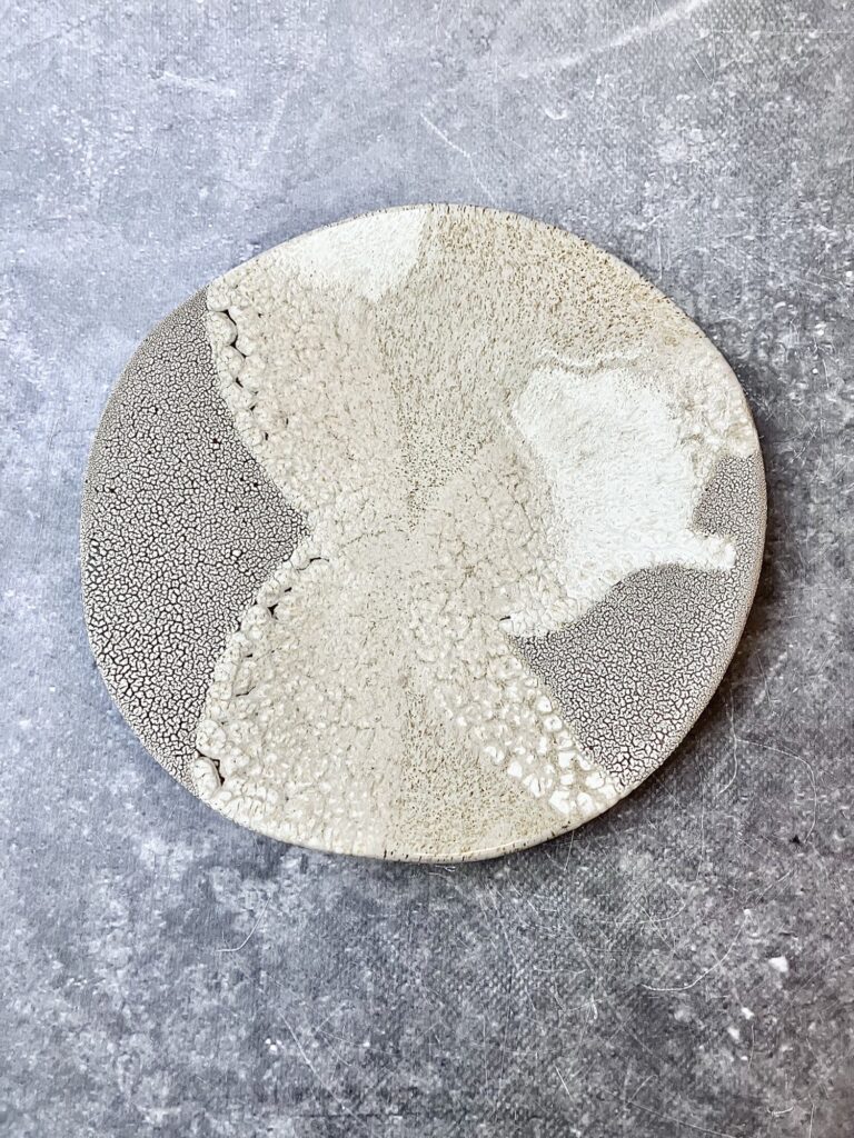 Połączenie subtelnych beżów, szarości i bieli tworzy organiczny, nieregularny wzór przypominający krajobrazy tworzone przez naturę. Charakterystyczna krakelura i porowate, prawie koralowe powierzchnie nadają talerzykom głębi oraz wyjątkowego, rzeźbiarskiego charakteru.