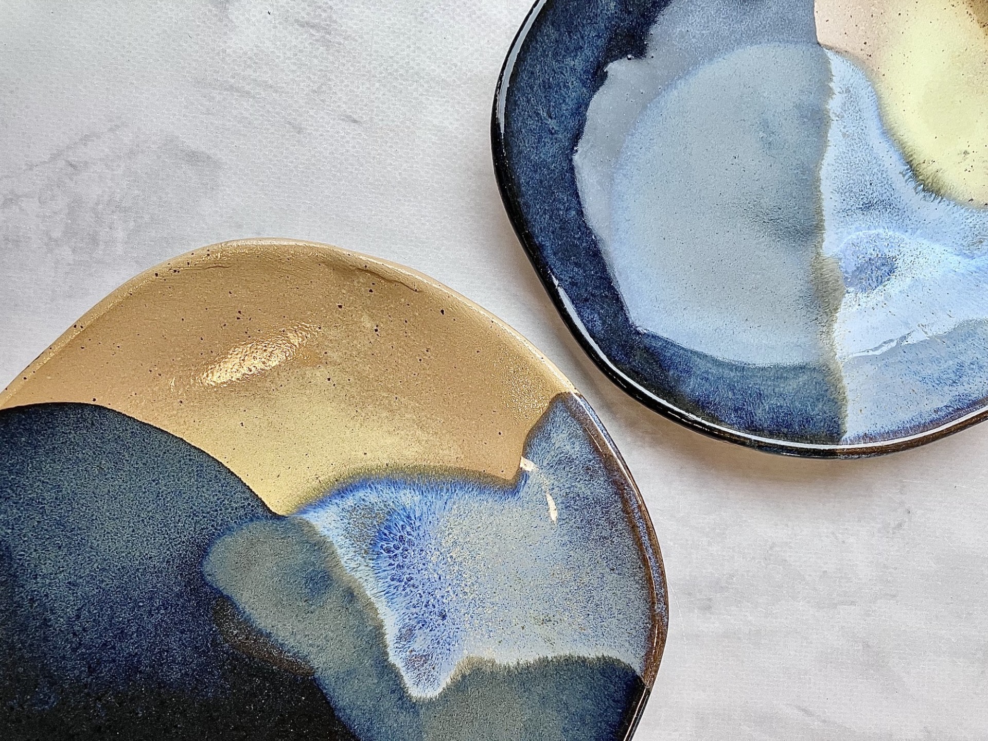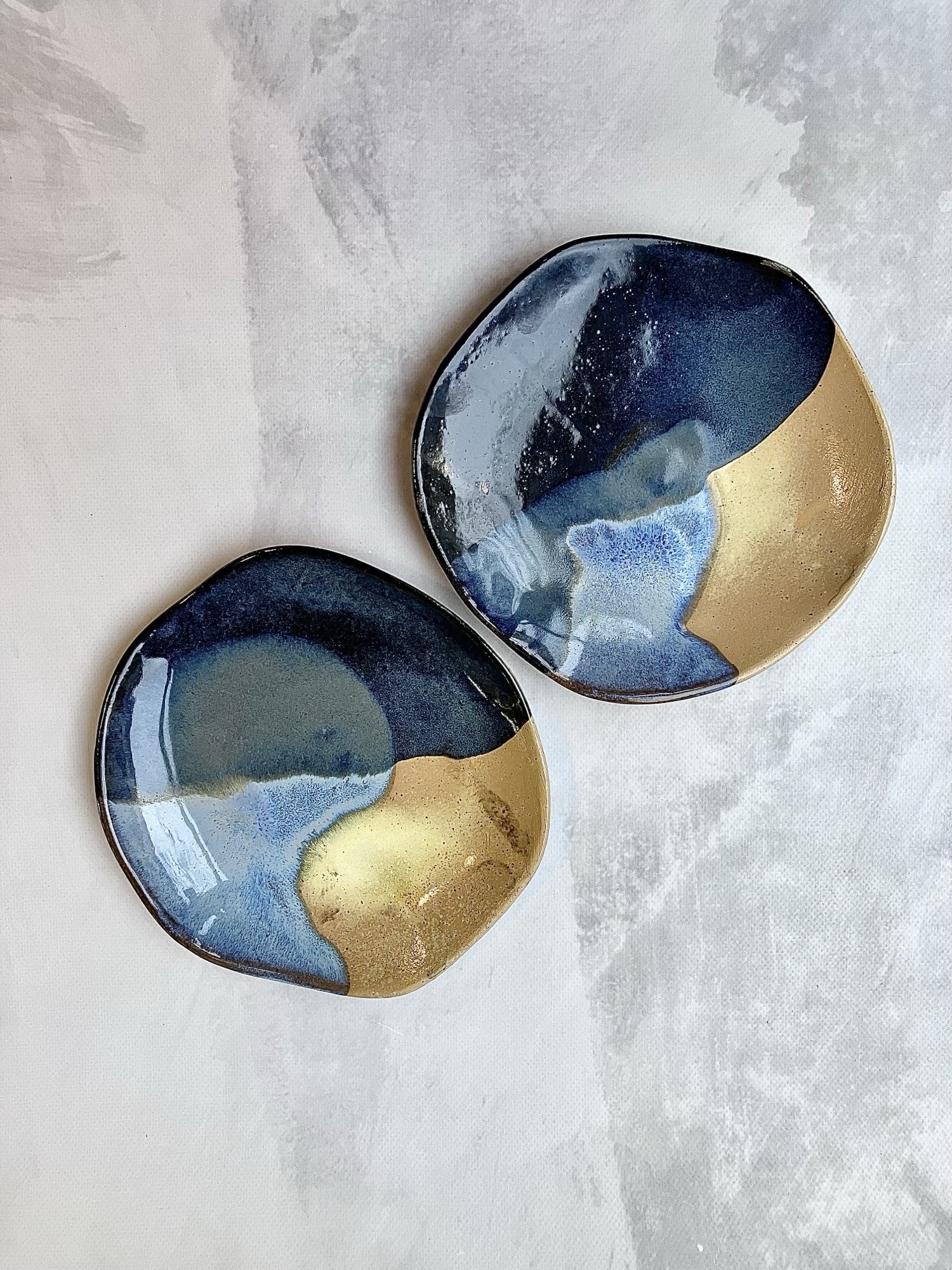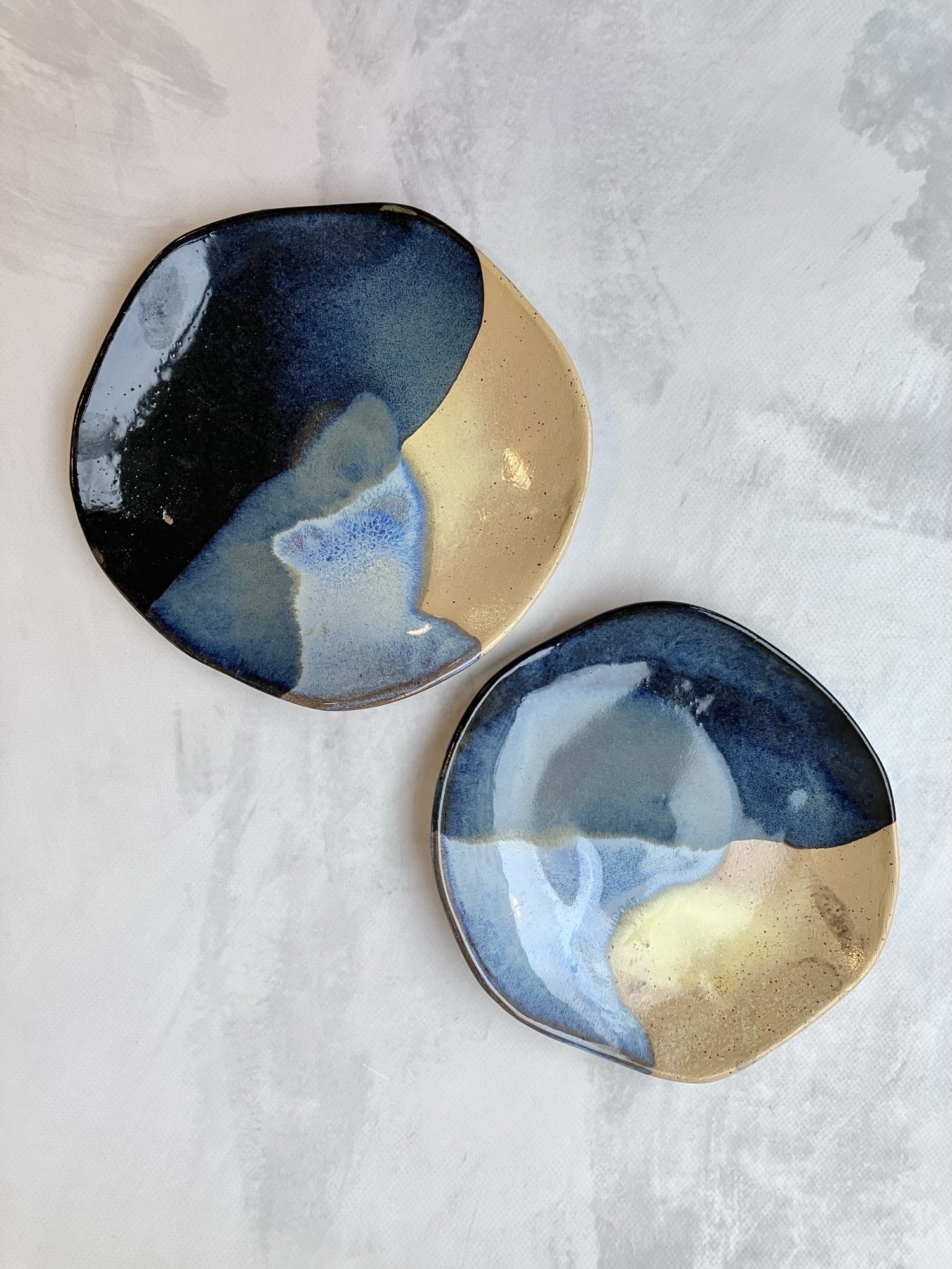 Głębokie granaty i błękity przeplatają się z ciepłymi odcieniami piasku, tworząc harmonijny kontrast światła i cienia. To talerze, które nie tylko podkreślają charakter stołu, ale także wniosą do wnętrza odrobinę spokoju i naturalnej elegancji. Idealne do podawania deserów i przekąsek.