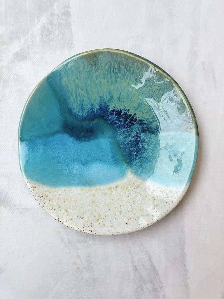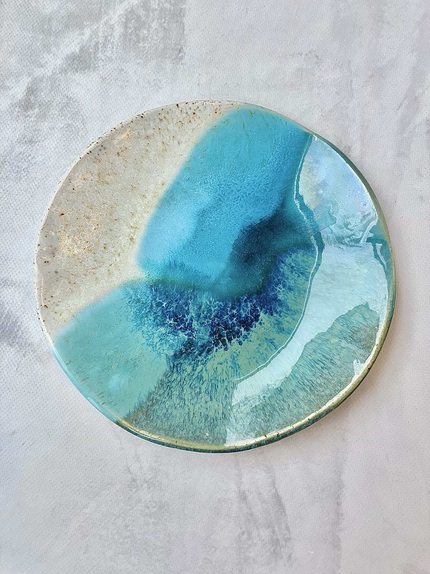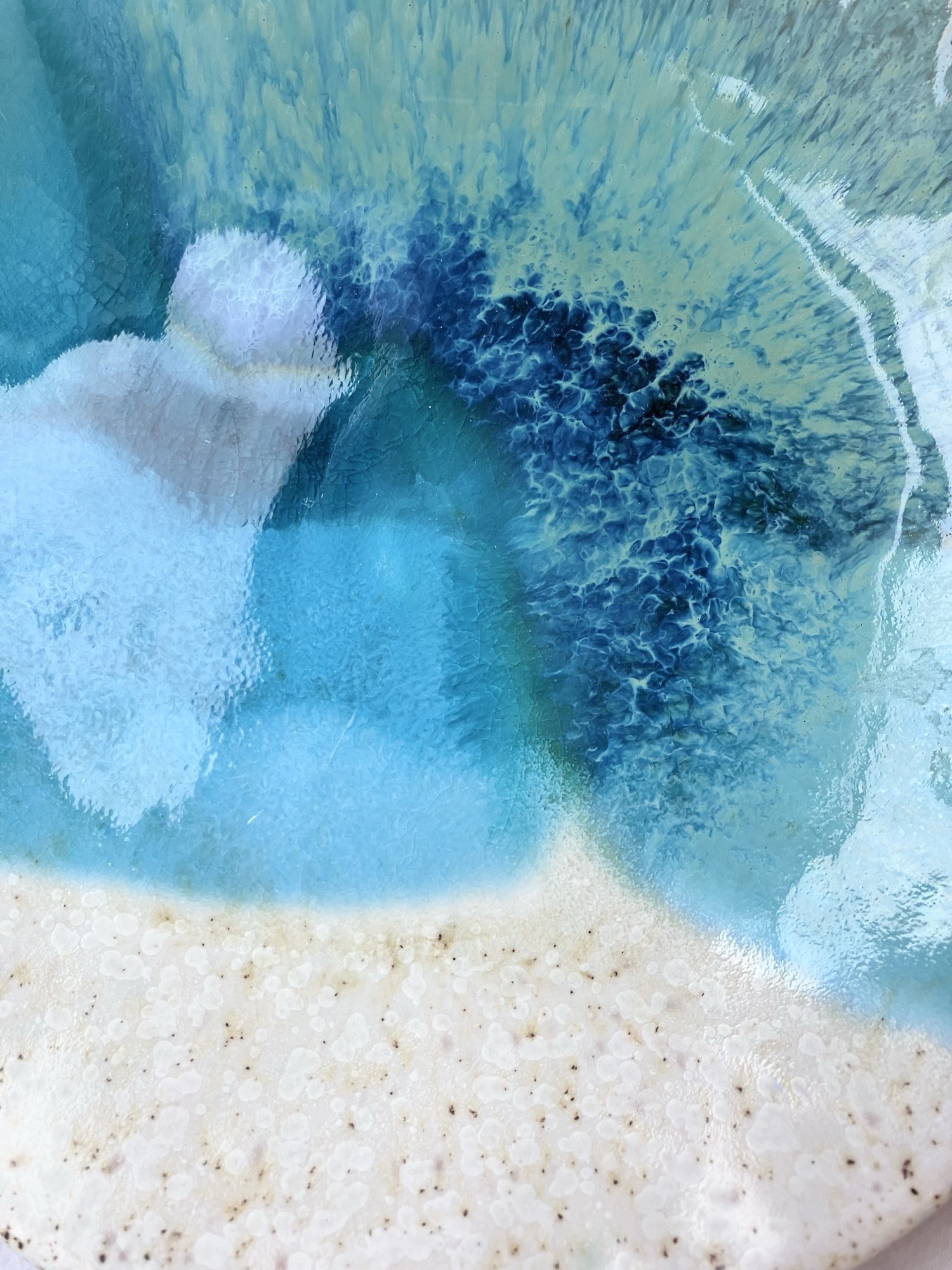 Talerzyk Waterfall ma artystyczny charakter i przywodzi na myśl krajobraz wodny. Dominują odcienie turkusu, morskiego błękitu i bieli, które układają się w miękkie, promieniste przejścia kolorystyczne – jakby woda spływała kaskadami ku jaśniejszemu centrum. Szkliwo tworzy nieregularne granice i naturalne gradienty, z połyskującym, szklistym wykończeniem.