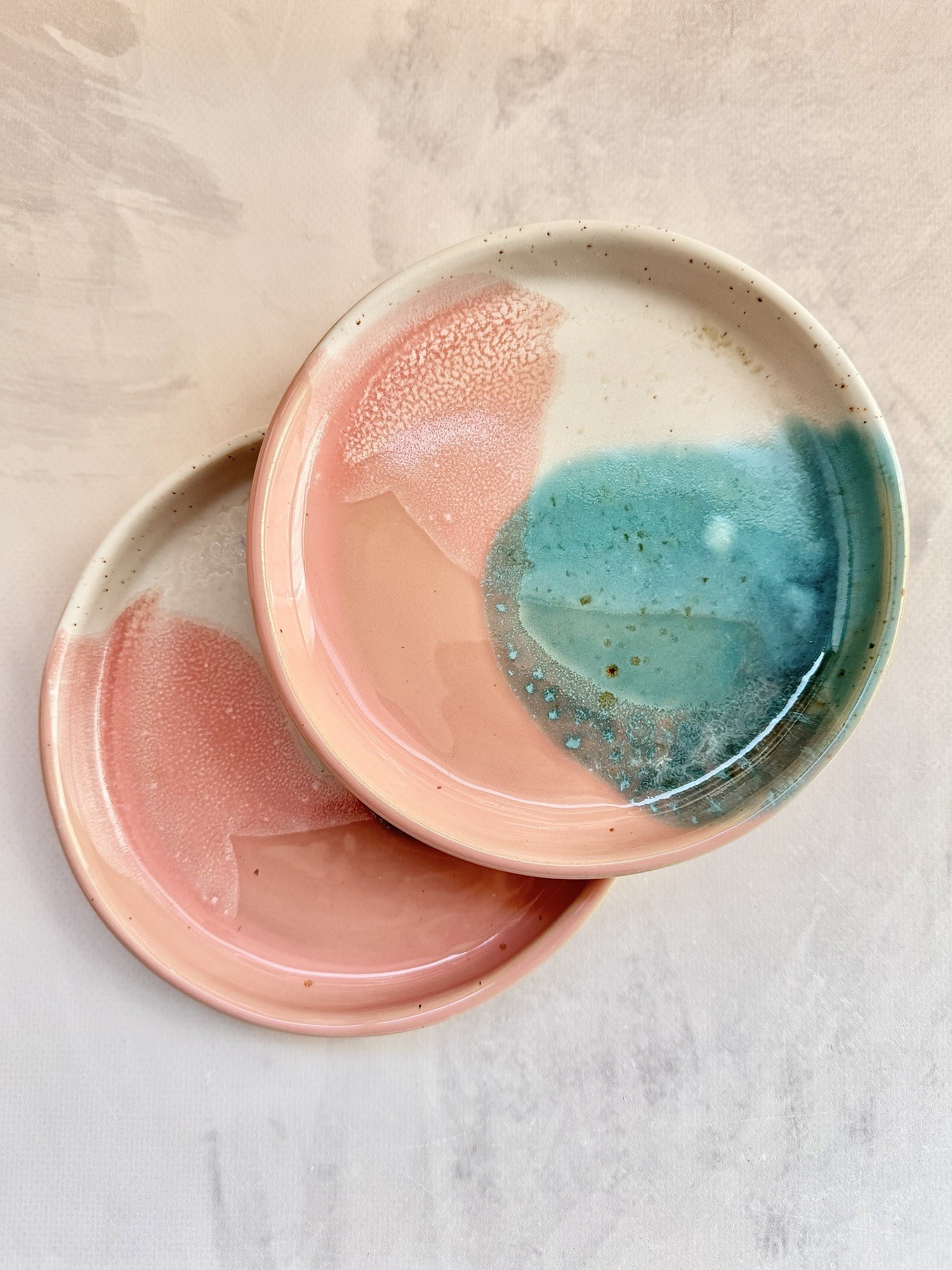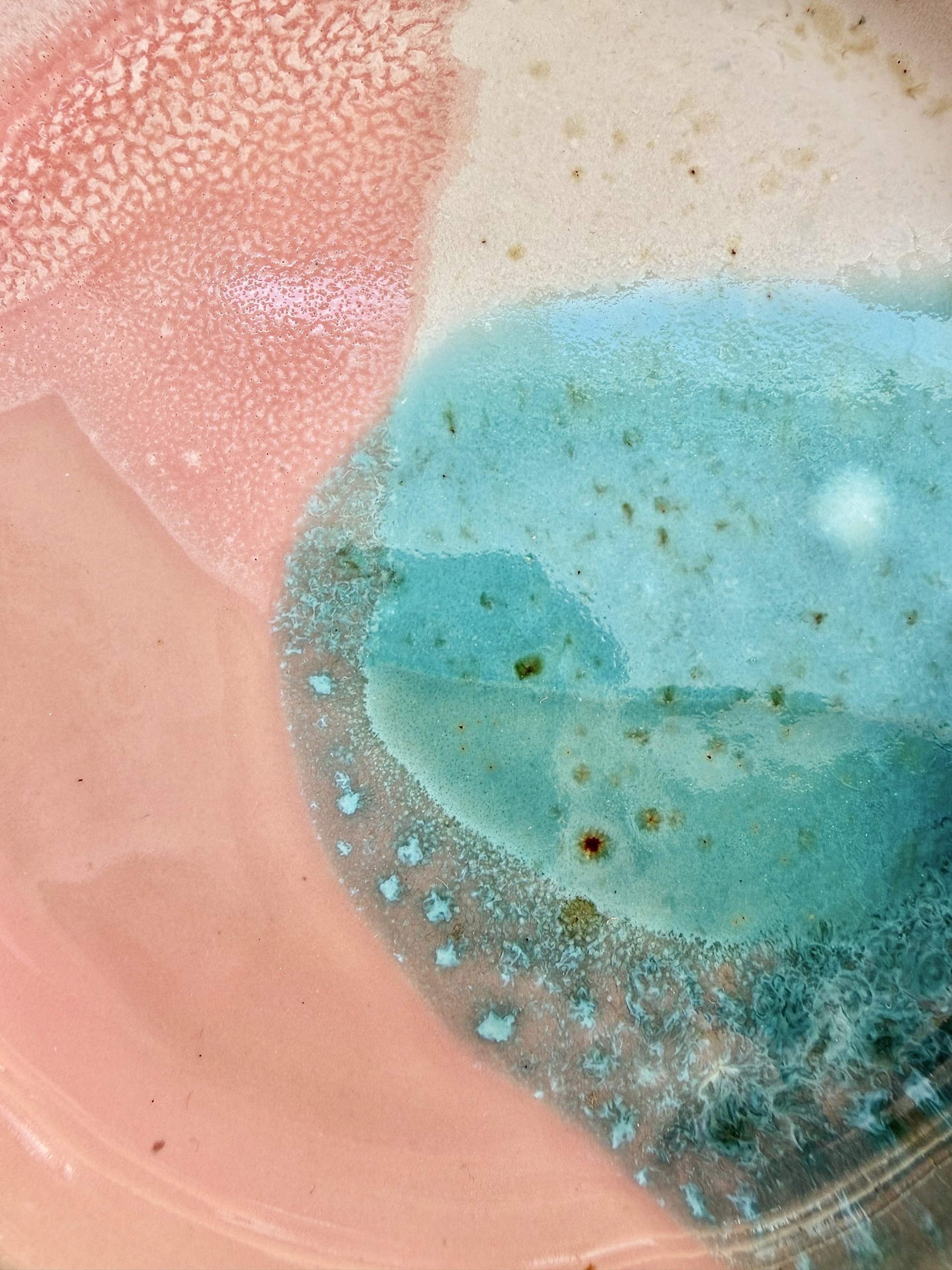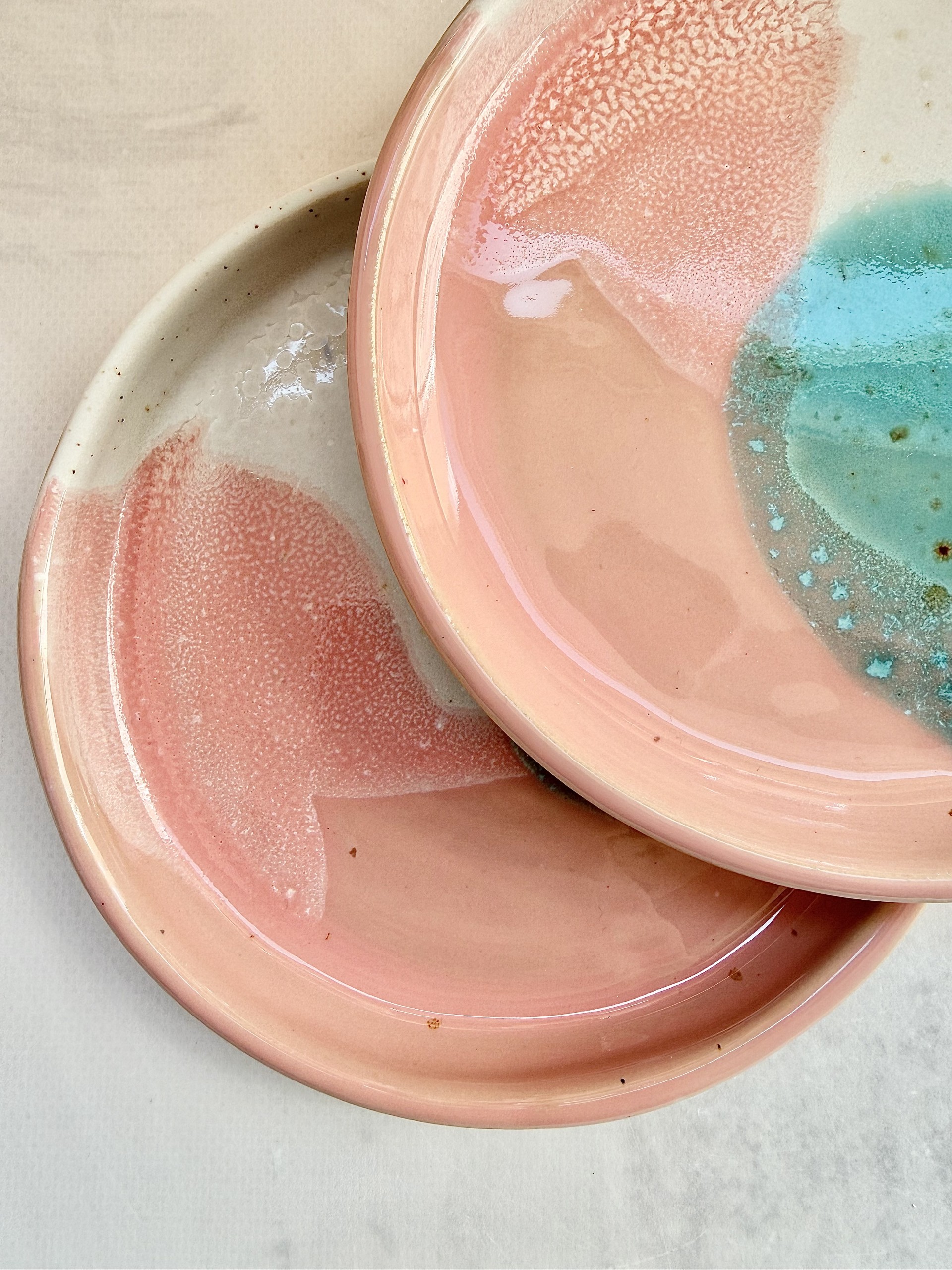 Śliczny, ręcznie wykonany talerzyk MARSHMALLOW. Białe, niebieskie i jasnoróżowe szkliwo przenikają się tworząc wręcz malarski efekt. Talerzyk ma delikatnie podniesiony rant, co nadaje mu nowoczesnego charakteru.