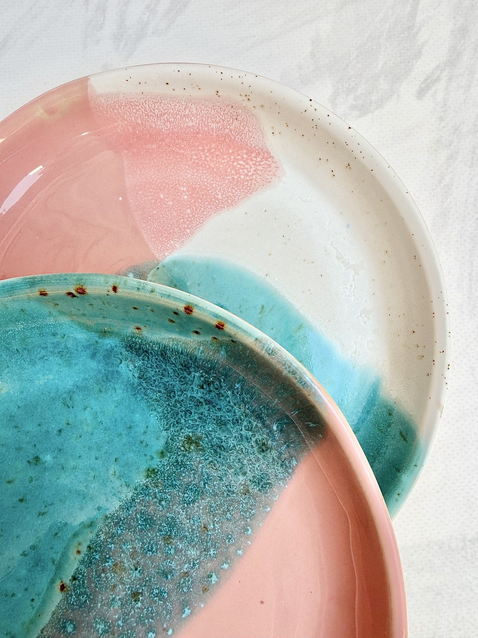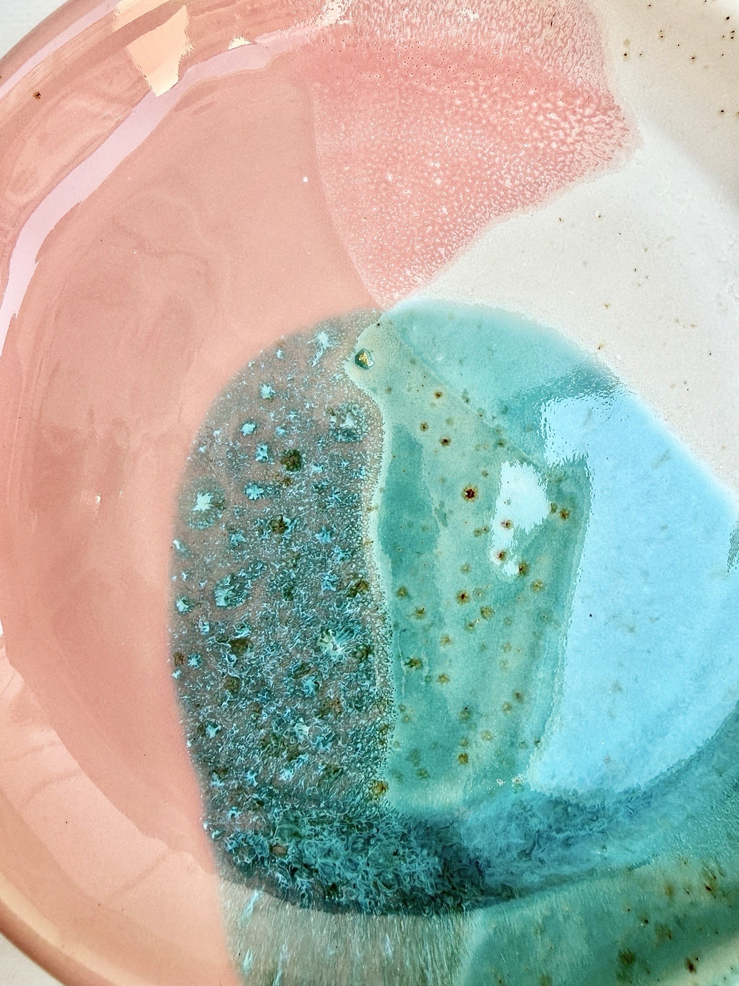 Śliczny, ręcznie wykonany talerzyk MARSHMALLOW. Białe, niebieskie i jasnoróżowe szkliwo przenikają się tworząc wręcz malarski efekt. Talerzyk ma delikatnie podniesiony rant, co nadaje mu nowoczesnego charakteru.