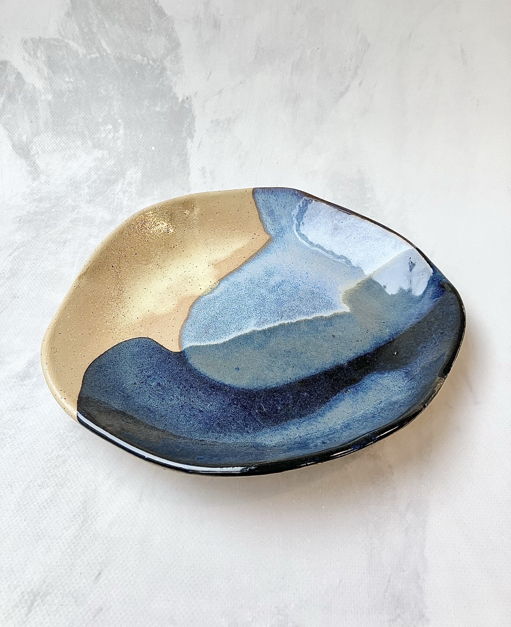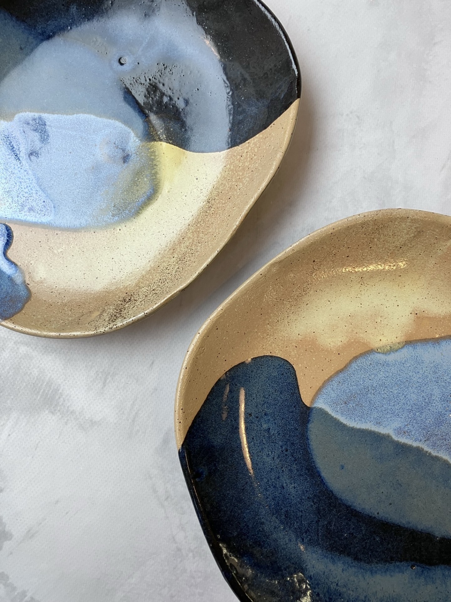 Głębokie granaty i błękity przeplatają się z ciepłymi odcieniami piasku, tworząc harmonijny kontrast światła i cienia. To talerze, które nie tylko podkreślają charakter stołu, ale także wniosą do wnętrza odrobinę spokoju i naturalnej elegancji. Idealne co codziennych obiadów jak i na wyjątkowe okazje.