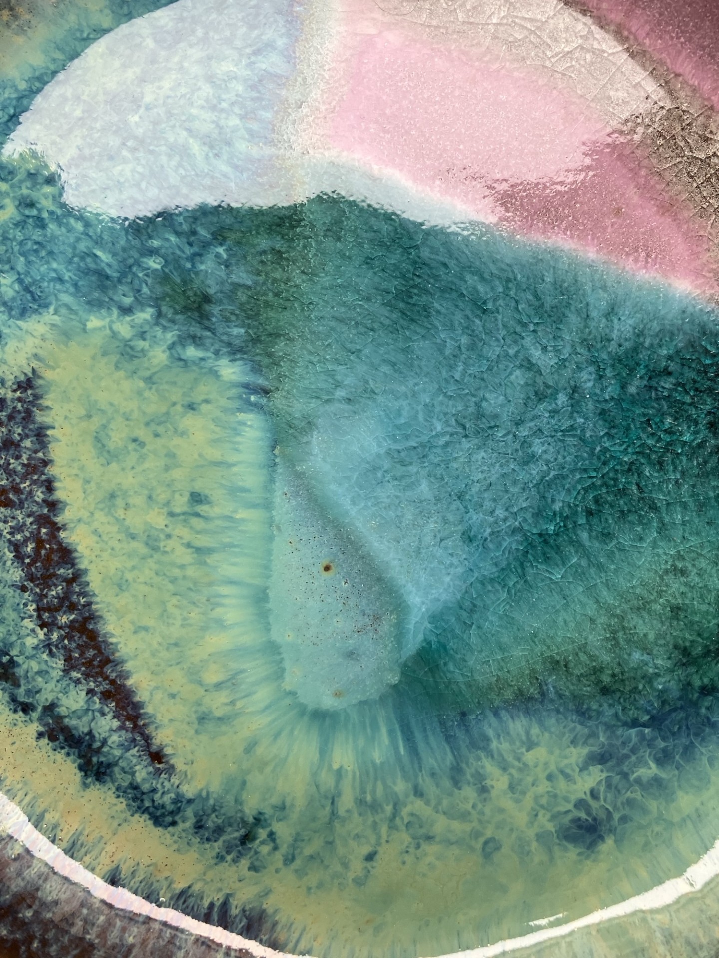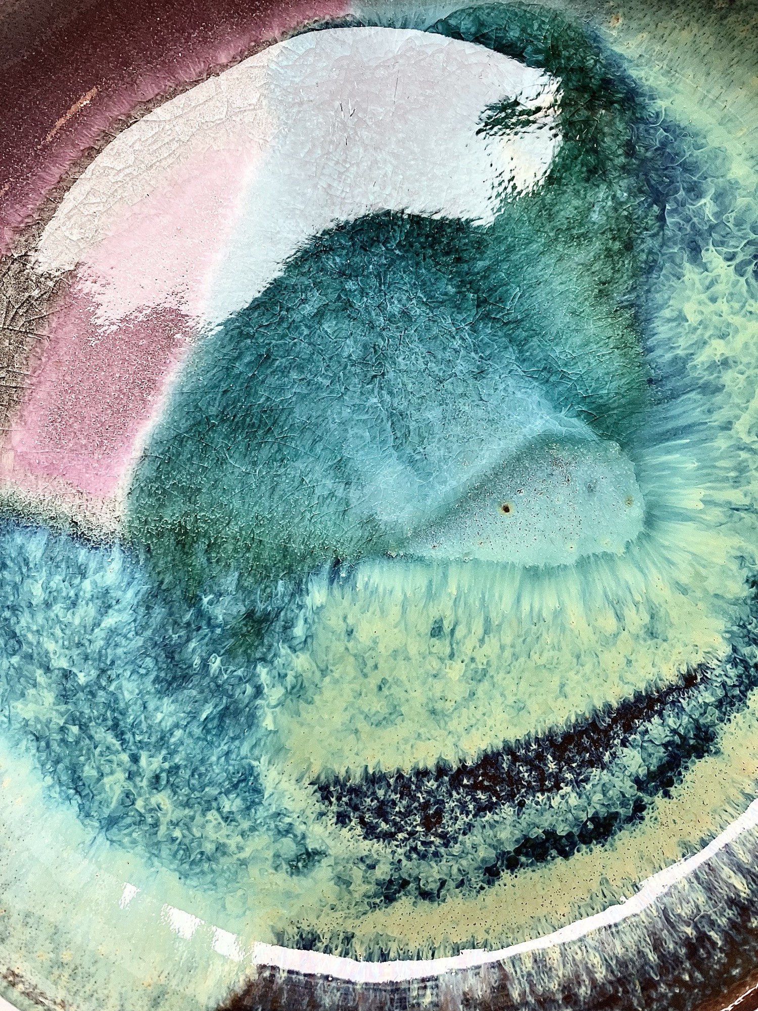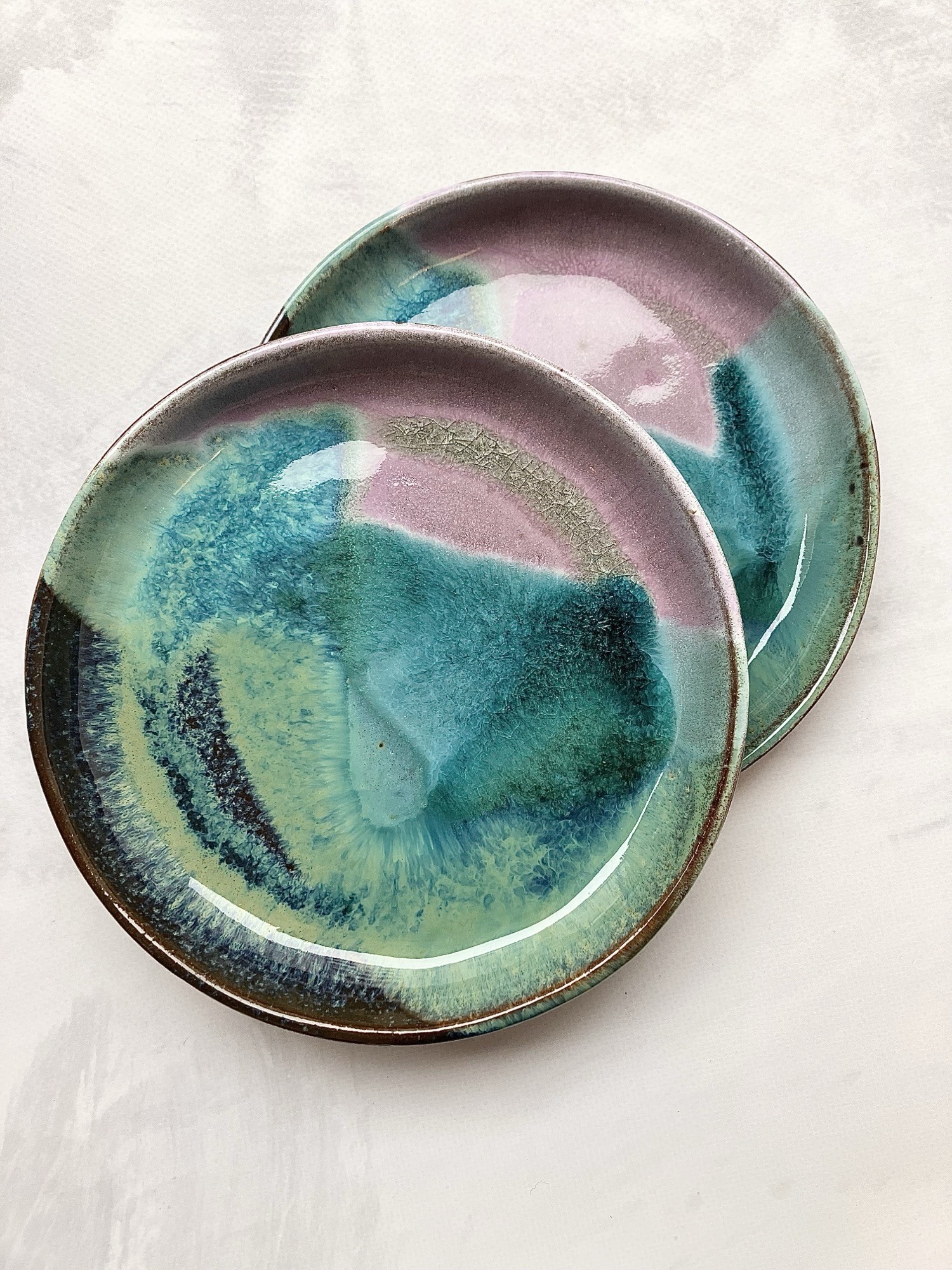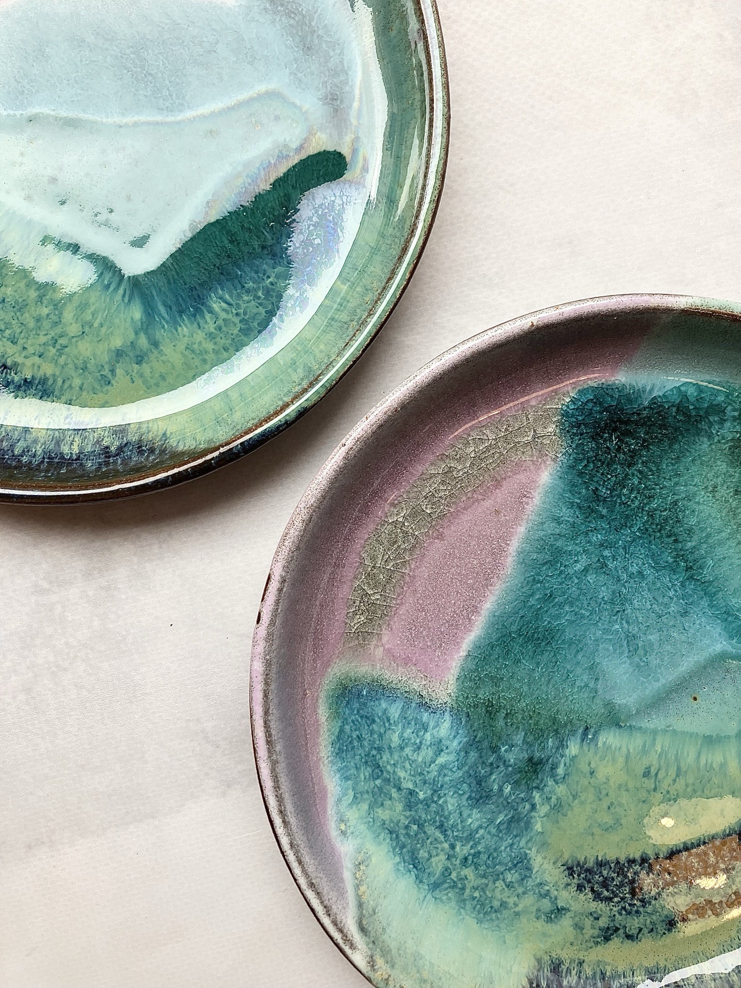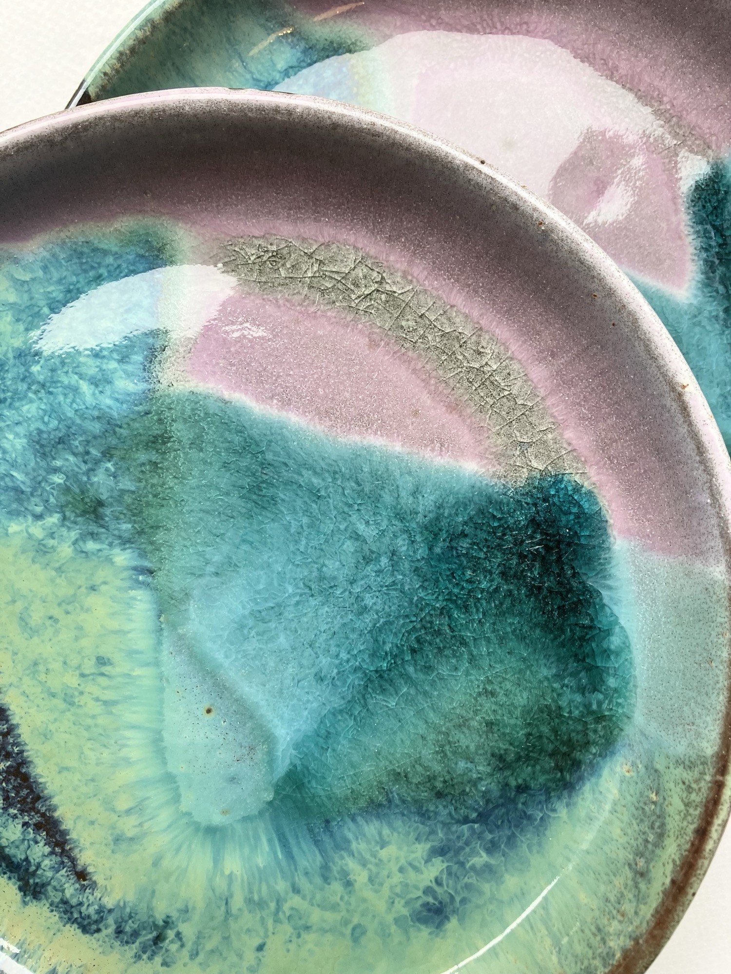 TALERZYK *ORGANIC* z rantem. Głębokie odcienie turkusu tworzą bazę przełamaną akcentami fioletu i granatu, które nadają naczyniu wyjątkowego charakteru inspirowanego naturą. Doskonały wybór dla miłośników naturalnych kolorów i elegancji. Sprawdzi się do podawania deserów, przekąsek lub na twoją ukochaną biżuterię.
