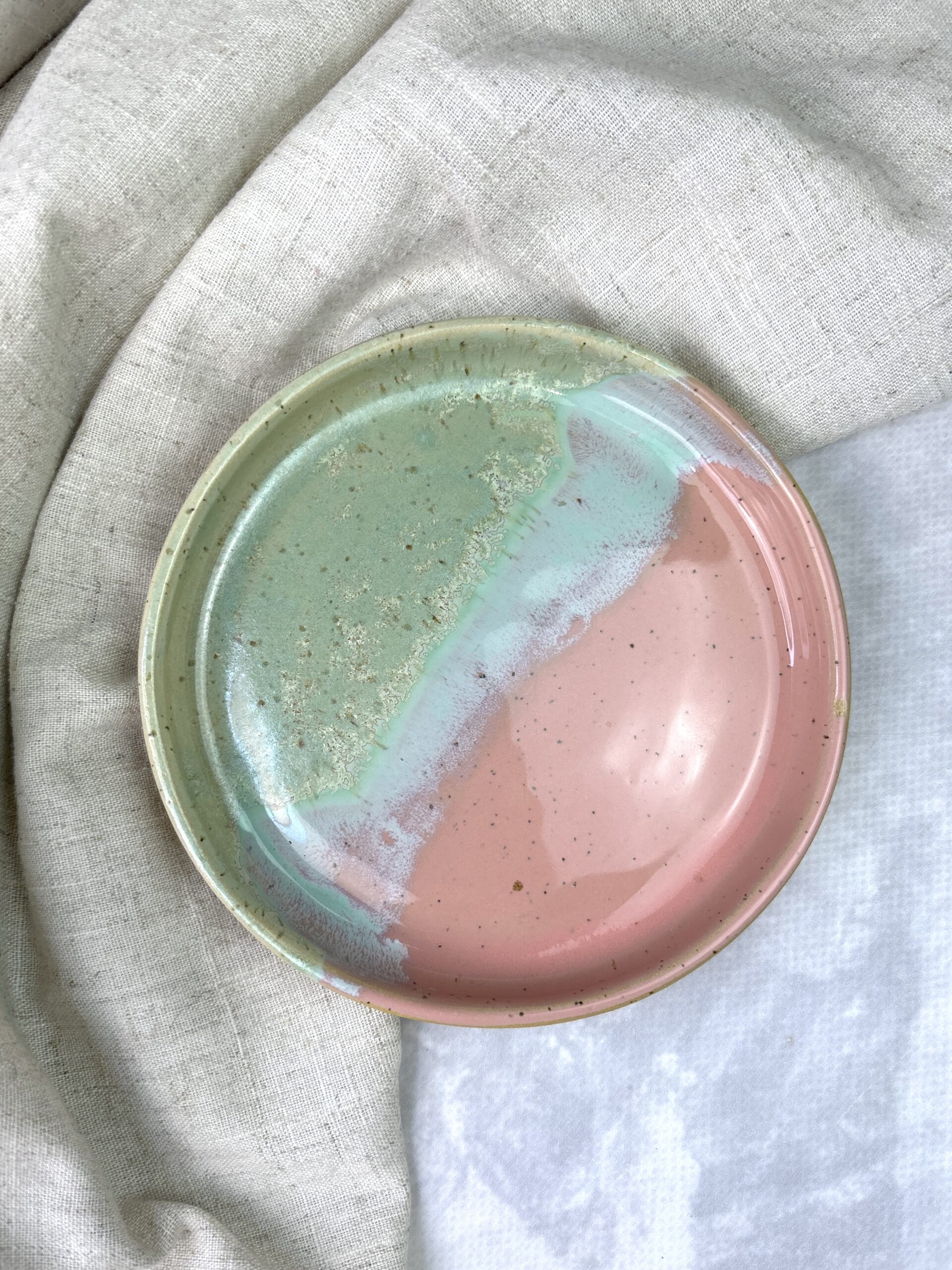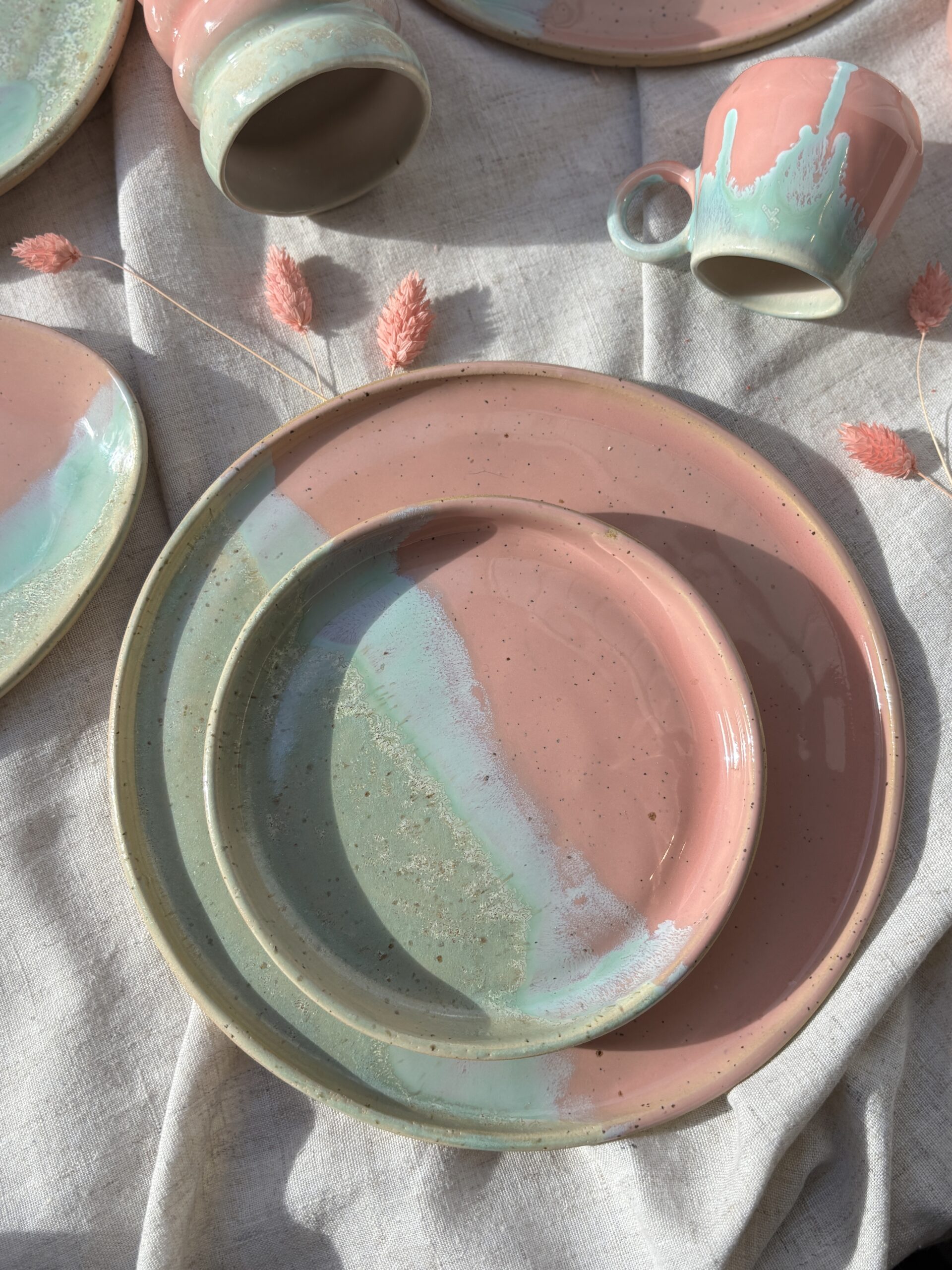 Talerzyk PINK SAND to ceramiczny zapis podróży do miejsc, w których natura maluje najpiękniejsze krajobrazy. Seria ta łączy w sobie delikatność pudrowego różu z energią świeżej, morskiej zieleni, tworząc kojący duet, który wnosi do wnętrza spokój i nowoczesną elegancję.